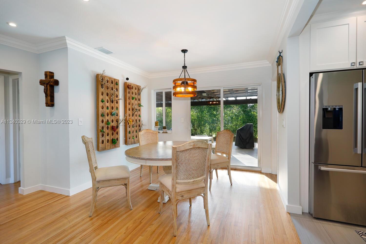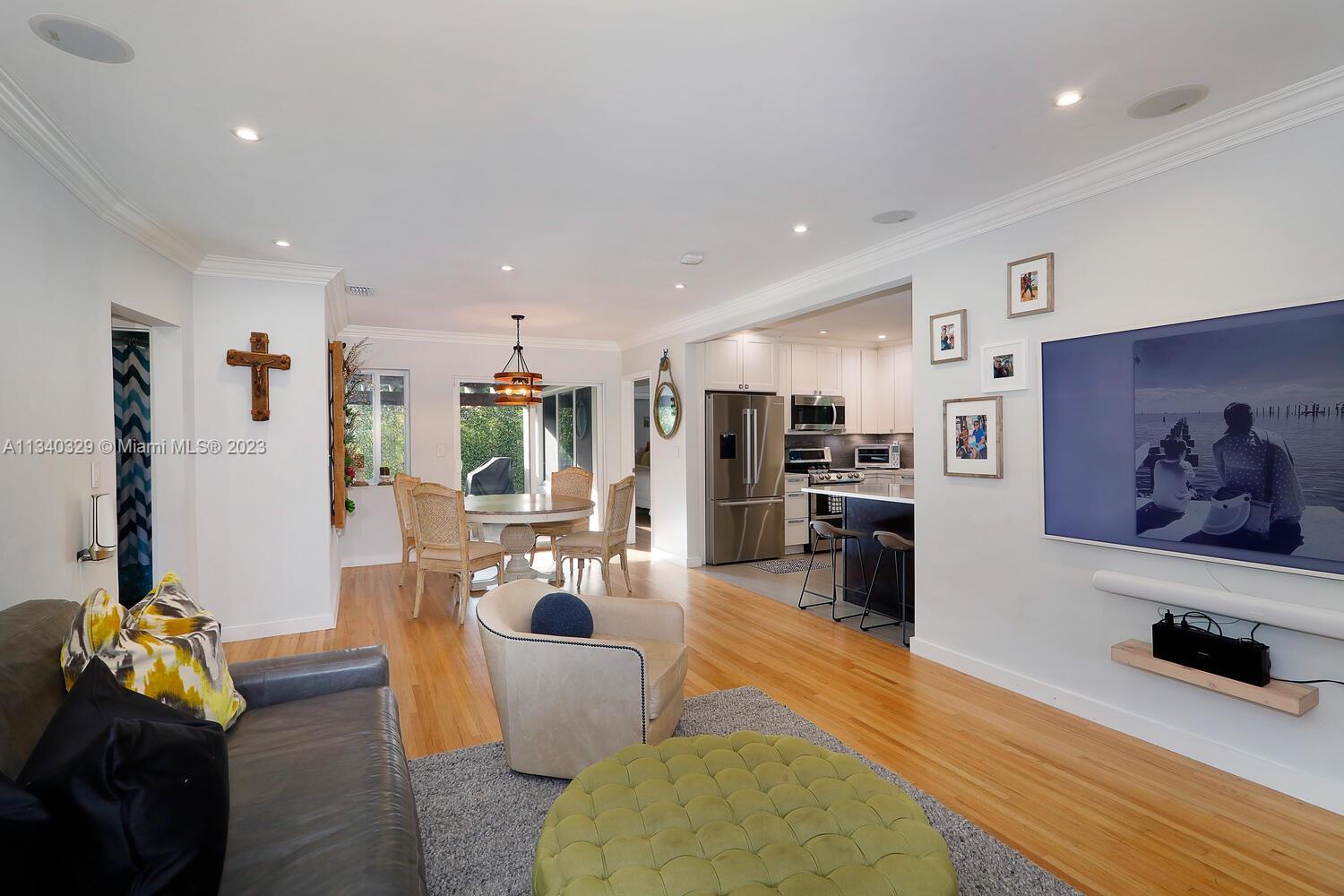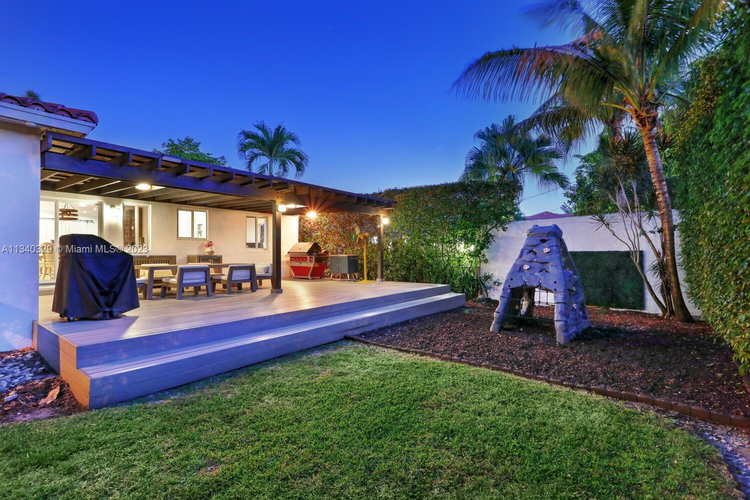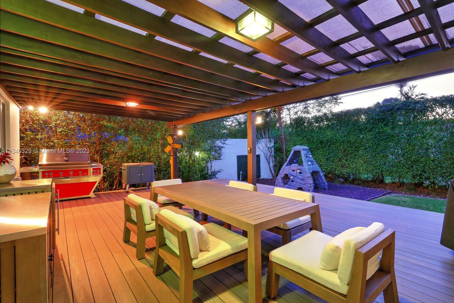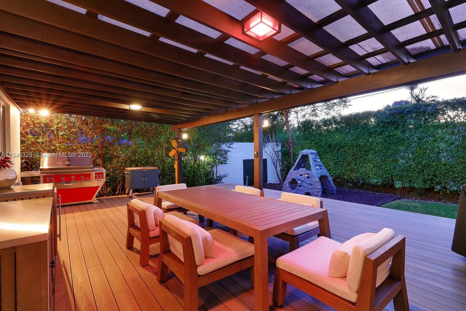 This stunning home in Coral Gables has undergone a modern renovation, making it an ideal choice for discerning buyers. The property includes 3 bedrooms & 2 bathrooms, & is located on a peaceful cul-de-sac. The interior features a recently updated kitchen & bathrooms, as well as hardwood & tile floors, hurricane impact windows, & a 2022 Trane A/C unit equipped with smart sensors, controls & UV light air purifier. In addition to a new electrical panel & tankless water heater, the home comes with brand new appliances, including a washer & dryer. The property's beautiful landscaping in the front & back yards adds to the sophisticated appeal, with the backyard featuring a new pergola & outdoor deck fitted with smart lights, which expands the outdoor living space by an additional 700 sqft.