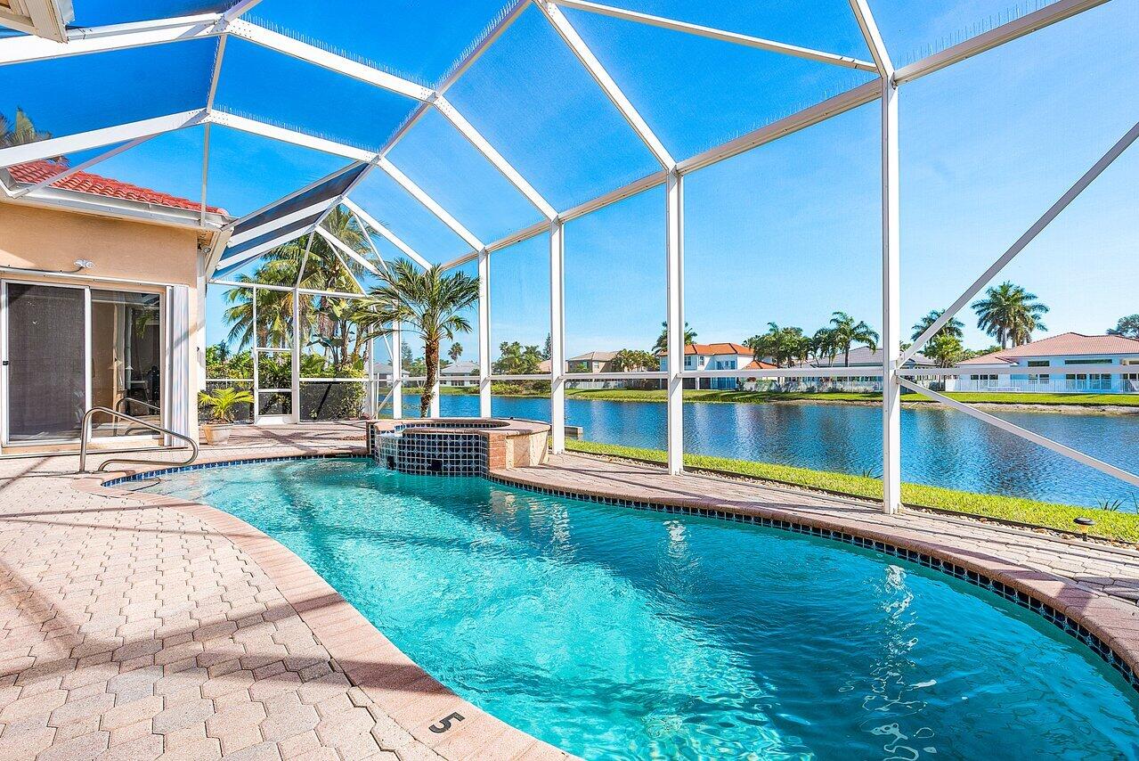 Beautiful 4 Bedroom one story home in The Shores of Boca Raton. Sited on an oversized private lake lot, this home is not to be missed. Featuring a 3 way split floor plan with an open concept that flows effortlessly. The easement offers extra space between neighbors and the long lake view creates the perfect setting for the South Florida Lifestyle. Featuring a brand new roof and gutters completed in January 2023. The screened in heated pool and spa with an East exposure create incredible picturesque Sunrises. All windows have accordion shutters for hurricane protection. The Primary suite has two walk in closets and a spacious bedroom and bath. The Shores is located just steps from South County Park. Walk or bike to the best schools and parks and the newly renovated clubhouse with a gym,