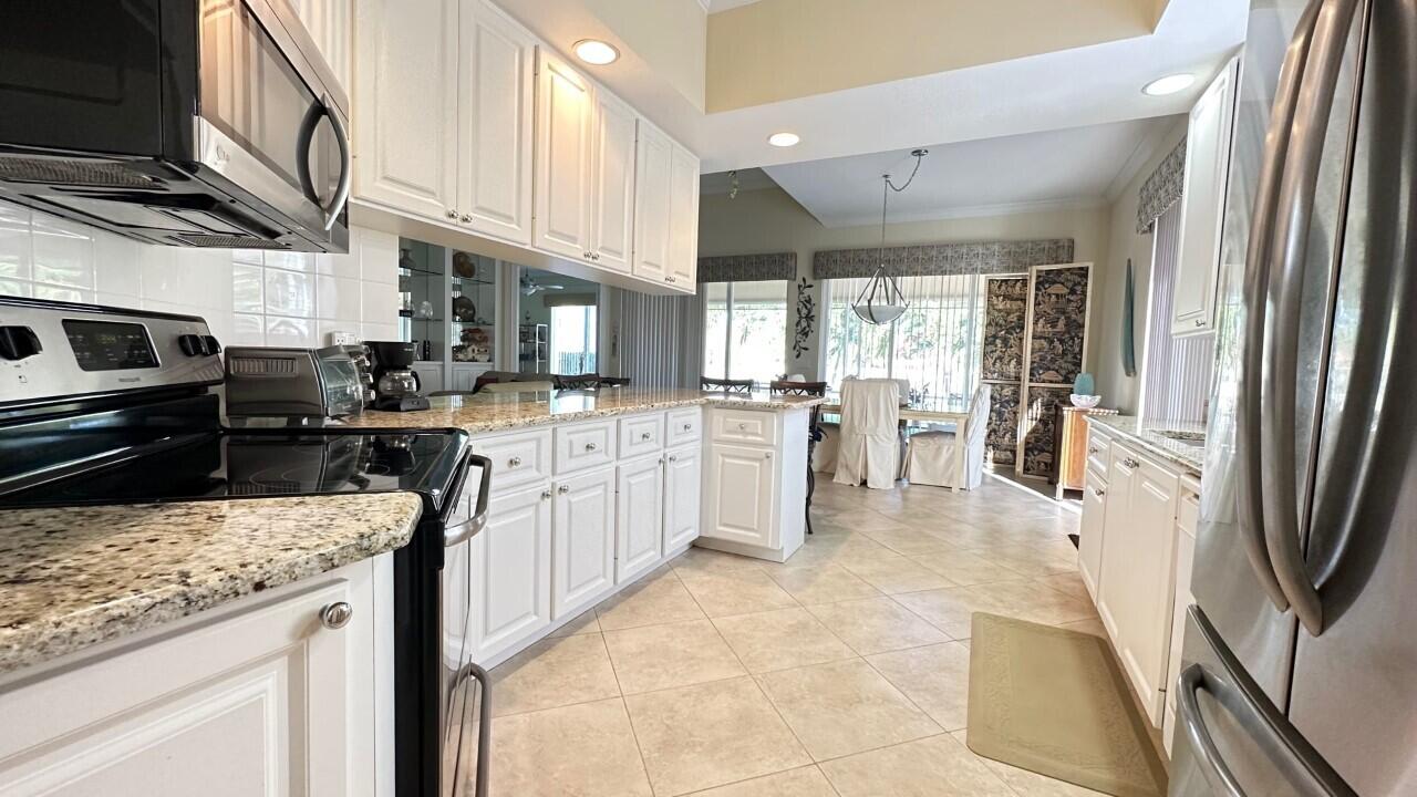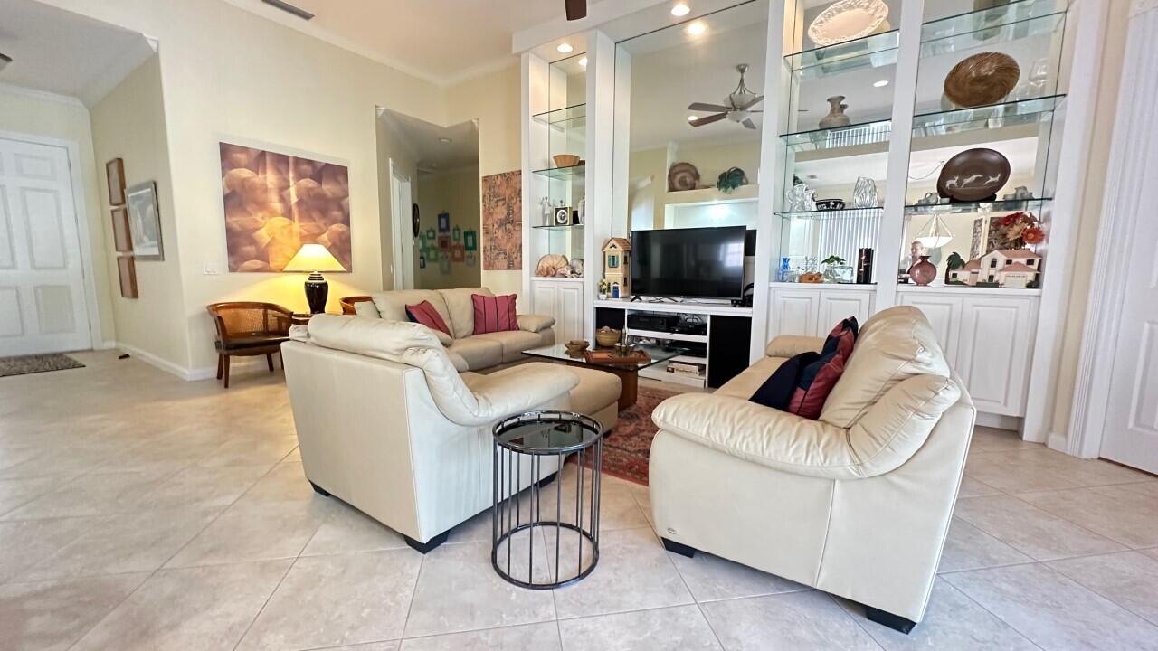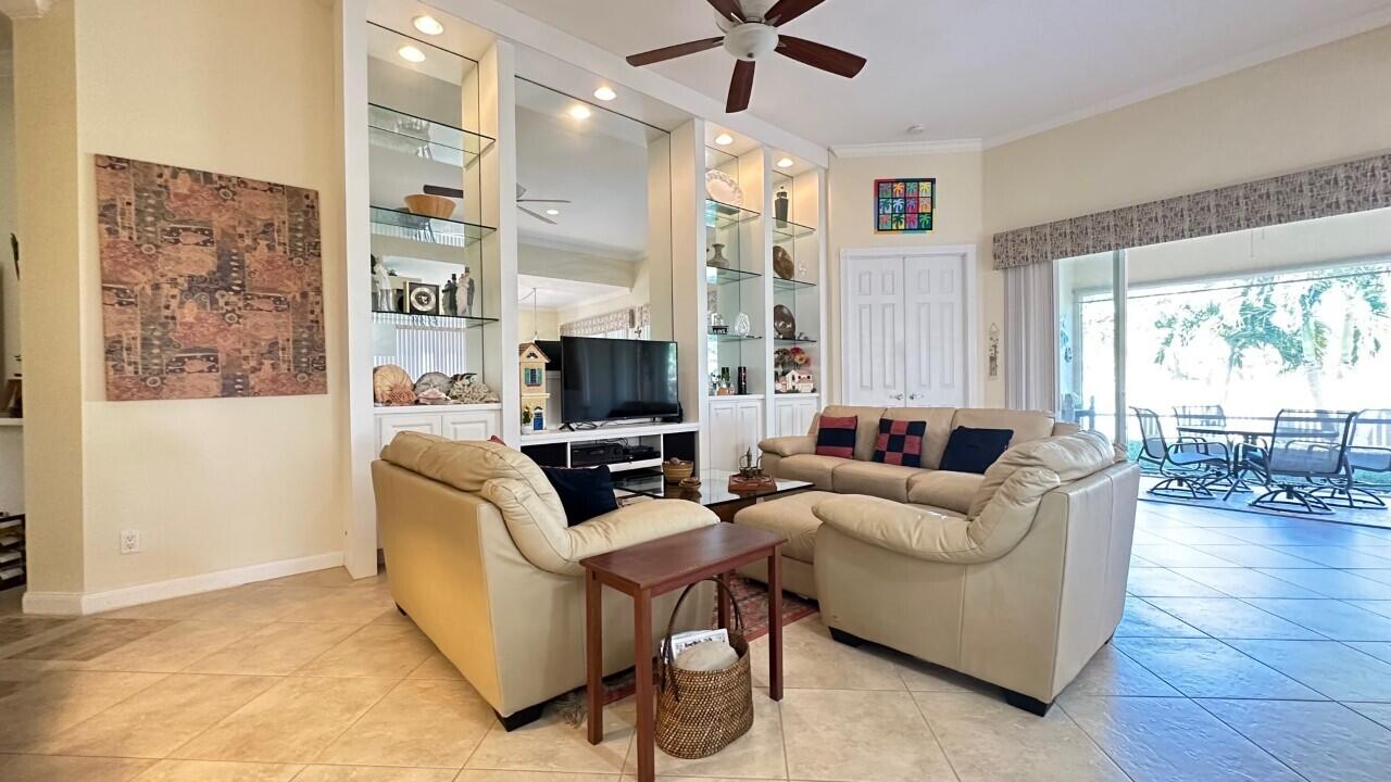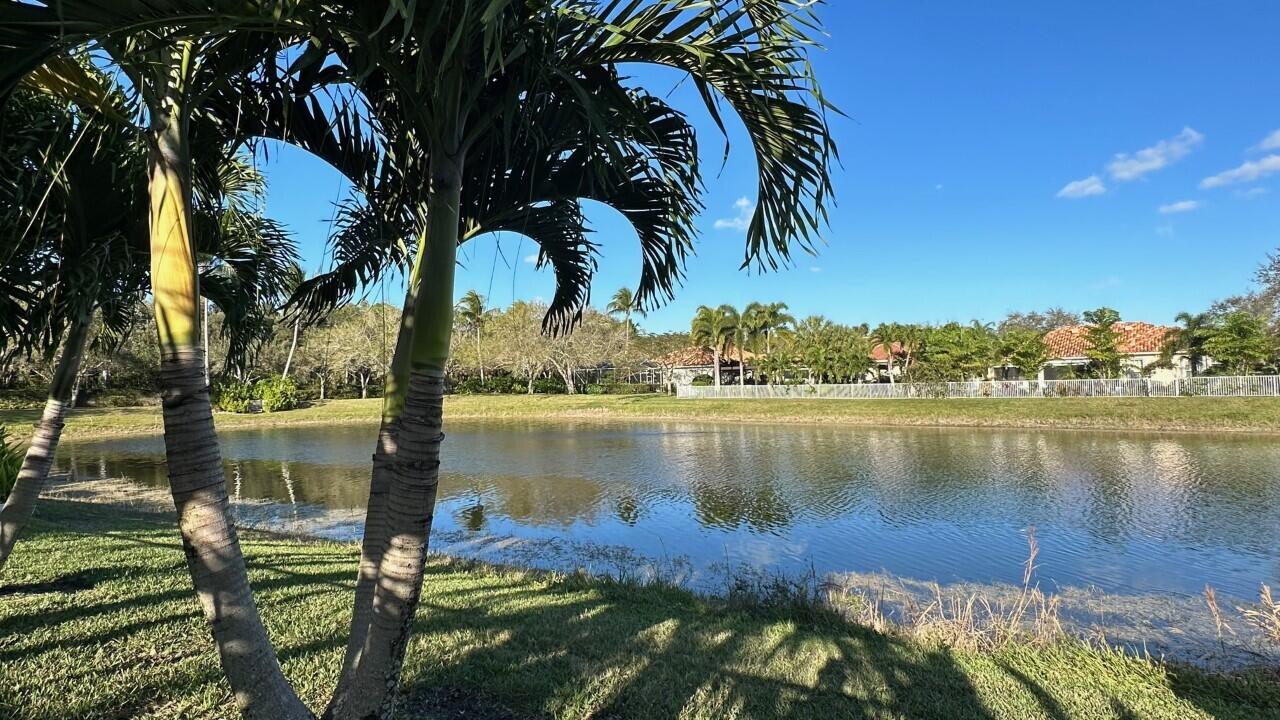 Enjoy the sunrise from an east facing garden overlooking a tranquil lake setting.This well maintained Oakmont model boasts ceramic tile through the main living areas, wood-like flooring in the den and carpet in bedrooms. The Great Room has stunning 12 foot ceilings, floor to ceiling built in wall unit and combines the kitchen, dining and living spaces-excellent for entertaining. The kitchen has updated appliances and granite countertops. The den has built in desk and shelving, The primary bedroom has crown molding, generous closet space plus a double bathroom arrangement - large walk in shower, Roman tub with Jacuzzi,two separate vanities. The guest bedrooms are split from the primary offering plenty of privacy.