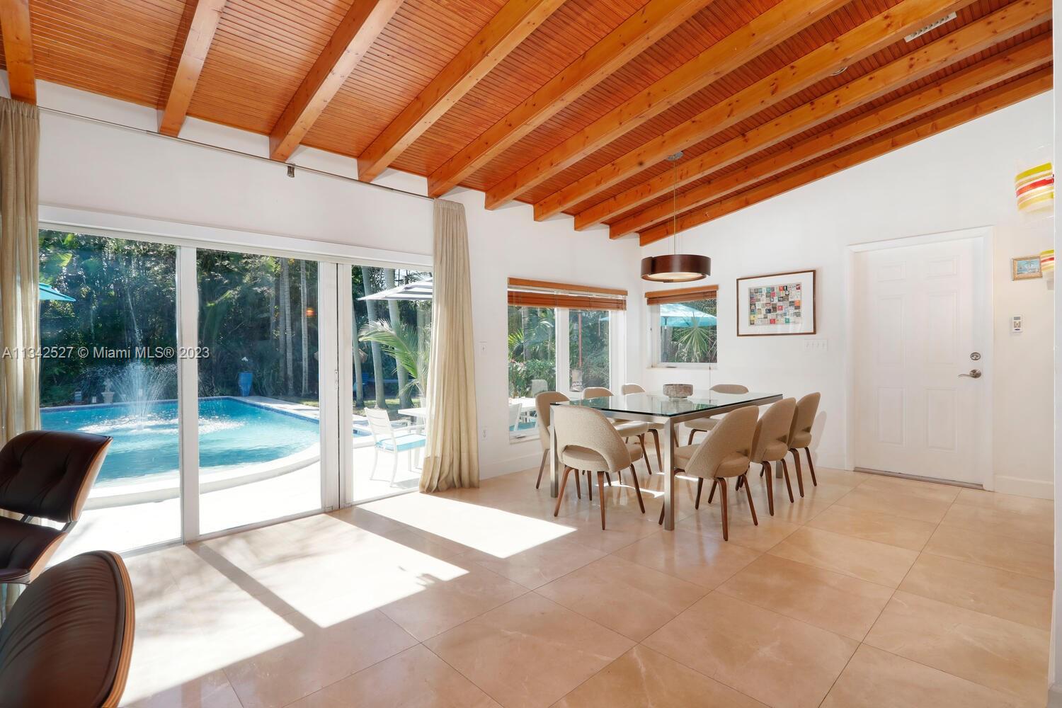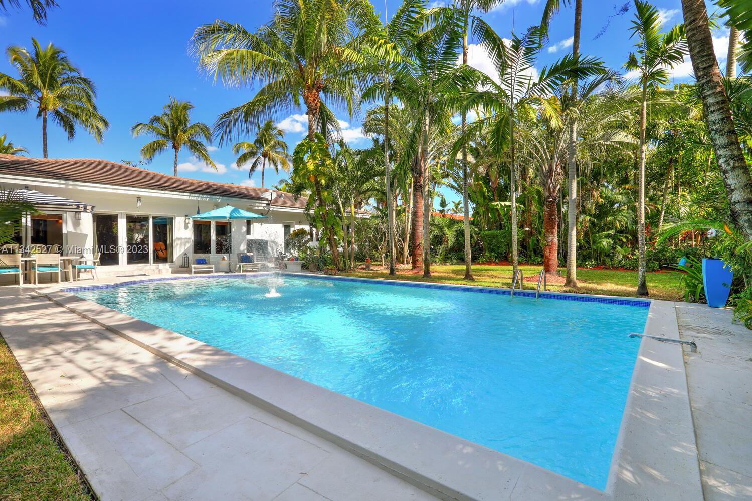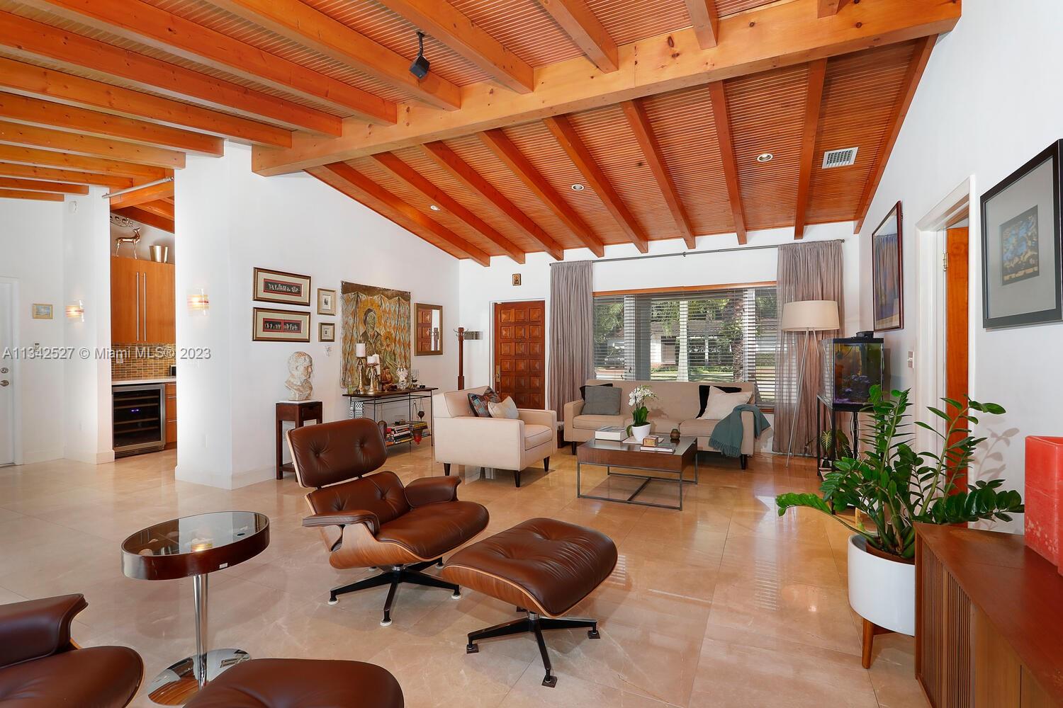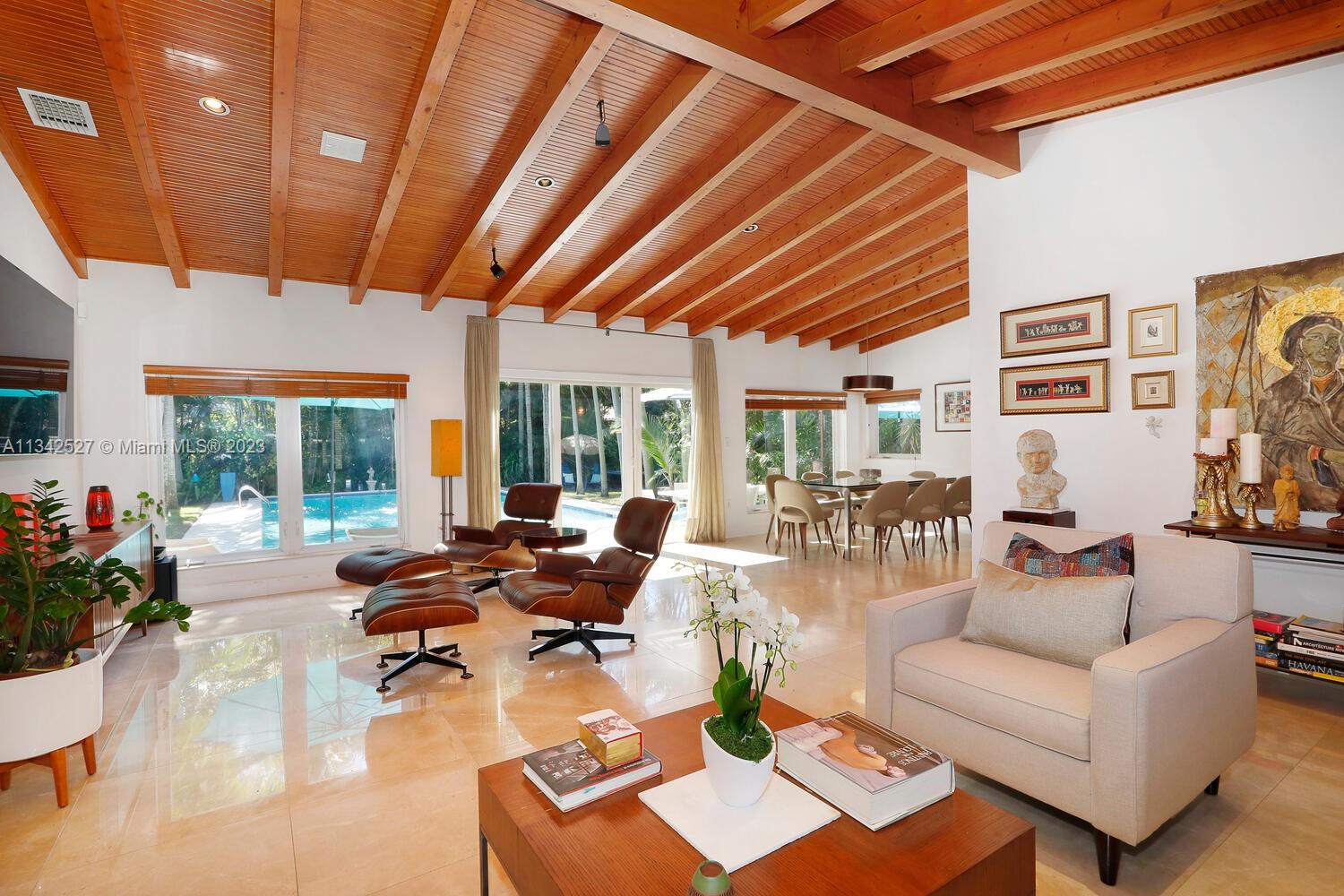 Lovely Bermuda-style inspired home set on large 12,500 sqft lot with lush tropical landscaping surrounding 25K gallon saltwater pool, located in the highly coveted South Gables neighborhood. Completely rebuilt in 2005 according to the South Florida Building Code including new roof, impact glass casement windows and doors, and all new interior infrastructure. This beautiful home features open floor light-filled living spaces with cathedral wood ceiling, elegant Crema Marfil marble flooring and stunning views of the pool and secluded garden area. Modern-style kitchen with wood cabinetry, quartz countertop and energy saving stainless steel appliances. Ample land for home expansion. Home features ADT/Ring alarm system with closed circuit cameras and large air conditioned two car garage.
