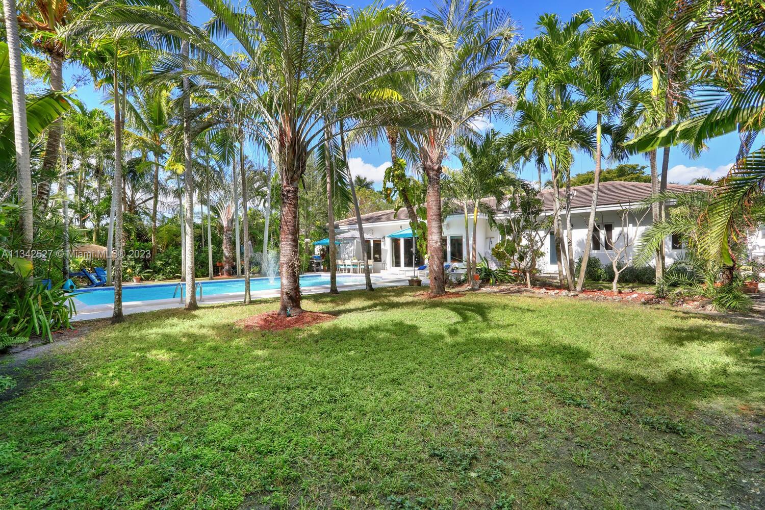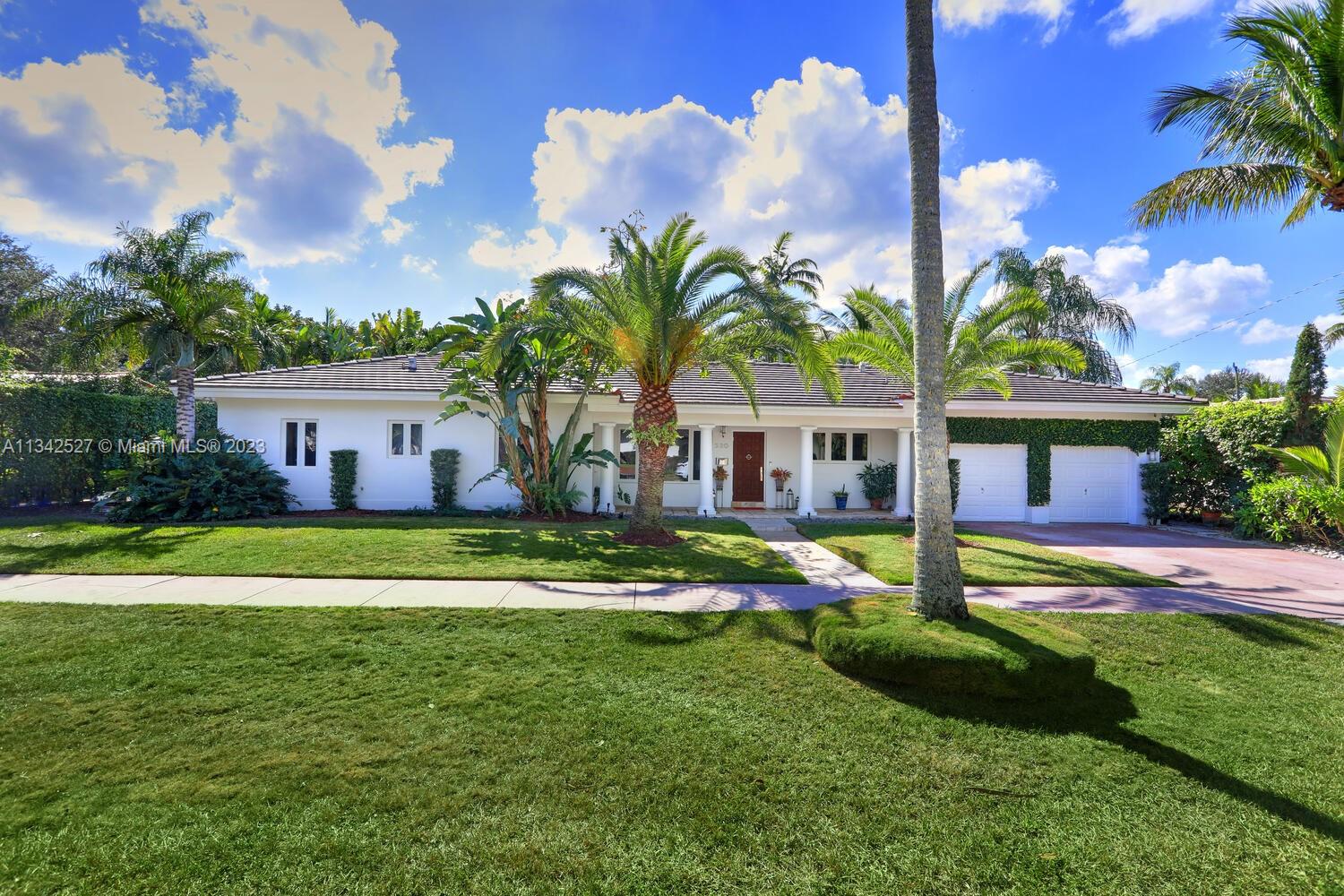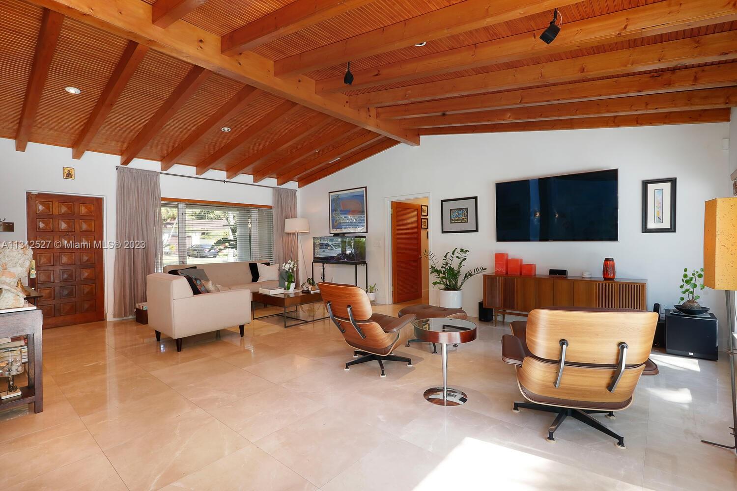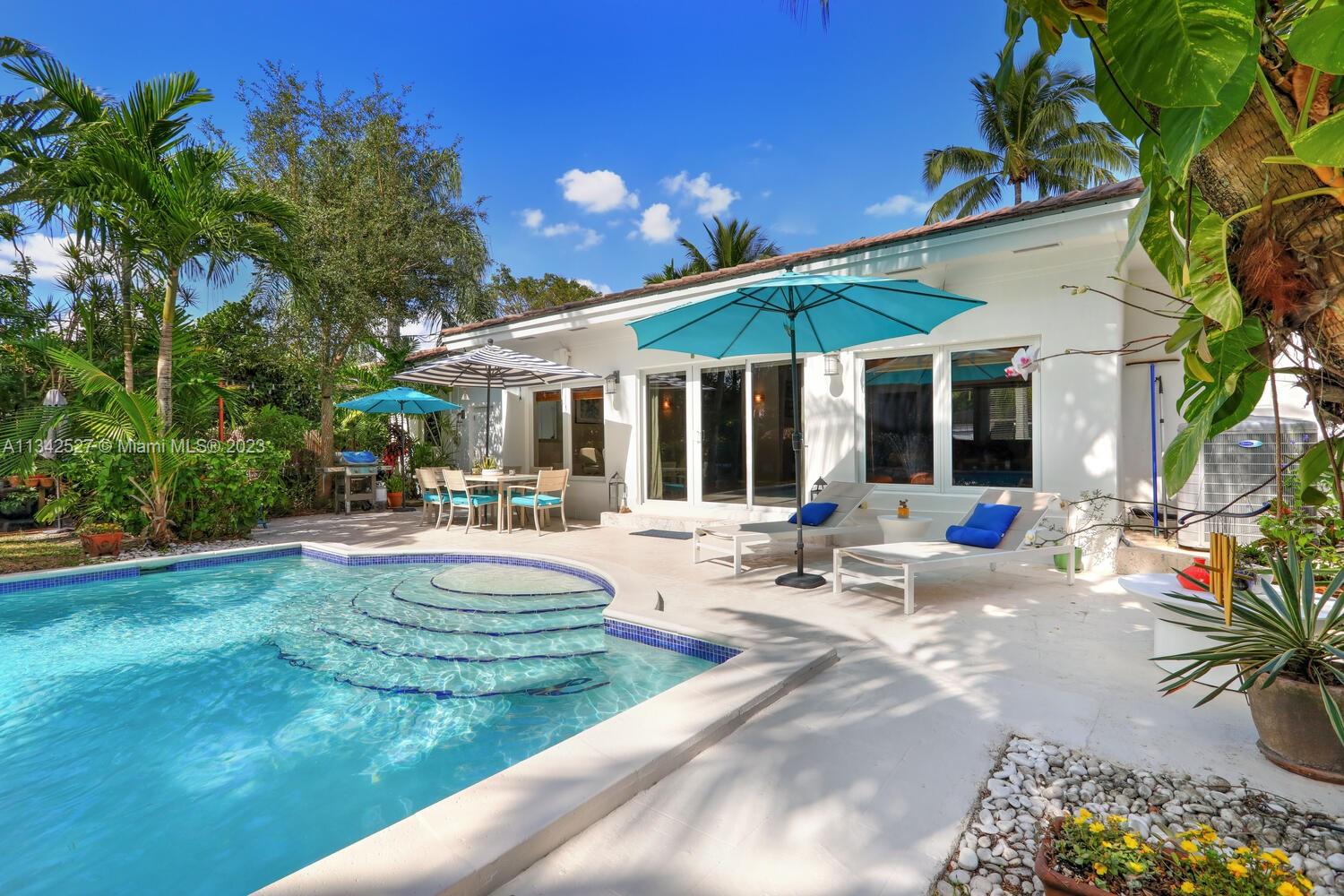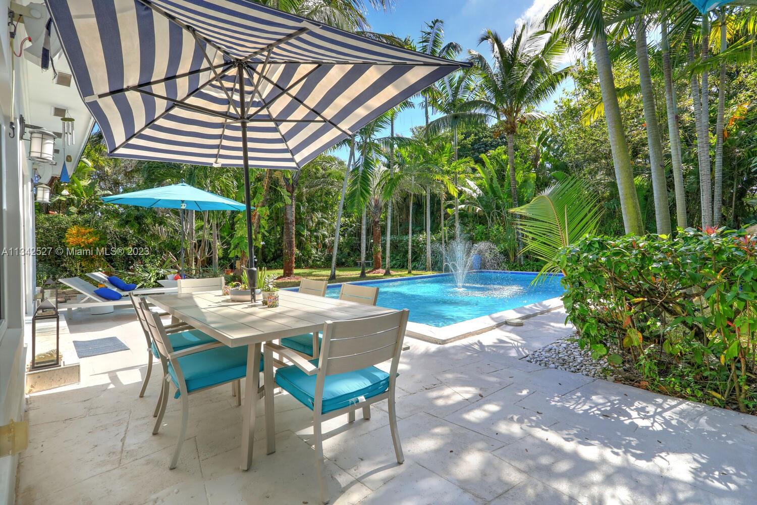 Lovely Bermuda-style inspired home set on large 12,500 sqft lot with lush tropical landscaping surrounding 25K gallon saltwater pool, located in the highly coveted South Gables neighborhood. Completely rebuilt in 2005 according to the South Florida Building Code including new roof, impact glass casement windows and doors, and all new interior infrastructure. This beautiful home features open floor light-filled living spaces with cathedral wood ceiling, elegant Crema Marfil marble flooring and stunning views of the pool and secluded garden area. Modern-style kitchen with wood cabinetry, quartz countertop and energy saving stainless steel appliances. Ample land for home expansion. Home features ADT/Ring alarm system with closed circuit cameras and large air conditioned two car garage.