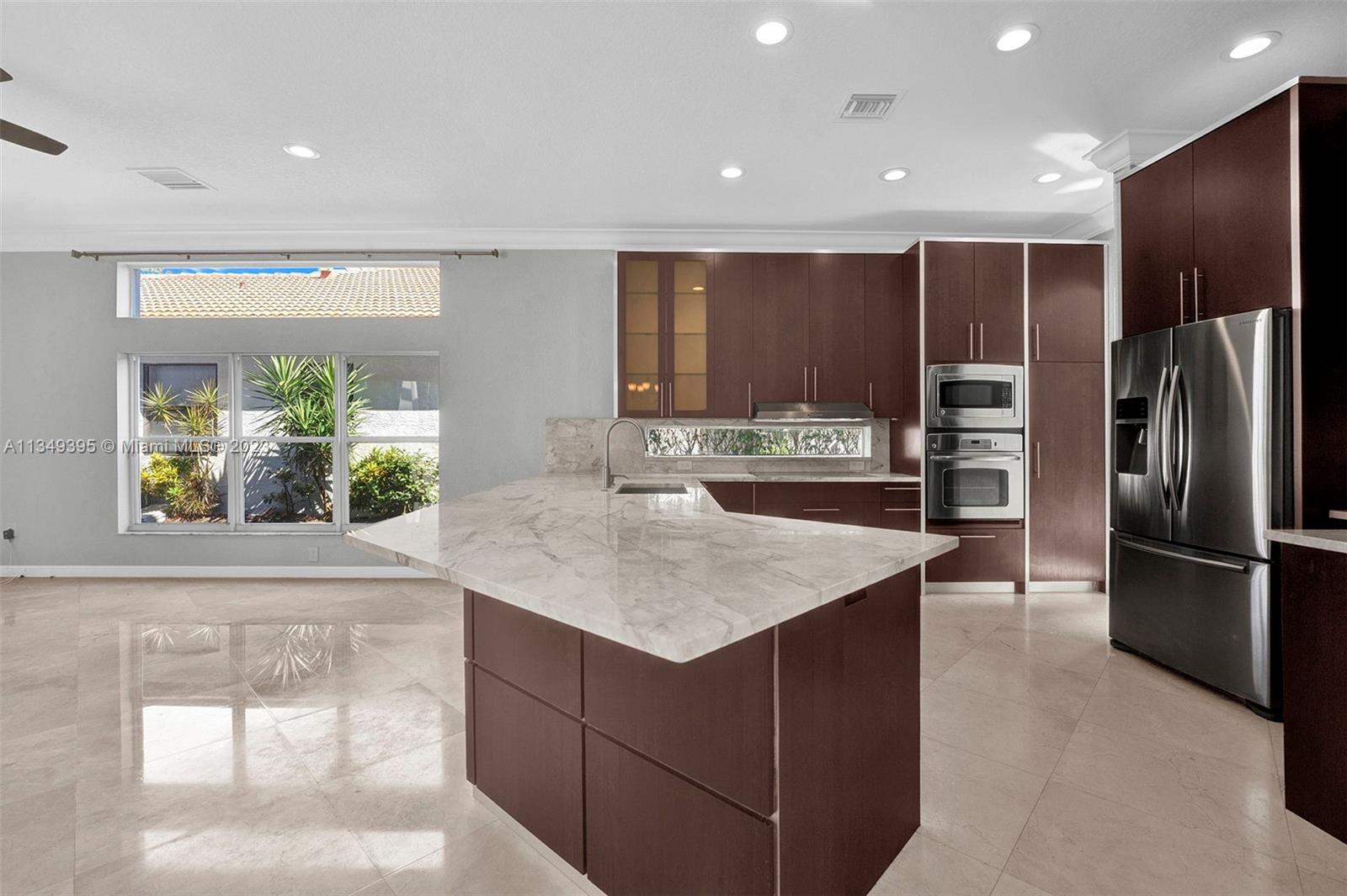 Welcome, Home. Fall in love with this very spacious and inviting 2-story 6 bedroom/.5.5 bath home & guest house, which overlooks the entire screened-in heated pool/spa courtyard. You won't be disappointed. New concrete tile roof, upgraded kitchen with beautiful quartz countertops & backsplash, ss appliances, 24-inch marble flooring downstairs, wood & tile upstairs, newly remodeled bathrooms, and so many beautiful features. Upstairs are 3 bedrooms & Spacious loft area with projector ideal for families to spend time together watching their favorite shows. Master suite downstairs w/ his & hers built-in walk in closets, separate shower and tub. Second bedroom on opposite side of home. Three car garage. Elementary & middle schools 10 min walk from home. Call today. Gated community of Saturnia