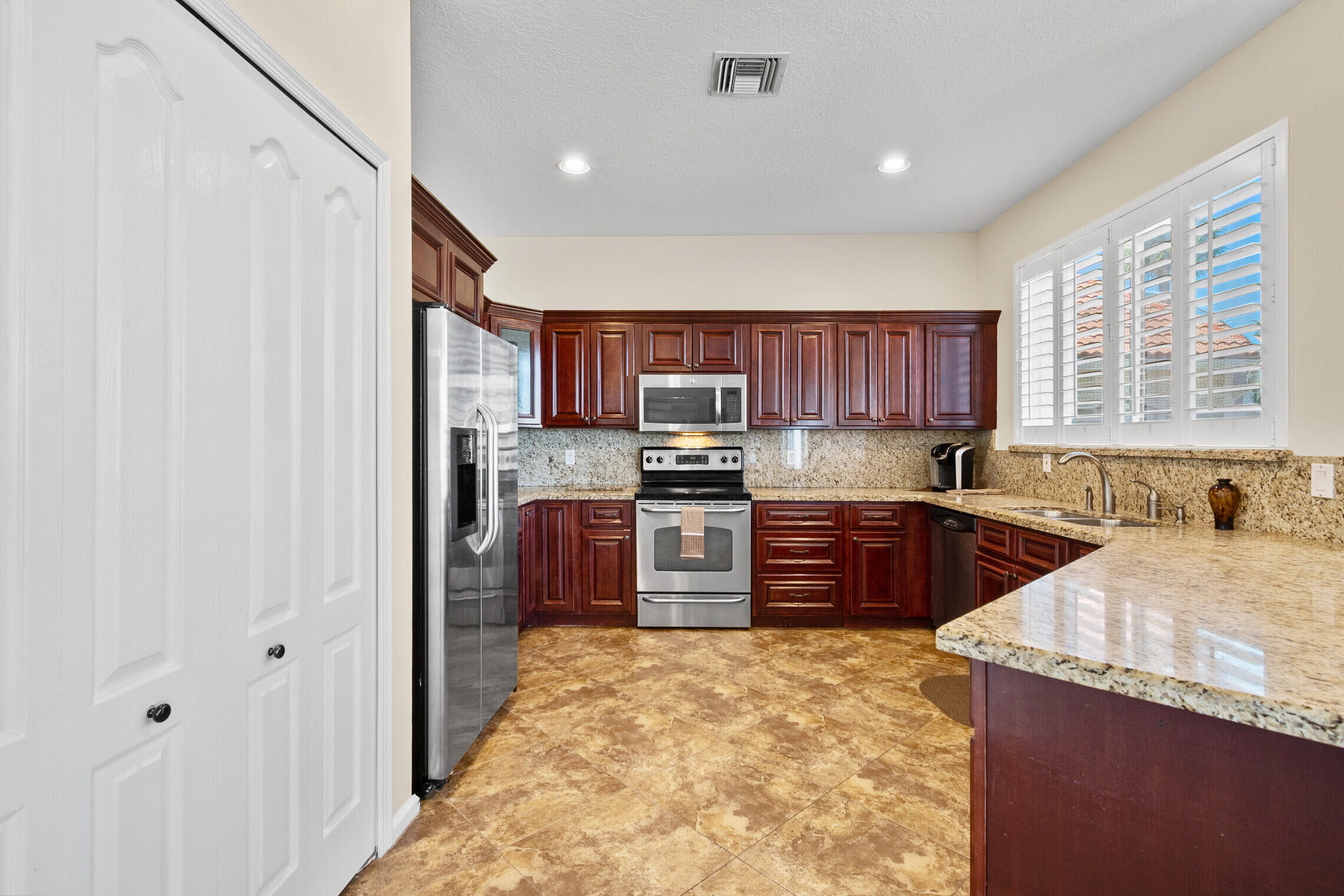 This elegant fully furnished, move-in ready, 5 bedroom 2.5 bath home is located in the beautiful community of Avondale at Bear Lakes. A private gated entrance and thoughtfully landscaped neighborhood invite you into the front yard of 1225 Avondale Lane. Upon entrance, you're warmly greeted by hardwood floors, fresh paint, and a bright and open floor plan seamlessly connecting the dining room, kitchen, and living room. Meticulous attention to detail is presented in the kitchen with custom cabinets, granite countertops, stainless-steel appliances, and a roomy pantry. You'll enjoy the classic elegance of plantation shutters that allow the South Florida sunshine to flood the entire space. Walk outside to your private backyard oasis complete with pool surrounded by Italian travertine deck.