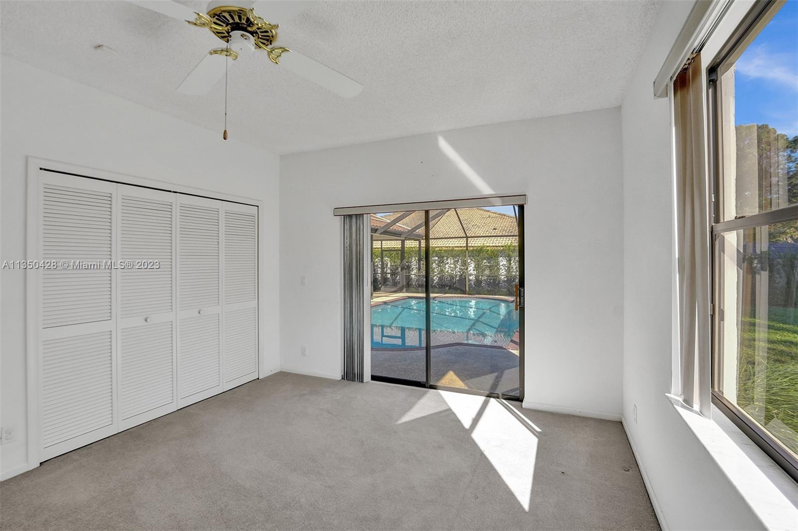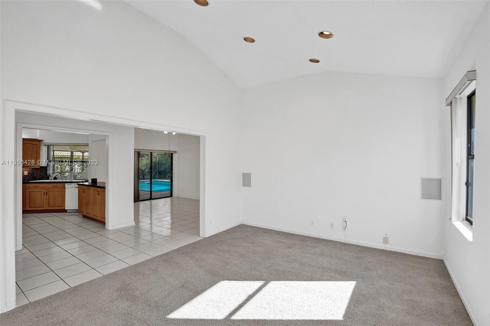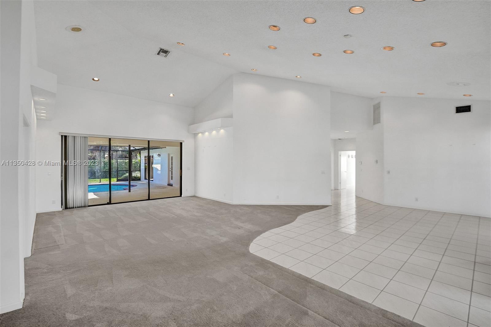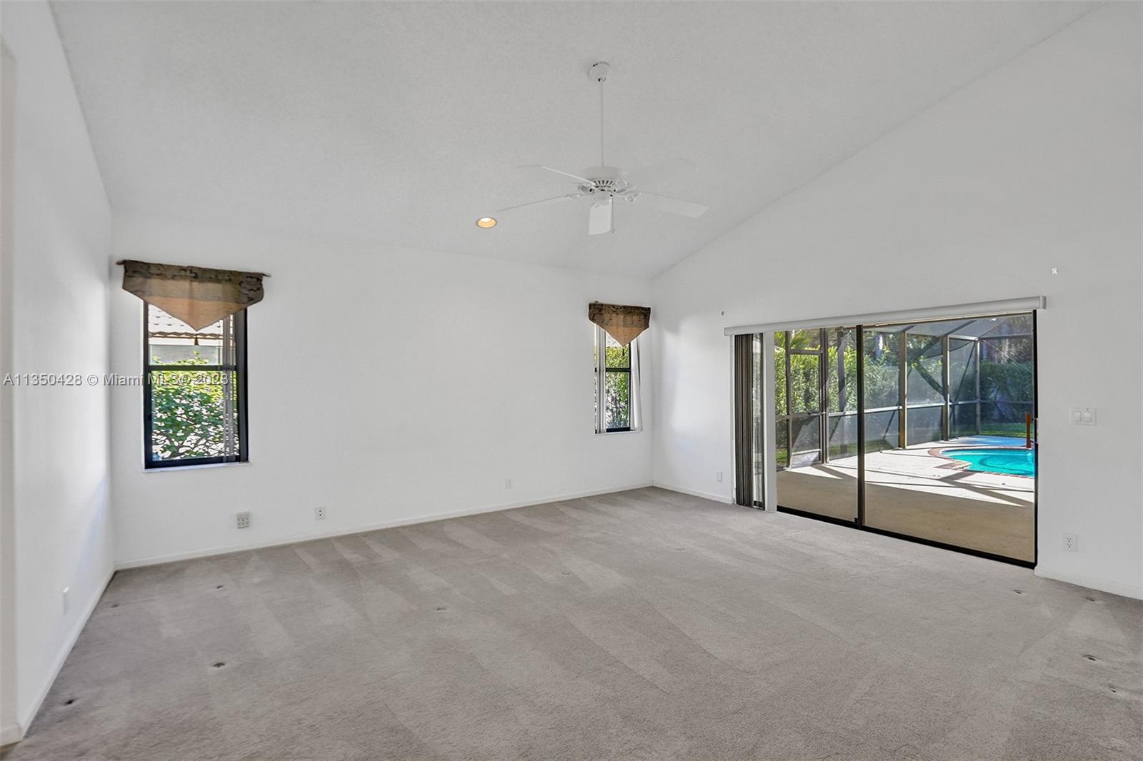 Prestigious CARRIAGE POINTE ESTATE home with 4 bedrooms & 2 bathrooms w/ lovely screened in patio and pool in 24 HOUR GUARD GATED COMMUNITY. Expansive primary suite w/ 2 closets. This already spacious home feels even larger with its vaulted ceilings. Sits on a cul de sac with minimal car activity. Kitchen has solid wood cabinets and granite counter tops w/ tranquil view of pool and backyard. Across from the kitchen is a flex room for family, kids playroom, etc. Both bathrooms have dual sinks. Large windows let in tons of natural light. METAL ROOF that looks like clay tile. AC is 2021. Brand NEW CARPET in 3 rooms. Enjoy pure backyard privacy as the lot backs to Sandy Ridge Preserve. This home was well cared for and clean as a whistle and ready for you to make it your own.