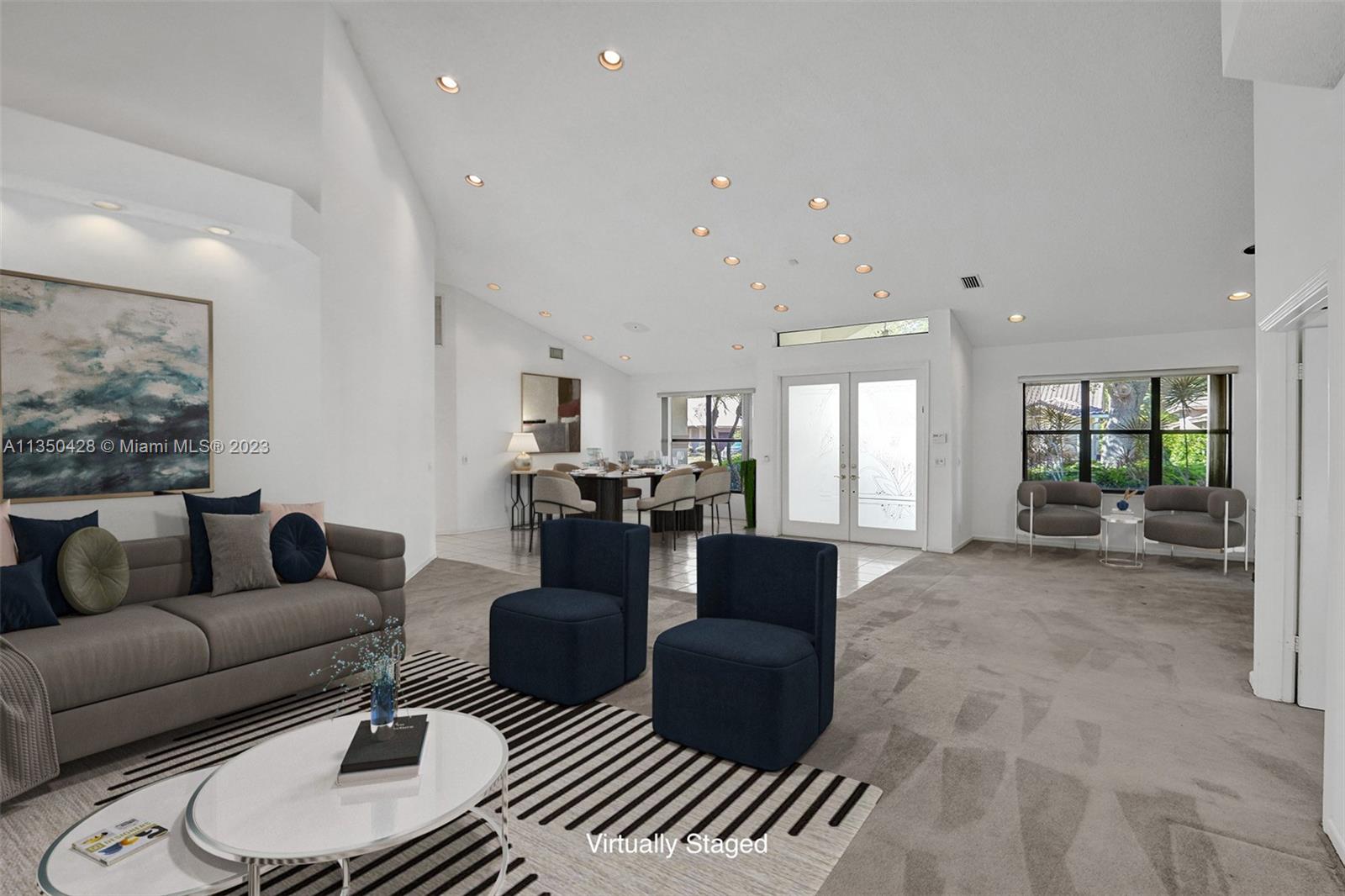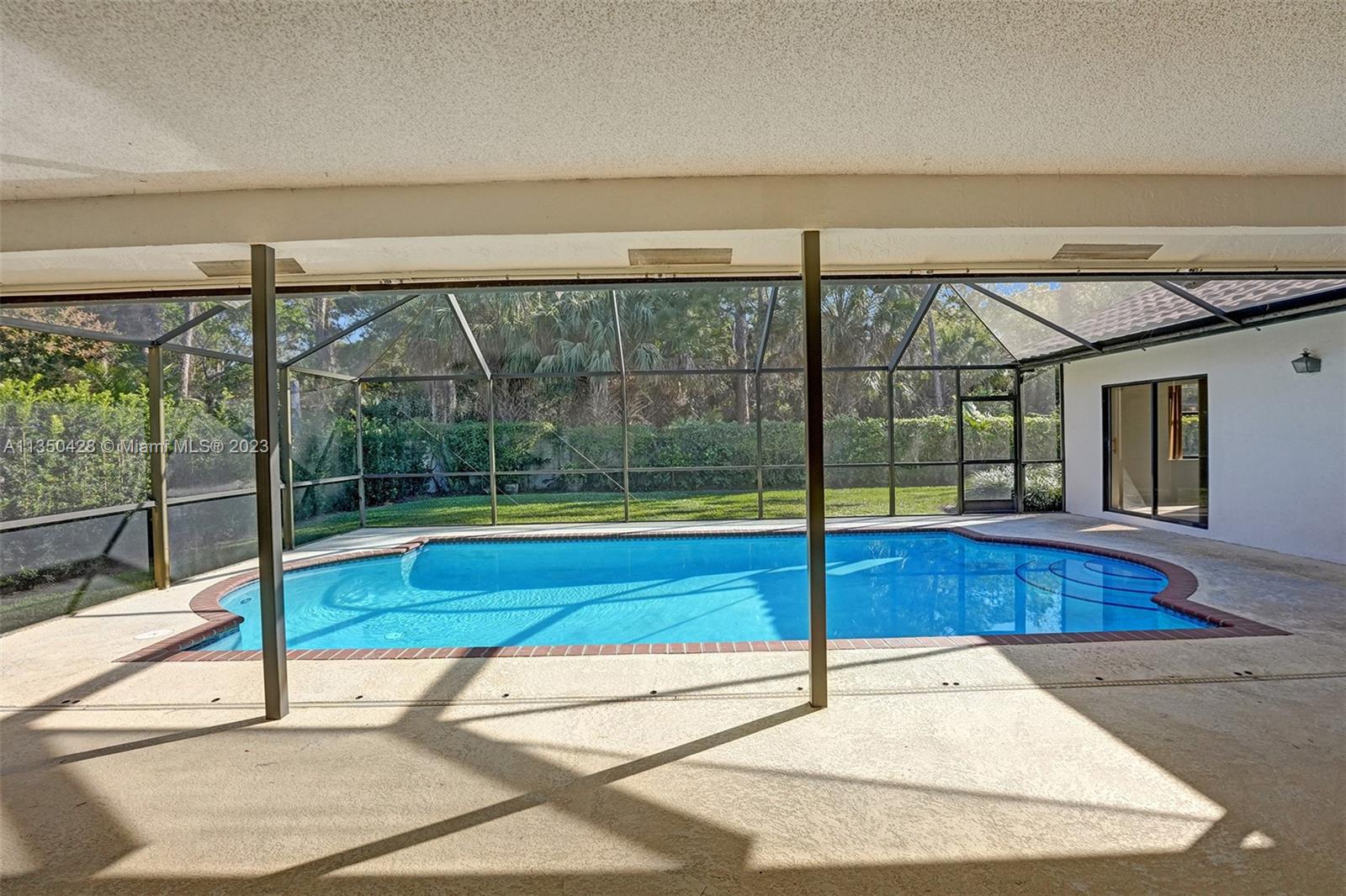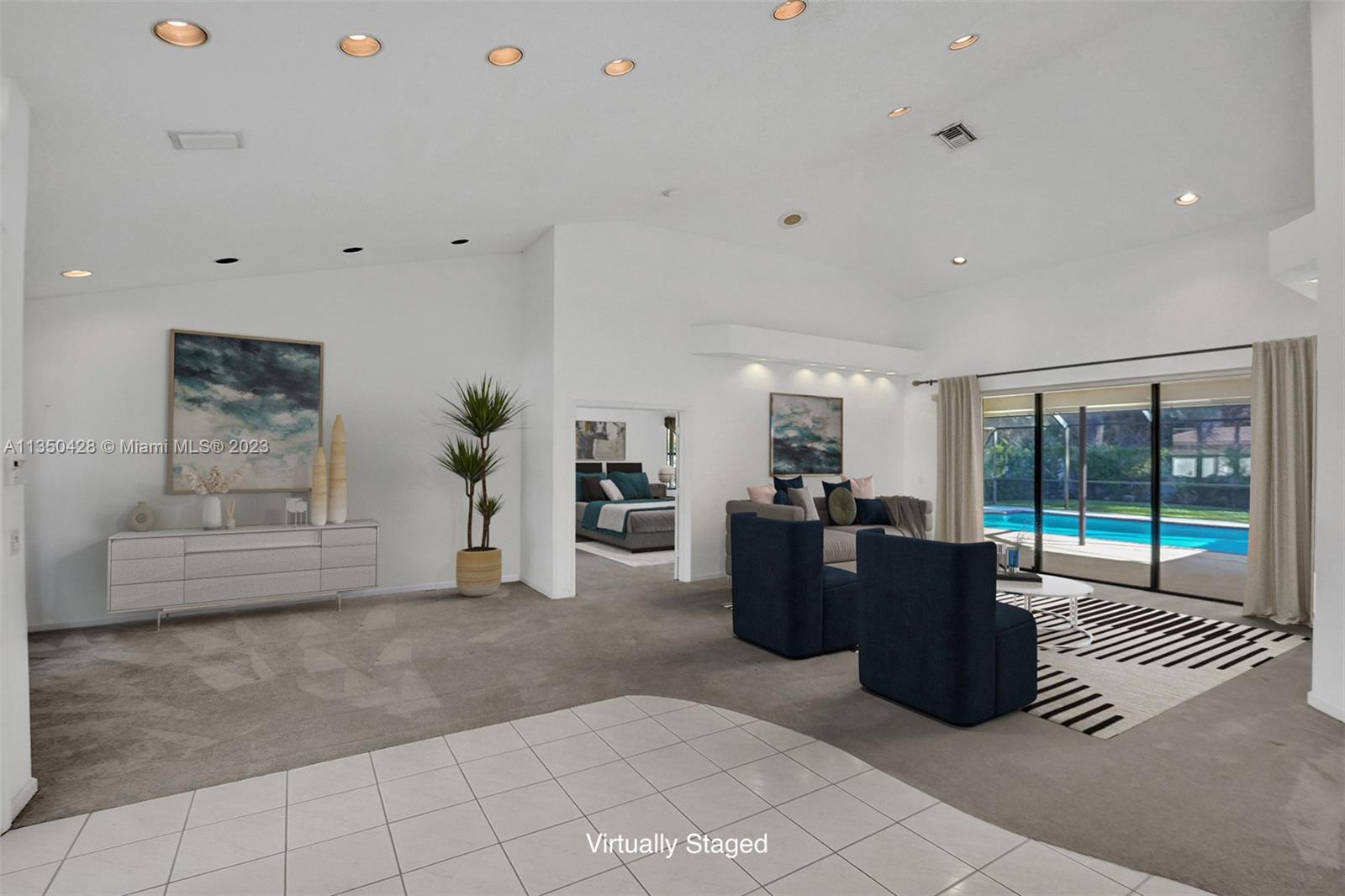 Prestigious CARRIAGE POINTE ESTATE home with 4 bedrooms & 2 bathrooms w/ lovely screened in patio and pool in 24 HOUR GUARD GATED COMMUNITY. Expansive primary suite w/ 2 closets. This already spacious home feels even larger with its vaulted ceilings. Sits on a cul de sac with minimal car activity. Kitchen has solid wood cabinets and granite counter tops w/ tranquil view of pool and backyard. Across from the kitchen is a flex room for family, kids playroom, etc. Both bathrooms have dual sinks. Large windows let in tons of natural light. METAL ROOF that looks like clay tile. AC is 2021. Brand NEW CARPET in 3 rooms. Enjoy pure backyard privacy as the lot backs to Sandy Ridge Preserve. This home was well cared for and clean as a whistle and ready for you to make it your own.