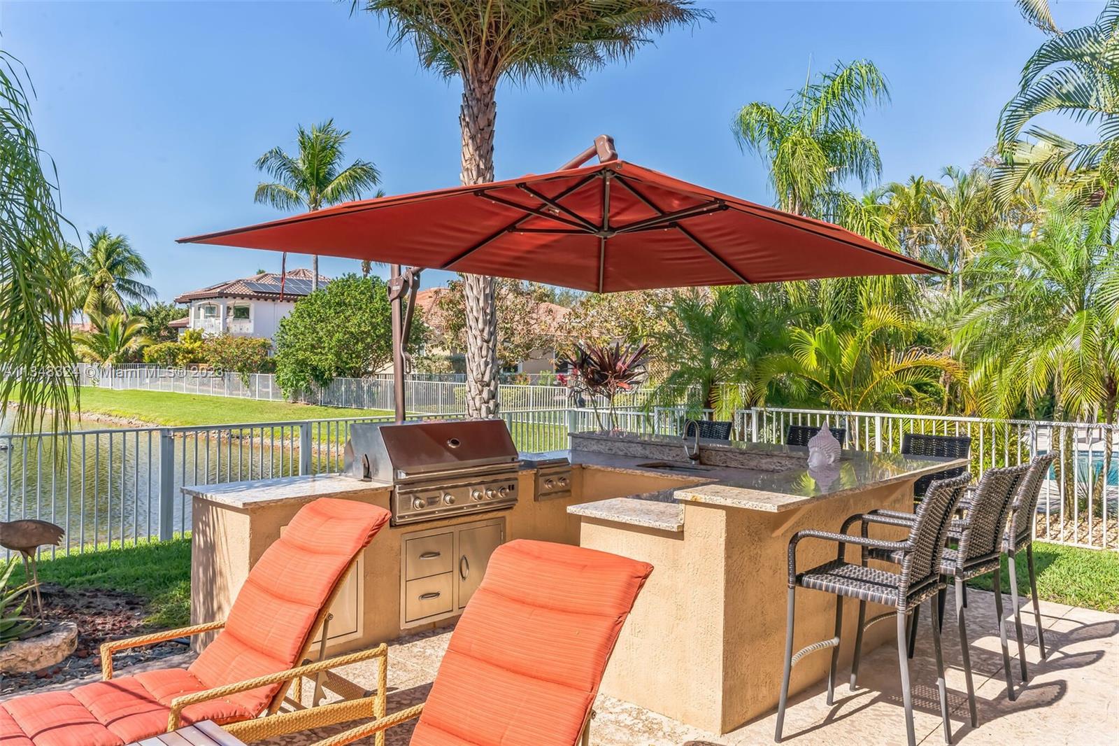 Experience the epitome of luxury in this 4 bedroom, 3 full bath home w/ BRAND NEW 2021 ROOF, offering breathtaking views of your heated resort-size pool, raised spa, and waterfront Florida lifestyle. This one story boasts triple split layout, ensuring that everyone has their own space to relax and unwind. Designed with comfort and style in mind with mother-in-law/teen bedroom and bath. Gourmet kitchen equipped with smart wall oven/air fryer/convection, making meal preparation a breeze. Alternatively, cook up a storm in the outdoor kitchen poolside and relish in the peaceful waterfront luxury. 3-car garage, crown moldings, built-ins, real wood and laminate flooring throughout. Conveniently located in a gated neighborhood, CS/Parkland schools, Don't miss out on this incredible opportunity!