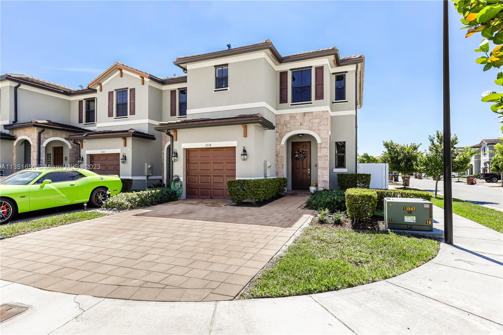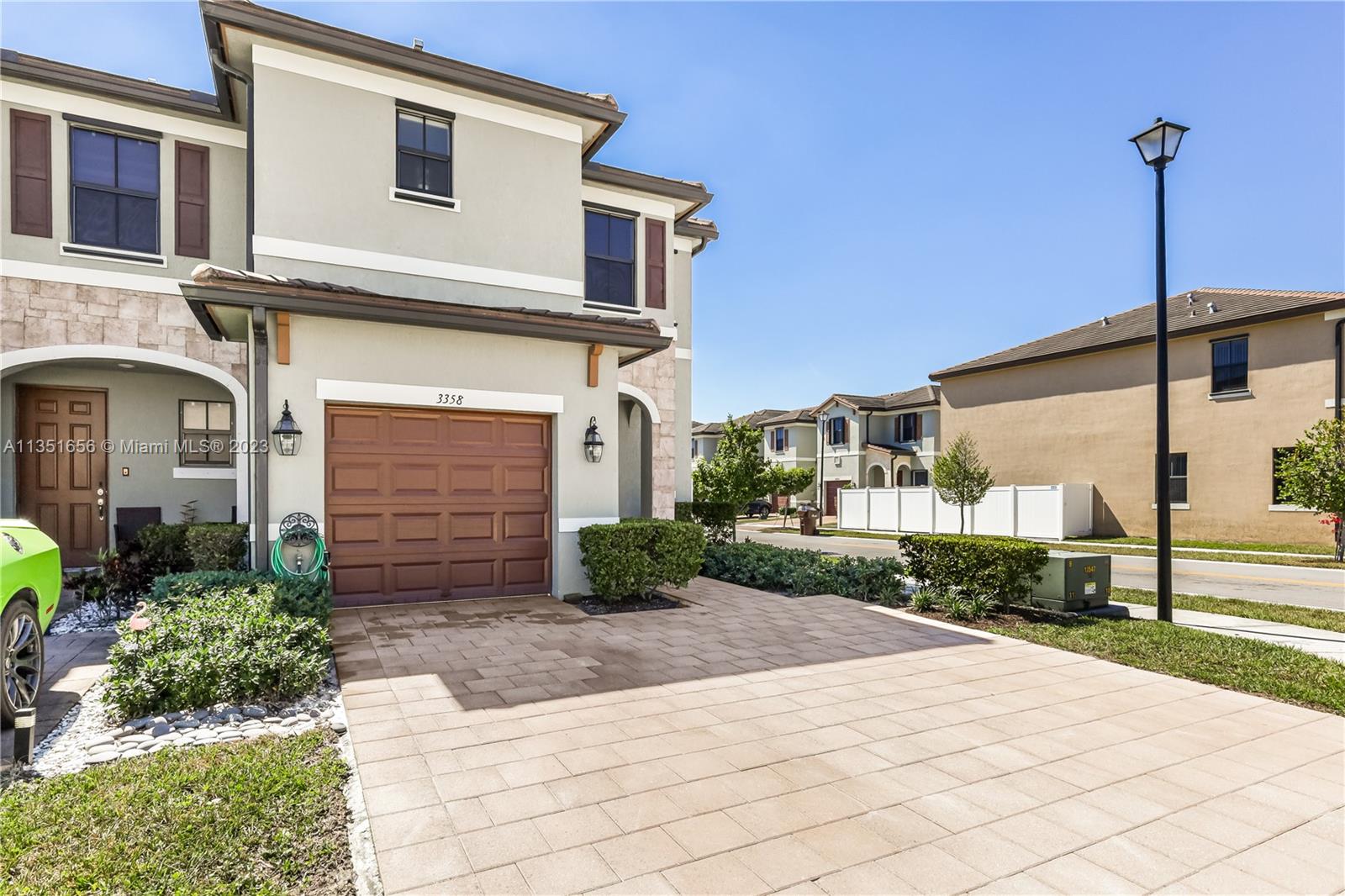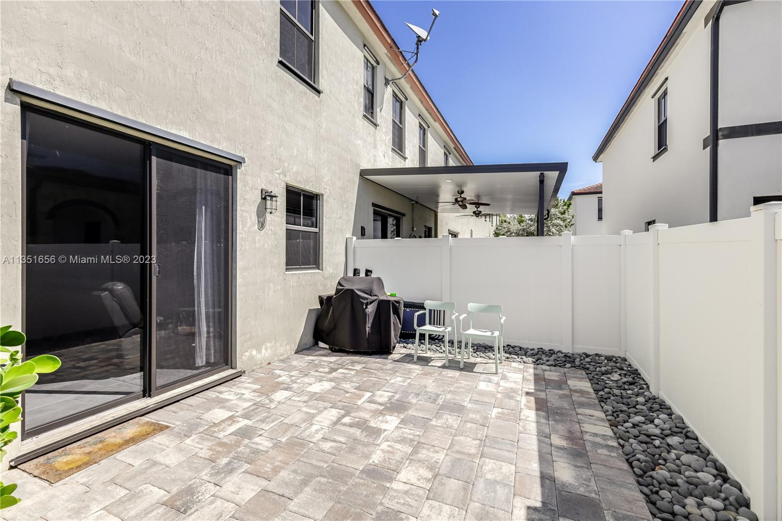 Built in 2019 & Priced to sell end unit, this well kept townhouse features an open concept. Carpeted stairs and upstairs for maximum comfort. 3 bedrooms upstairs with two full baths and a laundry room for convenience. The kitchen has granite counters, stainless steel appliances and a backyard with pavers, privacy fence with gate to the outside, and synthetic grass. The driveway is big enough for 3 cars and plenty of guest parking across the street. Aquabella has 2 clubhouses with a gym, a pool, and cabanas. The Main clubhouse has a kids splash park, jacuzzi, and outdoor kitchen. Come and check out the house and the community, look forward to seeing you!