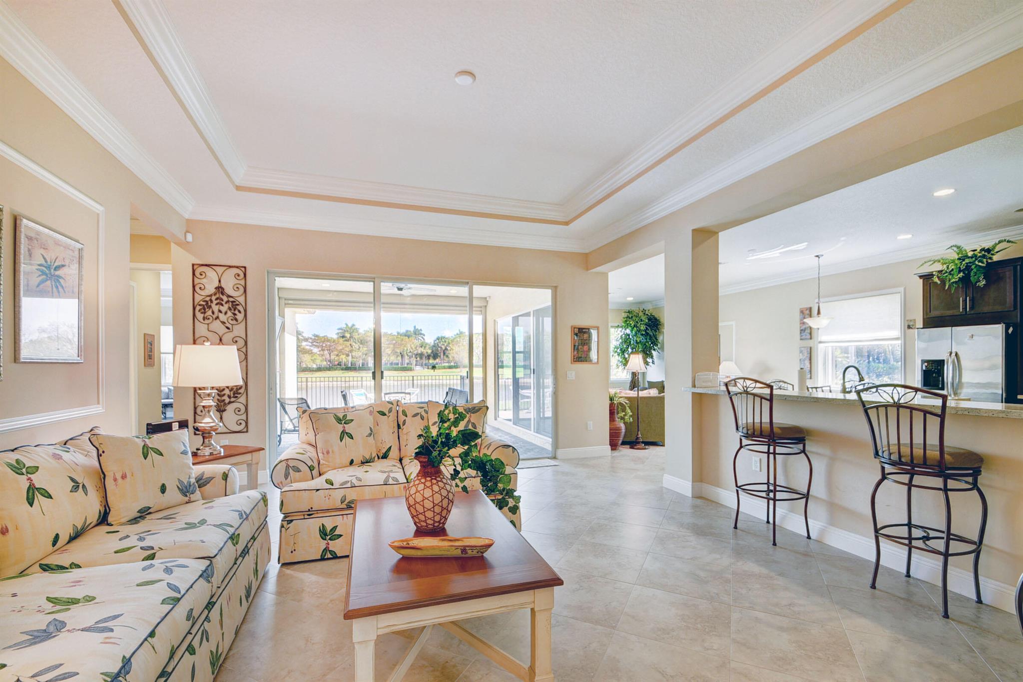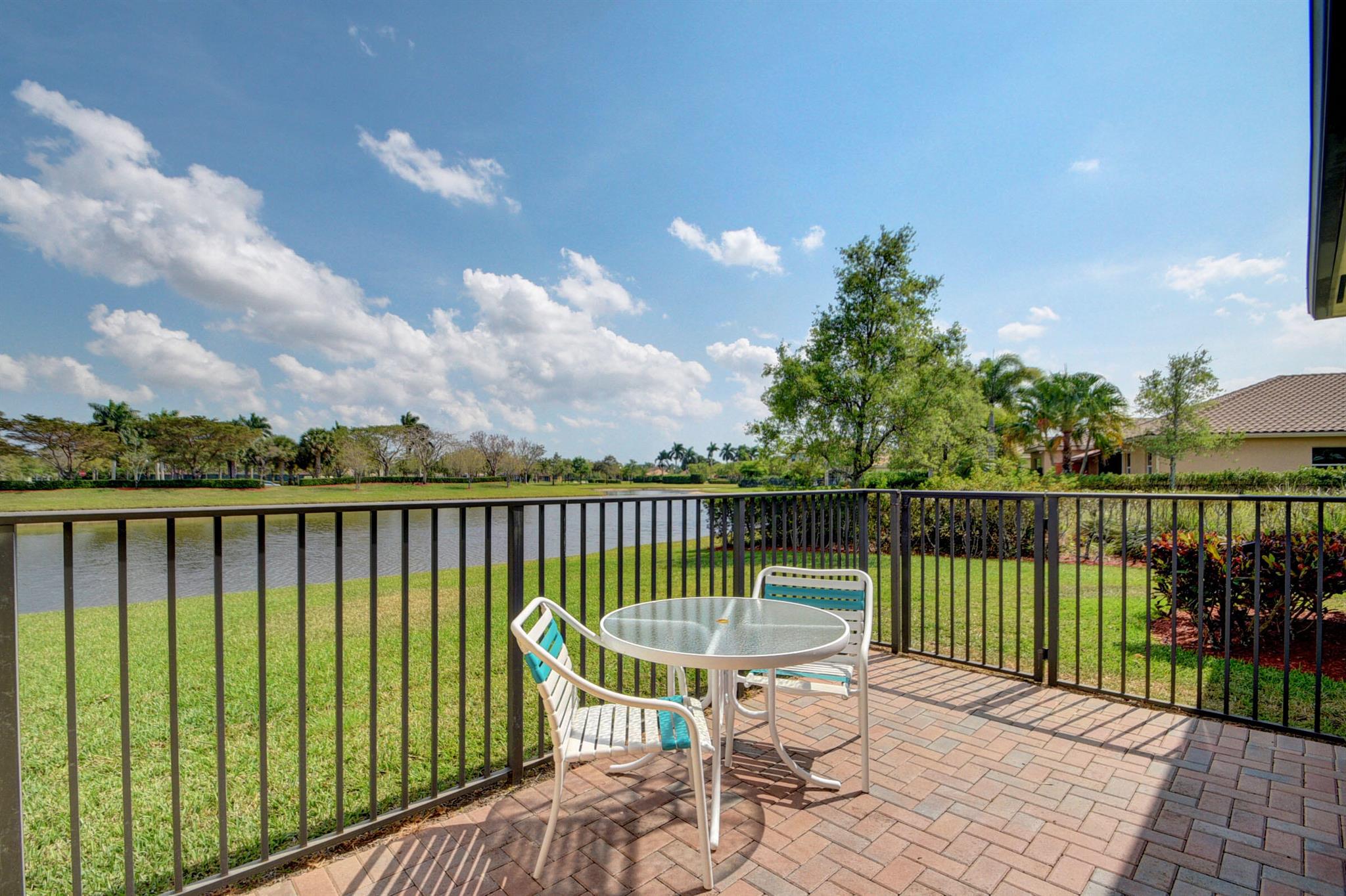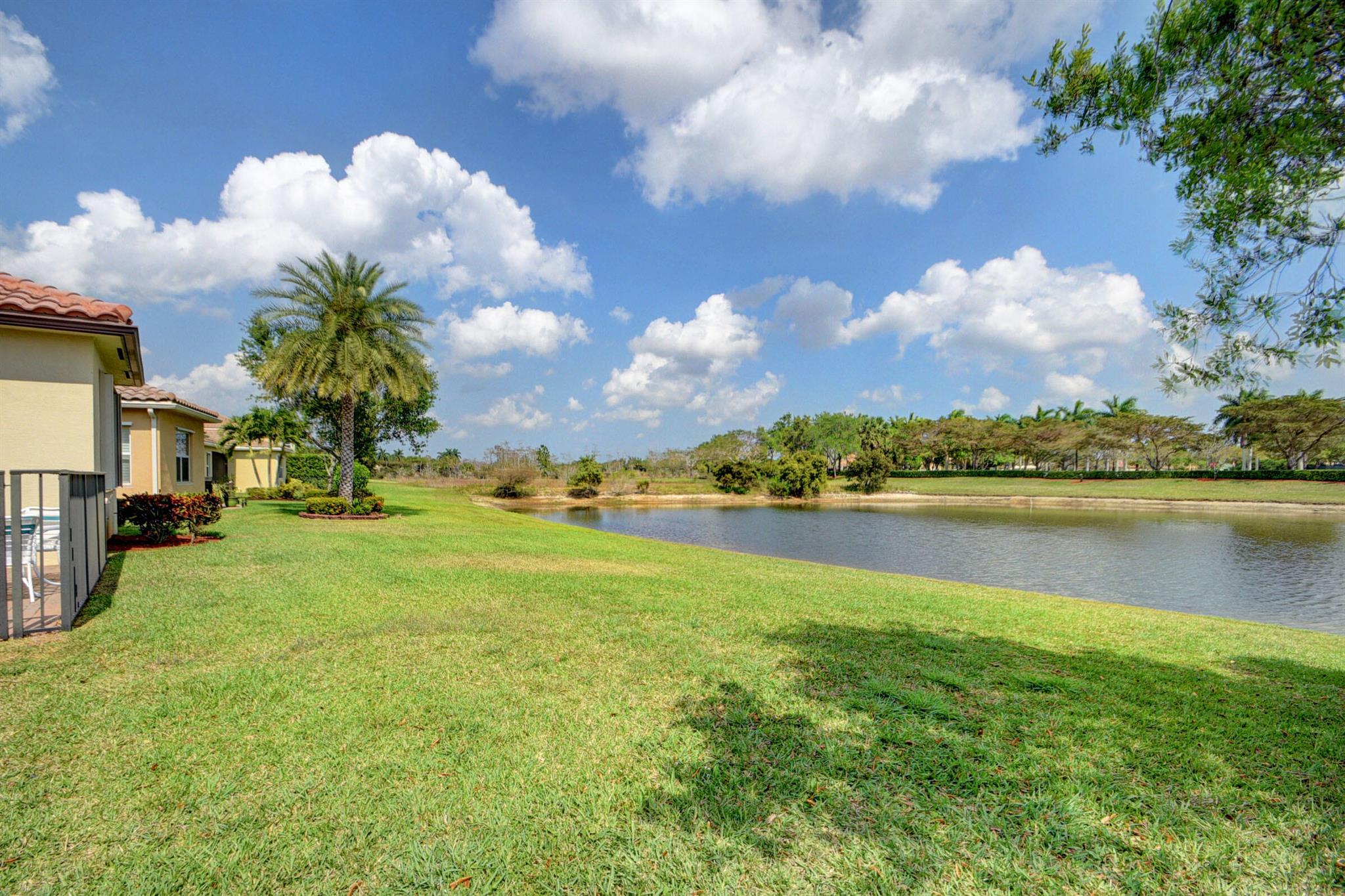 Meticulously maintained home with beautiful lake views and adjacent non-buildable lot. 10'tray ceilings, 18'' ceramic floor tile, granite kitchen countertops. Roll down screen on patio to extend enjoyment of beautiful views. Hurricane shutters on front door & patio. Owner is permitted to leave them down even when not in residence. Low HOA. Close to downtown Wet Palm, PBI airport, shopping, restaurants, 2 major hospitals, beach, park and major roadways.