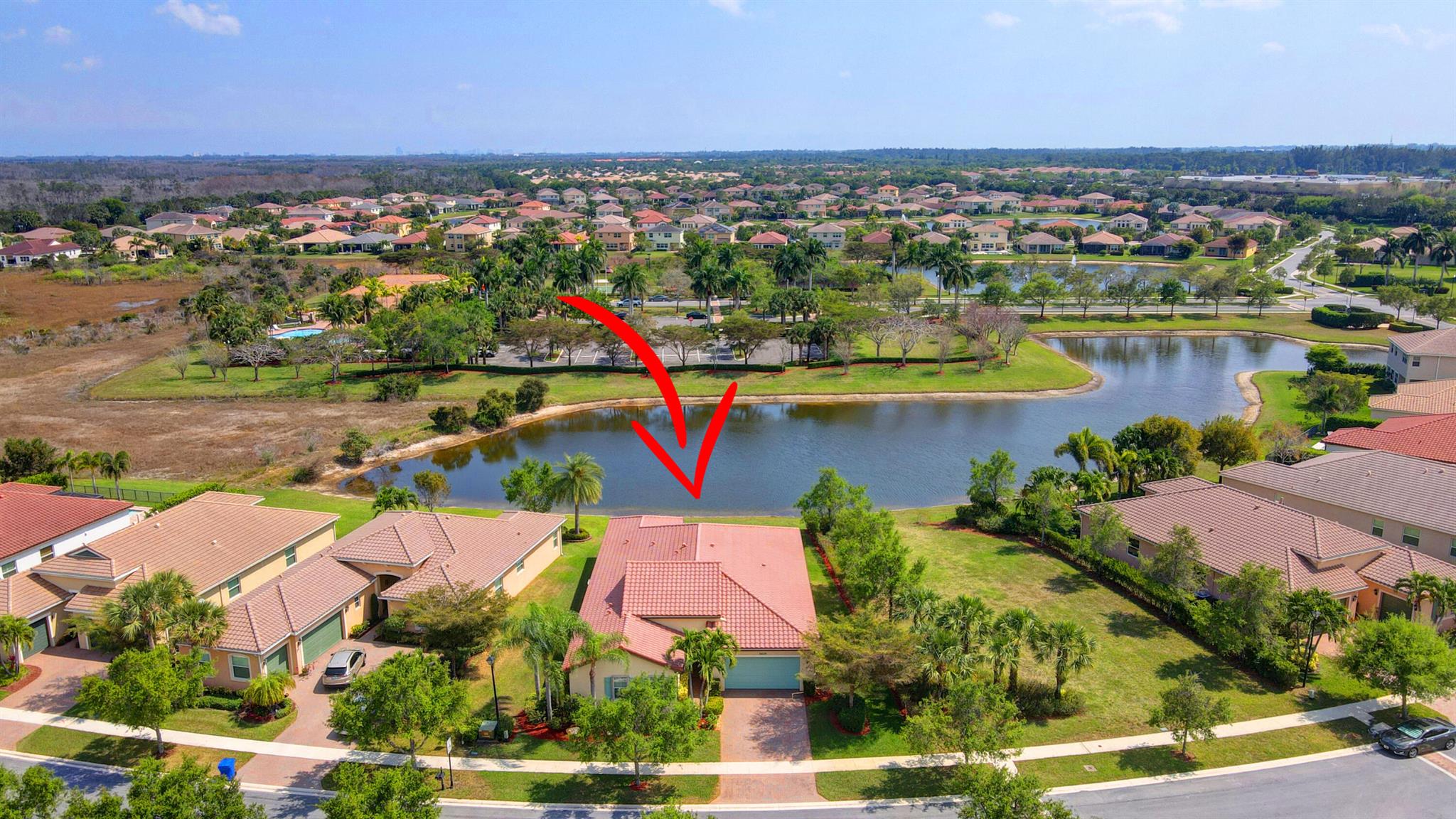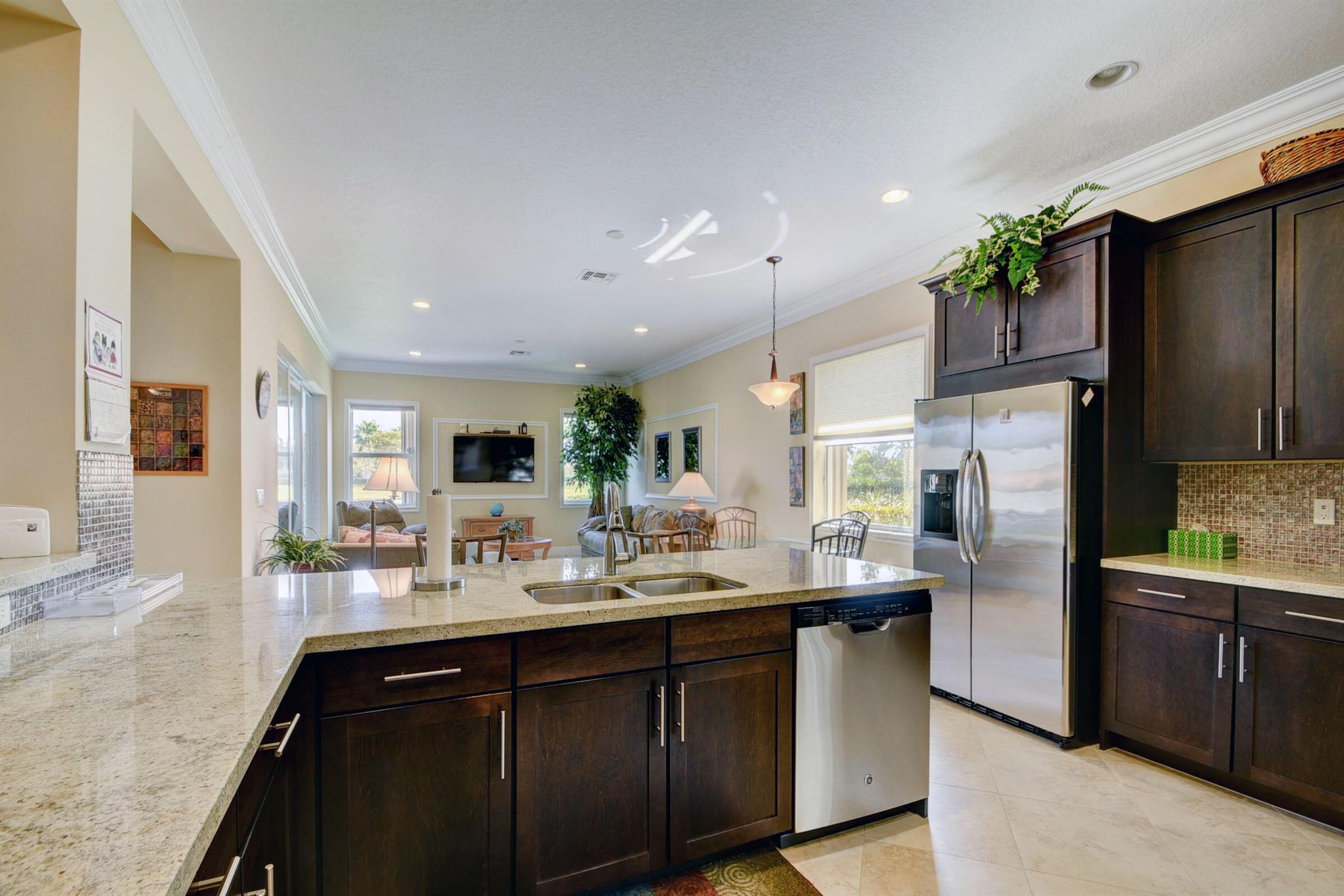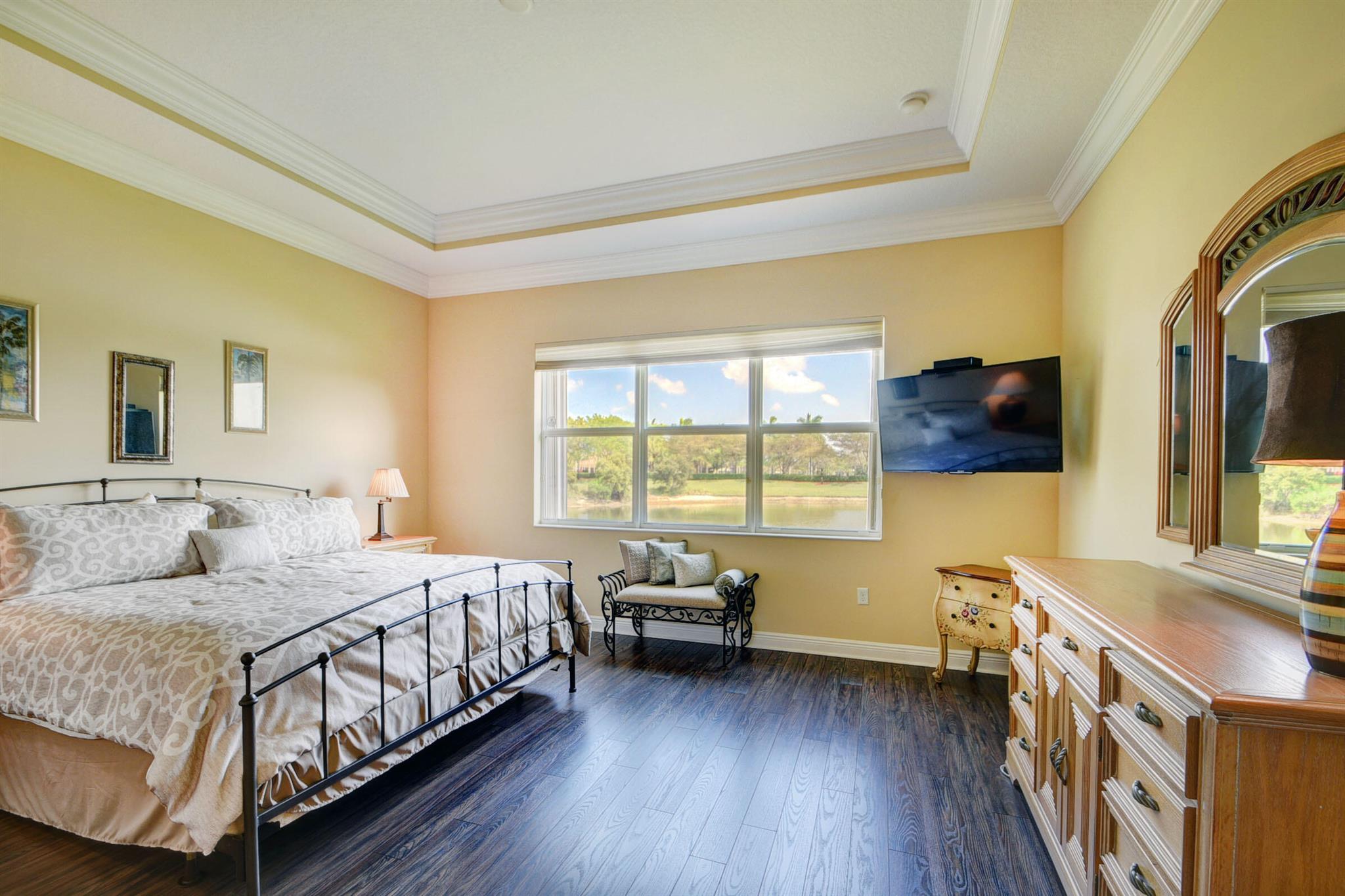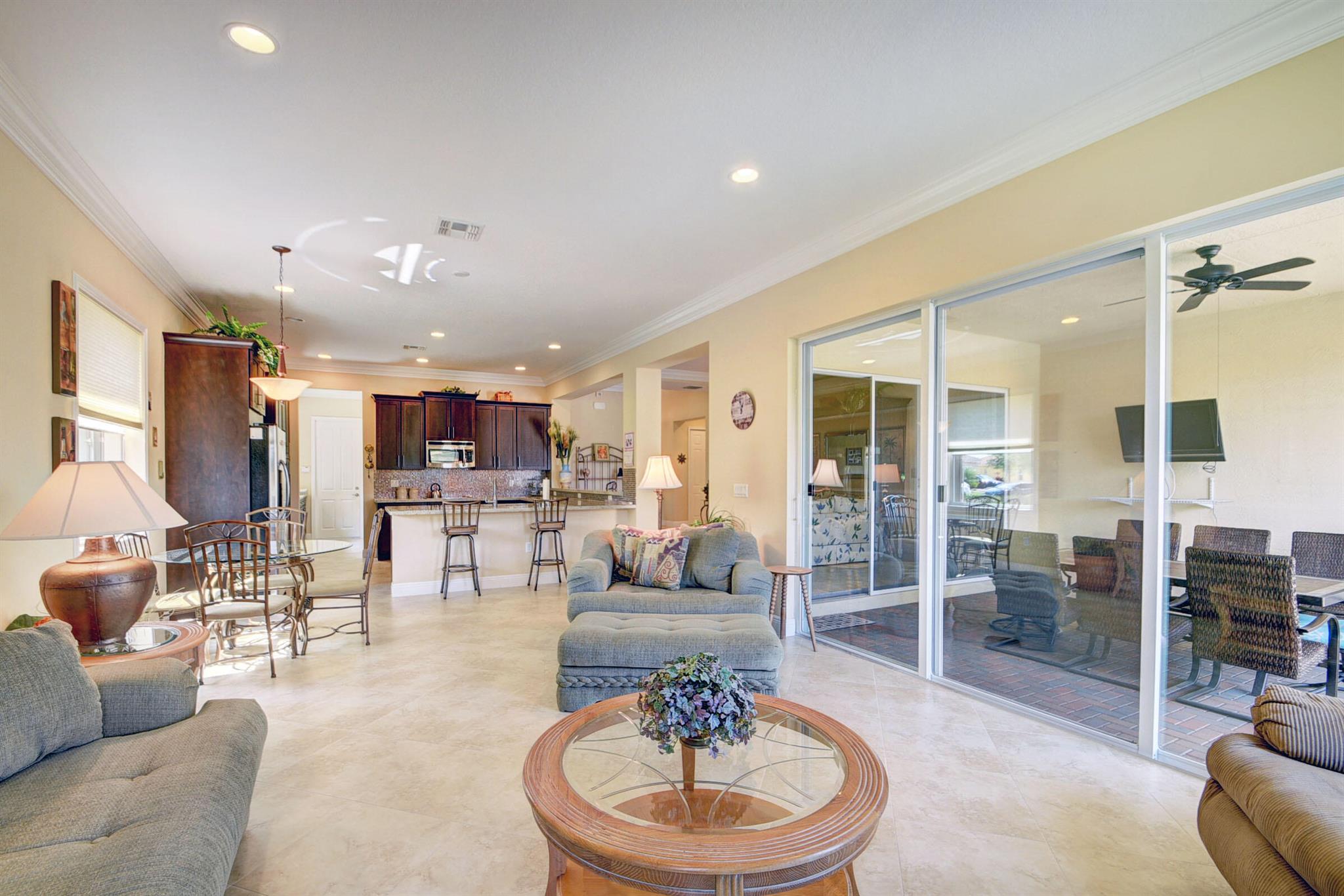 Meticulously maintained home with beautiful lake views and adjacent non-buildable lot. 10'tray ceilings, 18'' ceramic floor tile, granite kitchen countertops. Roll down screen on patio to extend enjoyment of beautiful views. Hurricane shutters on front door & patio. Owner is permitted to leave them down even when not in residence. Low HOA. Close to downtown Wet Palm, PBI airport, shopping, restaurants, 2 major hospitals, beach, park and major roadways.