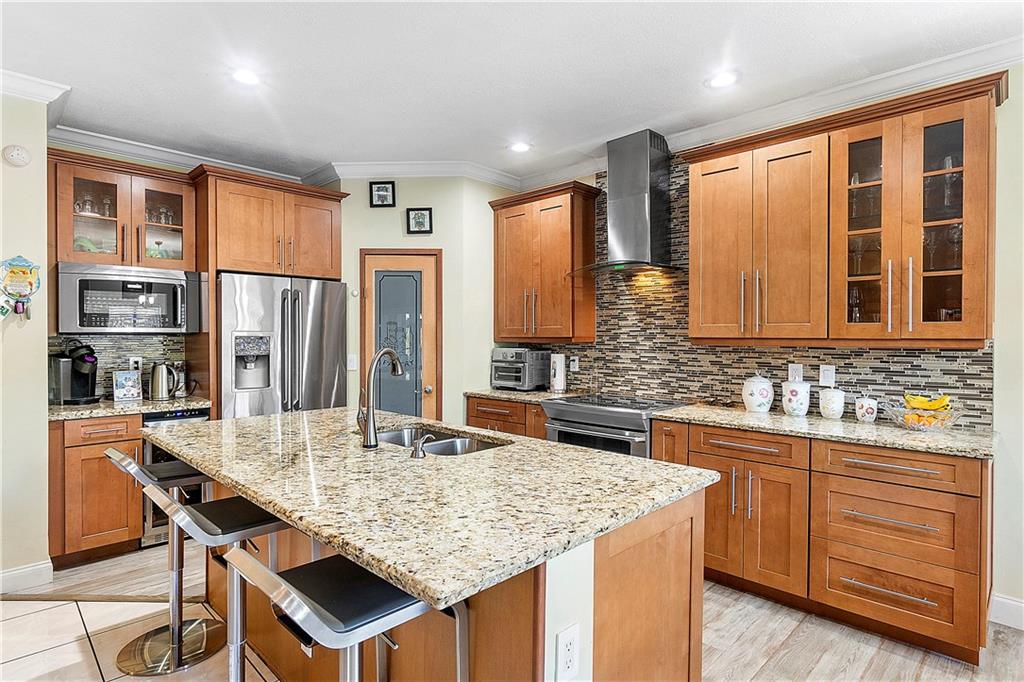 Exceptionally Captivating Two-Story Home with Tranquil Water Views! Nestled in a friendly subdivision. This 4BR/3BA, 2,706sqft property emanates upscale vibes with gorgeous Mediterranean architecture, and vibrant tropical landscaping. Drenched in dazzling natural light, the immaculate interior features an openly flowing floorplan, soaring vaulted ceilings, an elegant formal dining room, and a expansive living room with surround sound. Fashioned to satisfy discerning culinary desires with an open gourmet kitchen. Envision entertaining in the party-perfect outdoor space, which has a spacious patio, customized outdoor kitchen/grill. Primary suite includes vaulted ceilings, a walk-in closet, spa-inspired en suite featuring a jetted soaking tub, dual sinks, a separate shower, and more. Call now