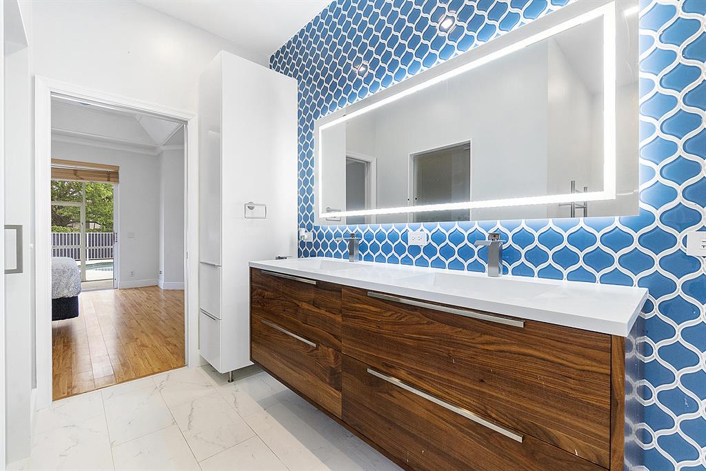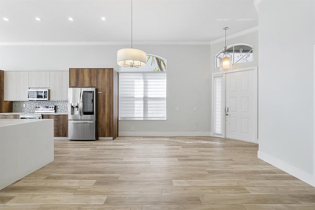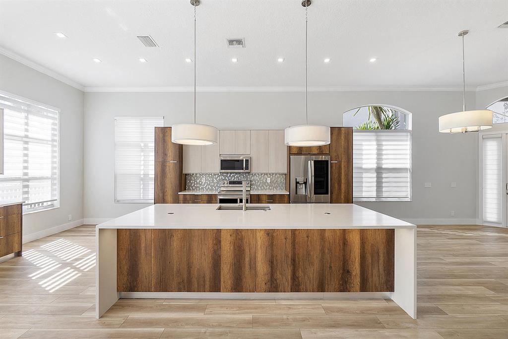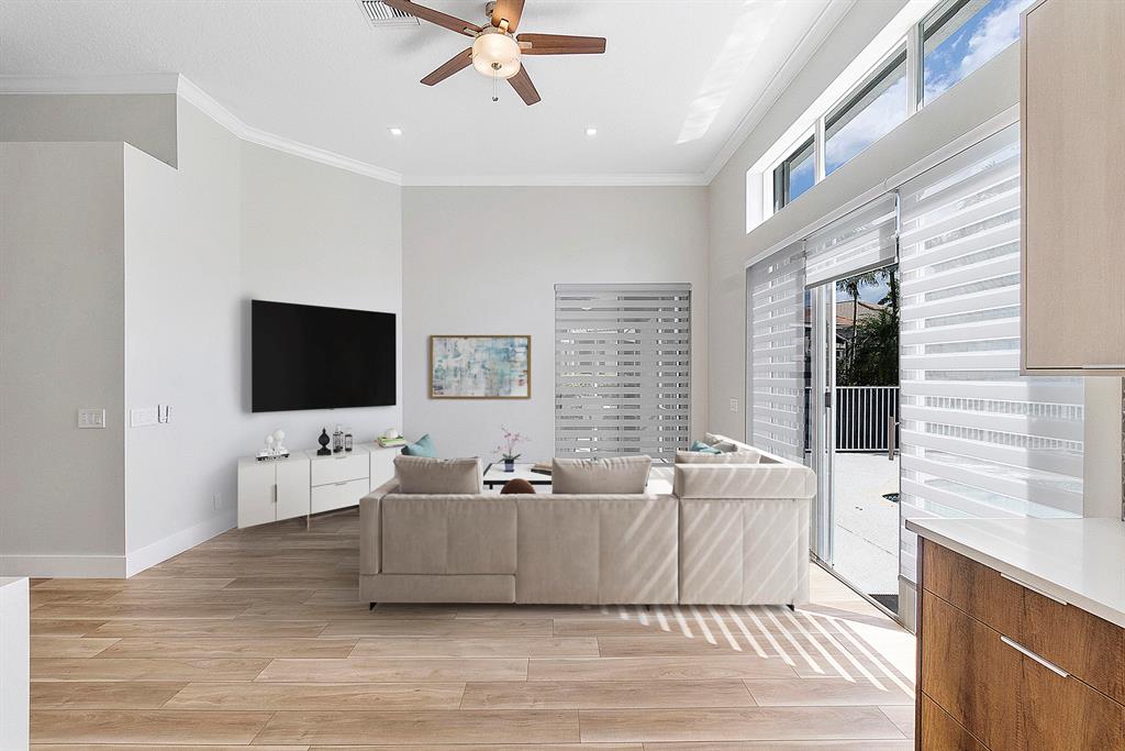 Gorgeous one story fully REMODELED pool home located in the prestigious guard gated golf community of Eagle Trace. This move in ready home has a redesigned open floor plan and spacious triple split layout featuring 4 bedrooms, 2 bathrooms and a 2 car garage. As you enter into the open concept main living space you will be in awe of the high ceilings and high-quality craftsmanship throughout the home. Designed for entertaining, the large chef's kitchen comes equipped with top-of-the-line LG smart appliances, custom wood cabinetry, a beverage station and a massive quartz waterfall island featuring integrated pop-up charging stations and extra storage. Sliding glass doors with remote controlled custom window treatments lead to the oversized pool creating an inviting indoor outdoor