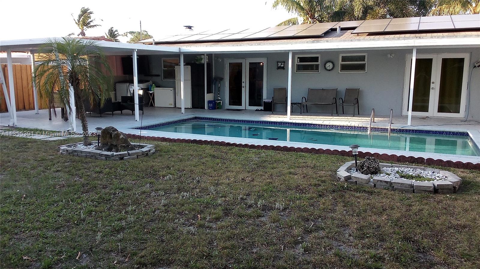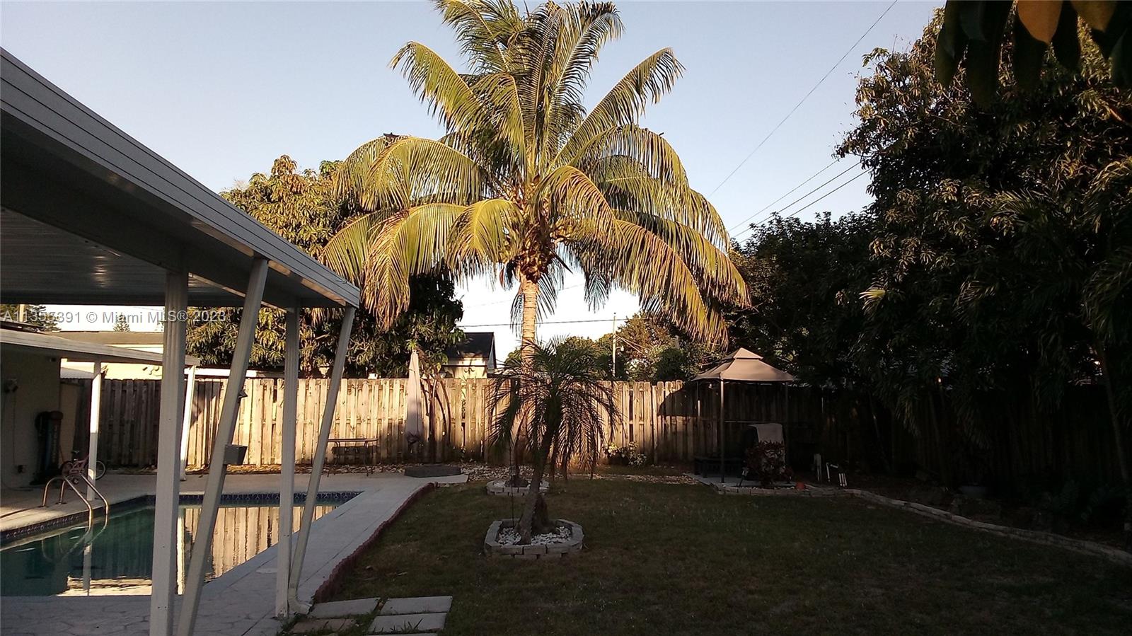 Beautiful, Charming 3bds home w/resort style pool, gorgeous, relaxing backyard perfect for entertaining and tranquility. Welcoming front patio, stamped concrete driveway, garden Magnificent lighting fixtures, gorgeous wood floors, This home offers a charming, inviting ambiance, and opens up to a lovely living room, and fireplace to enjoy warmth and comfort during our So. Flo cold snaps, built-in wine rack, built-in curio cabinet, spacious dining room, off to your spacious gourmet kitchen with granite countertop, large French door refrigerator with freeze bottom, flat top stove, built-in microwave, Hurricane-impact windows, doors, and plantation shutters offer privacy and elegance