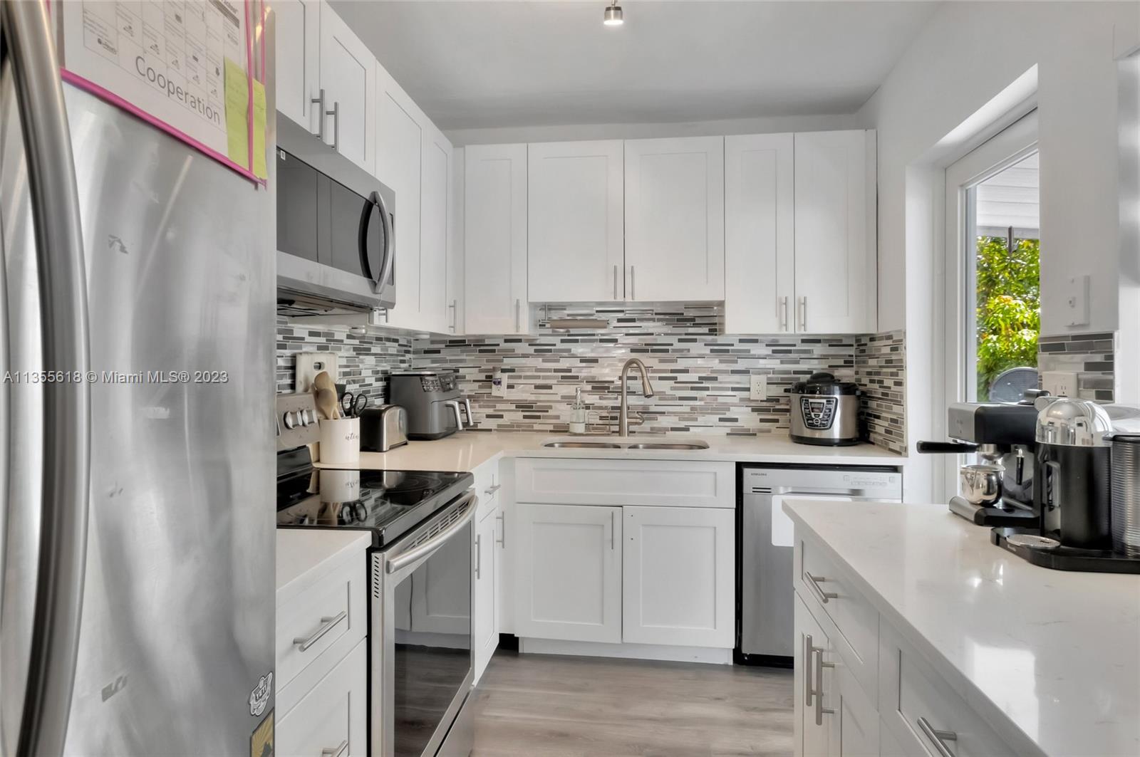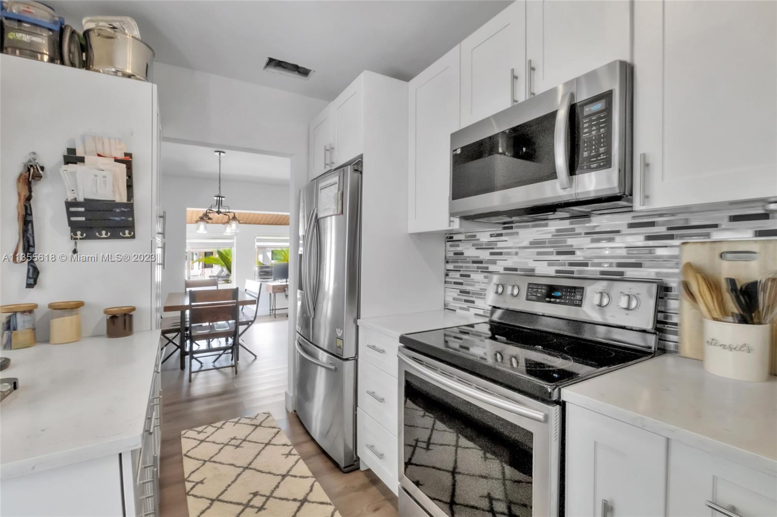 Beautiful home centrally located on a quiet street in the heart of Hialeah. This home features many updates including luxury vinyl floors throughout, a tastefully remodeled bathroom and modern kitchen with stainless steel appliances, white shaker cabinets, new fixtures and a beautifully tiled backsplash. ALL windows and doors are fully impact. Includes covered carport and lots of parking. A large backyard with several fruit trees perfect for entertaining guests with room for a pool and expansion. This is the perfect starter home for a family.