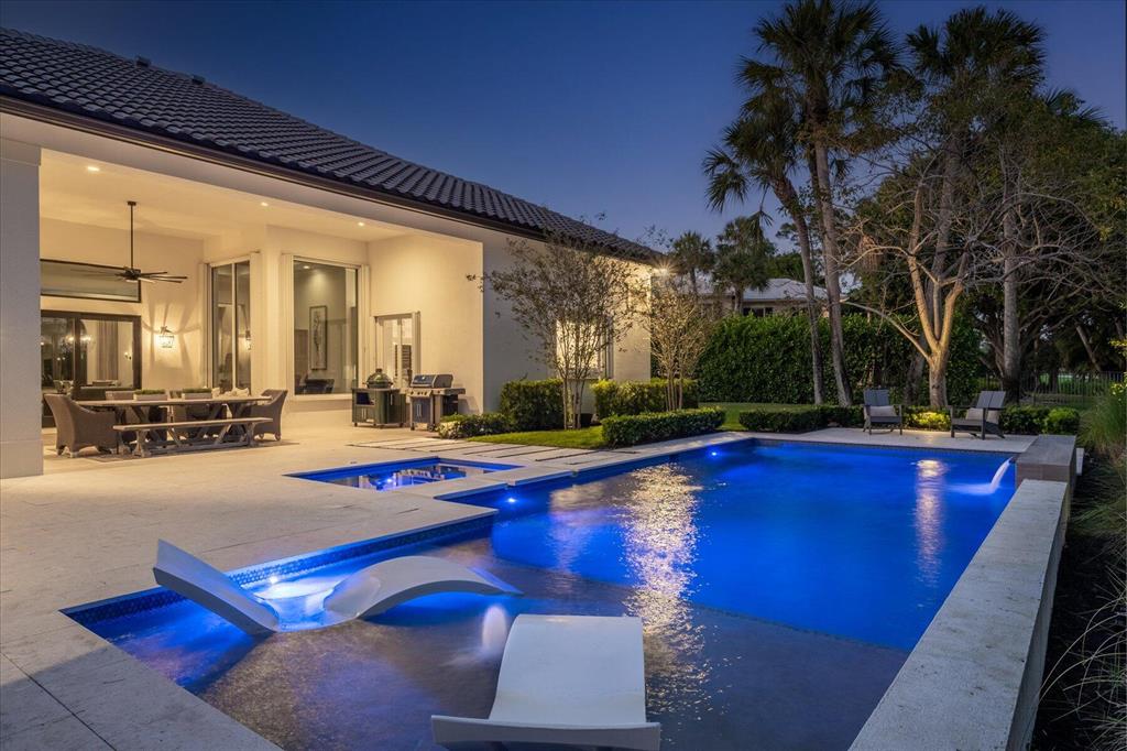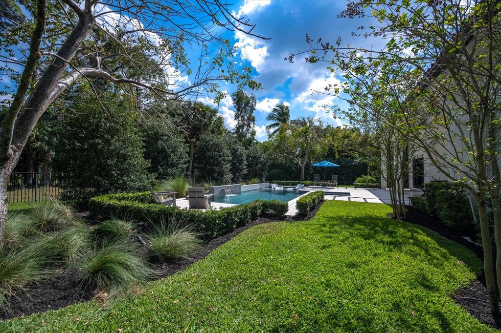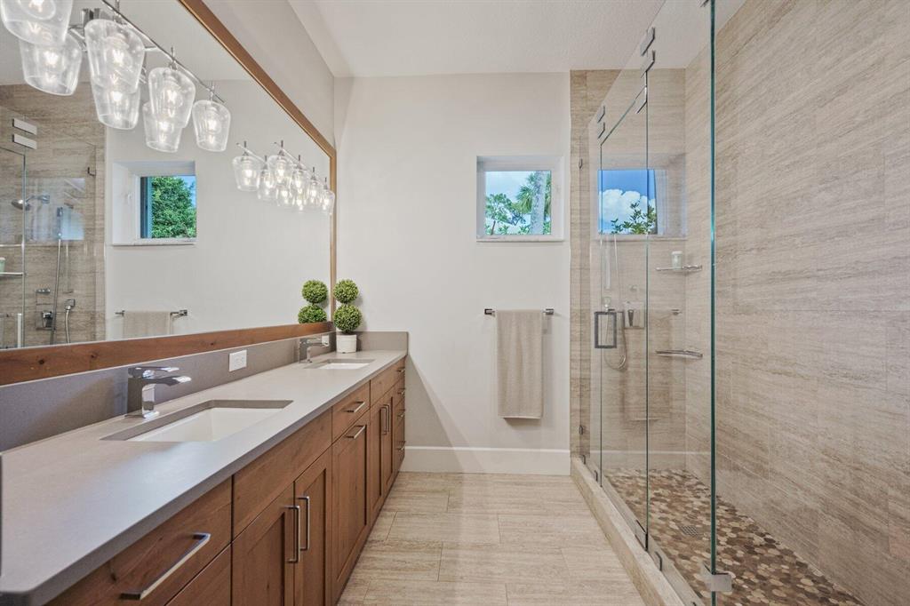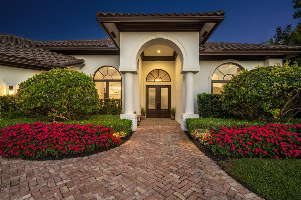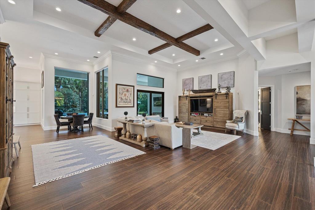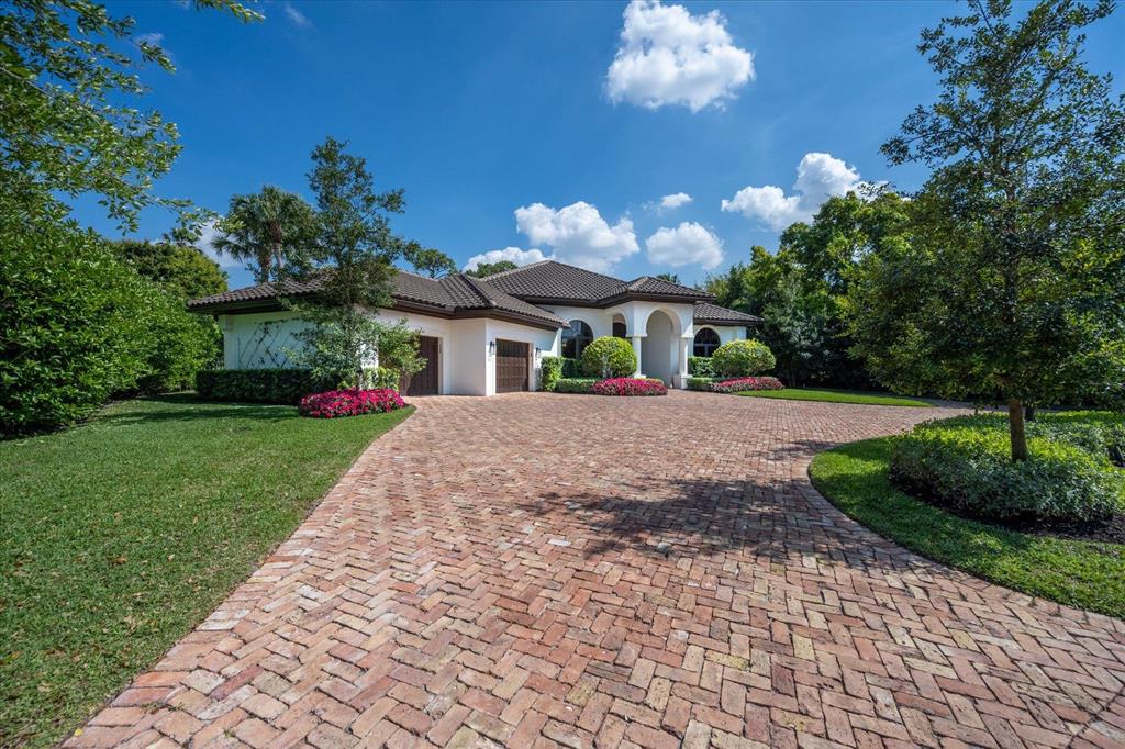 Located in West Palm Beach's premier gated community of Breakers West, this beautifully renovated custom home is brimming with character & quality finishes and situated on .49 acre lot along the renown Mayacoo Lakes Golf course in the back and a scenic in the front creating ultimate privacy. Authentic Chicago brick circular driveway leads to portico entry with reeded glass and wood impact front doors. Once inside, you will find an open floor plan with spacious Great Room featuring rich wood flooring, 14ft ceilings, crown molding and wood beams on the ceiling for more character. Formal Dining Rm with large window overlooks the lake in front & opens to Great Room. Nearby is the Powder Bath with white shiplap walls & wall-mounted porcelain and chrome sink.