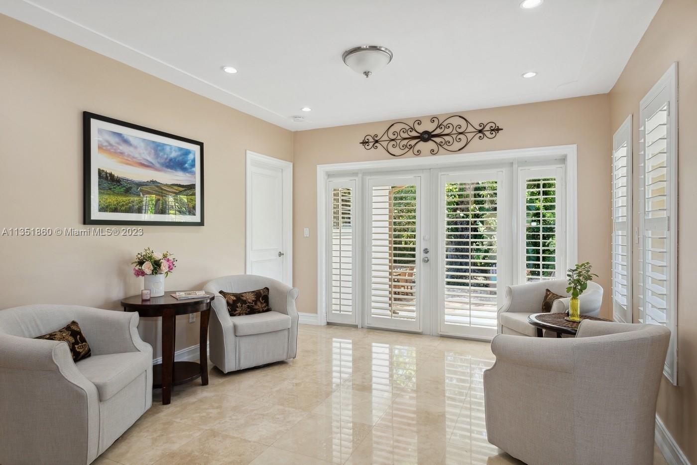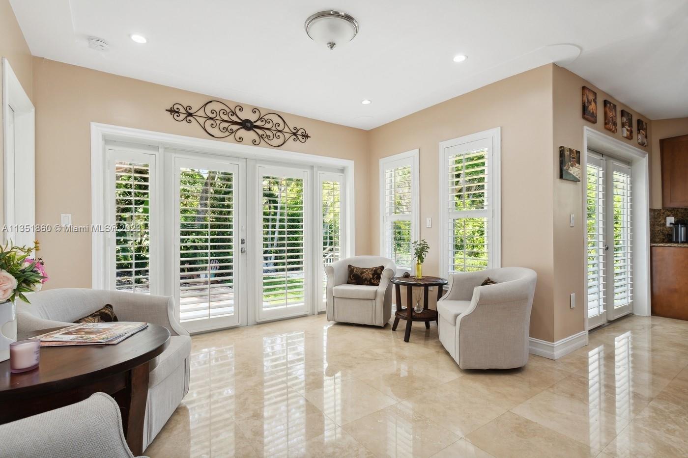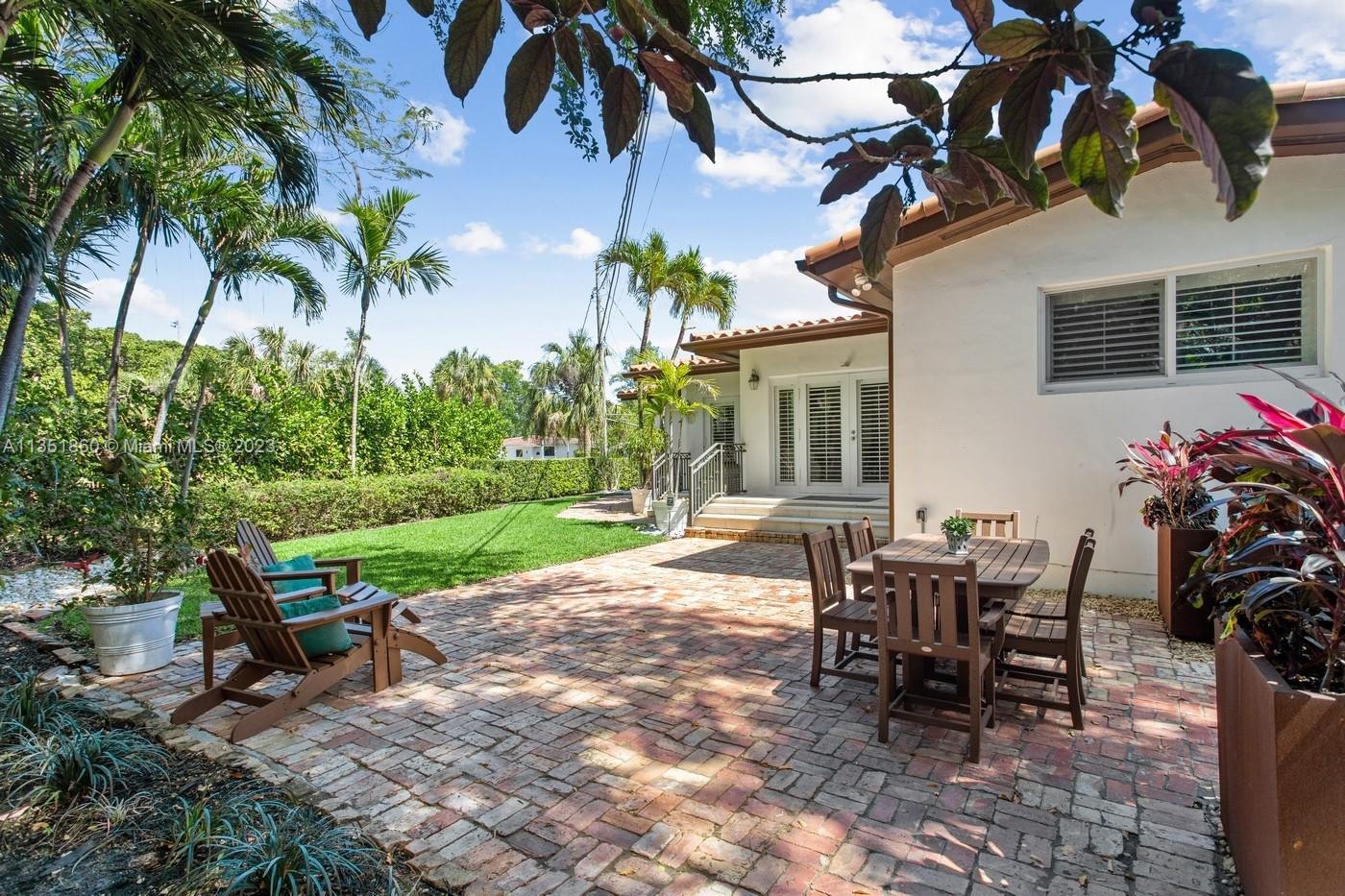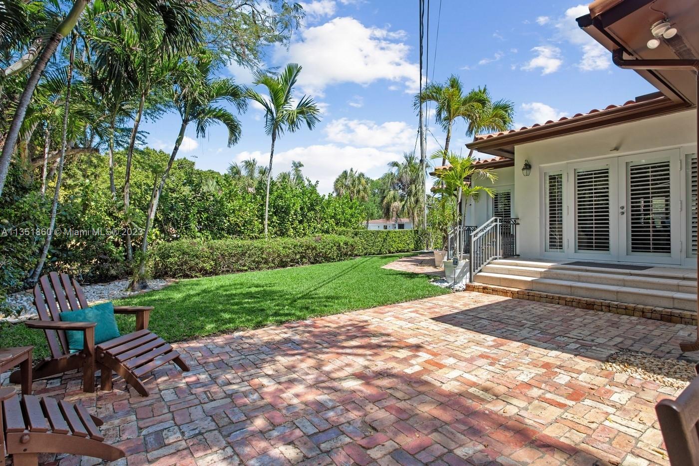 Charming and elegantly updated Gables gem! Enter into this beautiful move in ready, open floor plan to experience the perfect ambiance offering Impact windows /doors, immaculate neutral travertine and hardwood floors, plantation shutters throughout and a new Carrier A/C with u.v. light, new duct work and PVC plumbing. Perfect for intimate gatherings with an over sized island with seating, temperature controlled wine cooler, stainless steel appliances ,wood and granite kitchen, including a full house Generac generator. Crown molding with delicately designed sculptured ceilings, recessed lighting and a full 2 car garage make this the perfect oasis to include outdoor relaxation on the Chicago brick patio among mature and meticulously manicured foliage with a park like setting. Welcome Home!