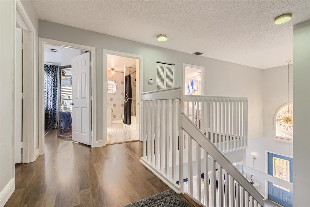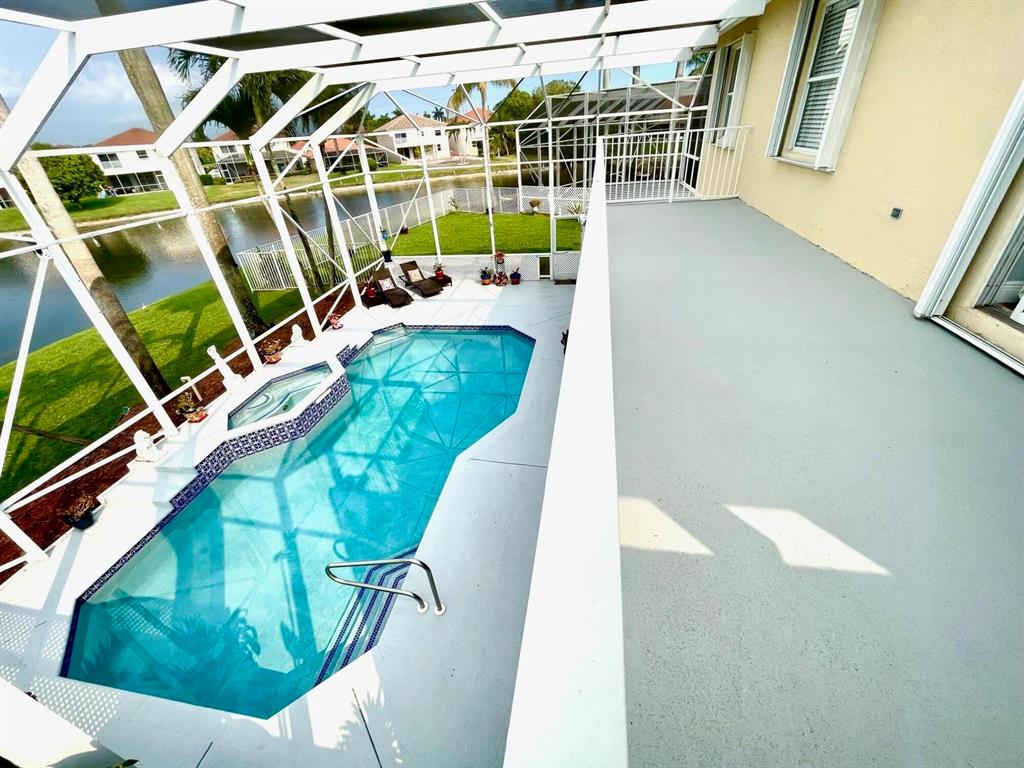 Stunning two-story home with the perfect blend of luxury & comfort. Property has 4 spacious bedrooms & 2.5 baths. Ceramic tile in downstairs living areas & rich, wood laminate in bedrooms. Kitchen updated with custom marble backsplash & marble countertops, newer appliances & white cabinets, making it ideal to cook & entertain in. Sitting on just under a 1/4 acre lakefront lot, relax under the gigantic screened in, covered patio with built in bar. Redone pool & spa are heated, adding to this oasis of tranquility. Upstairs Primary en-suite has sitting area balcony. Accordion storm shutters are on all windows. Boca Chase is in close proximity to main roads, great dining, many parks, & sought after schools. Offers must include Terms & Conditions in Broker Remarks. 2 year rental restriction.