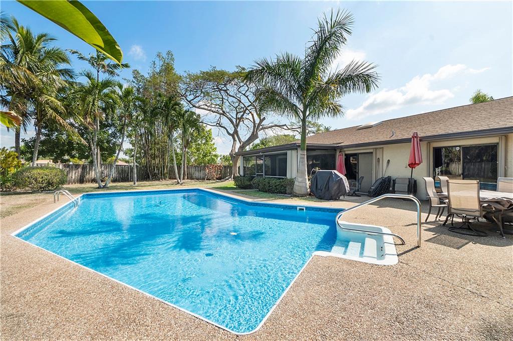 MUST SEE! This incredible 3 bedroom 2 bath one story pool home nestled in a cul-de-sac location. Huge oversized lot with fenced back yard and resort size pool. New WLV wood plank flooring throughout entire house. Vaulted ceilings make this home feel larger. Beautiful exotic granite kitchen countertops and snack bar, wood cabinetry & stainless steel appliances. Breakfast area and spacious kitchen open to the family room. Screened patio and open pool area is perfect for outdoor entertaining. All windows have accordian shutters. Exterior and interior recently painted. Two car garage with hurricane rated door and xtra refrigerator. Quiet community just minutes from shopping, restraurants and the Sawgrass Expressway, 595 and FLL Airport. Not your typical zero-lot home.
