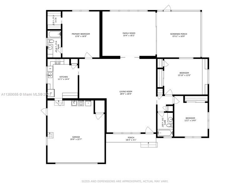First time on the market! One owner made this home very special. Well thought out details throughout. Welcoming porch at the entrance. Expansive home with large living room and dining room combination. Family room/sun-room with adjacent screened in porch. Split bedroom floor plan with large master bedroom and walk-in closet, en-suite bathroom that has a walk-in tub. On the opposite side of the home there are two generous sized bedrooms which share a large bathroom. 2-car garage. Ideal for a buyer that is looking to get into the Sunset Elementary School boundaries. The neighborhood is quiet and peaceful. Living in this home brings you to all that is good in Coral Gables. Roof in 2009. Septic system front of the home. Floor plan in pictures.