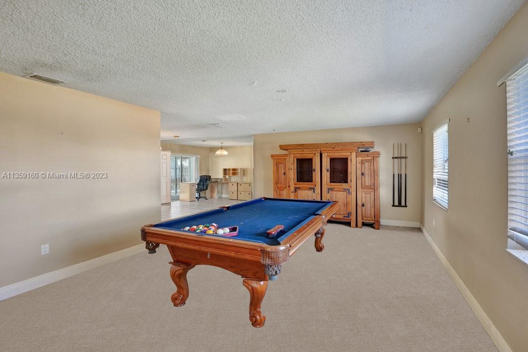 Welcome to this hidden GEM! This stunning 4bd 2.5 bath property has a bit of everything. From a screened pool, spacious primary bedroom, to a huge backyard. Hurricane shutters on all the windows, a 2-car garage with a washer & dryer located in the same area, and central AC which makes this home comfortable. The interior of this home is just as impressive as the exterior. You'll love the spacious primary bedroom with marble counter tops in the bathroom. This property also has a spacious kitchen with stainless-steel appliances. The billiards table is a great addition for entertaining friends and family, and the large living areas provide plenty of space for everyone to relax. The screened pool and patio area are perfect for enjoying the Florida sunshine.