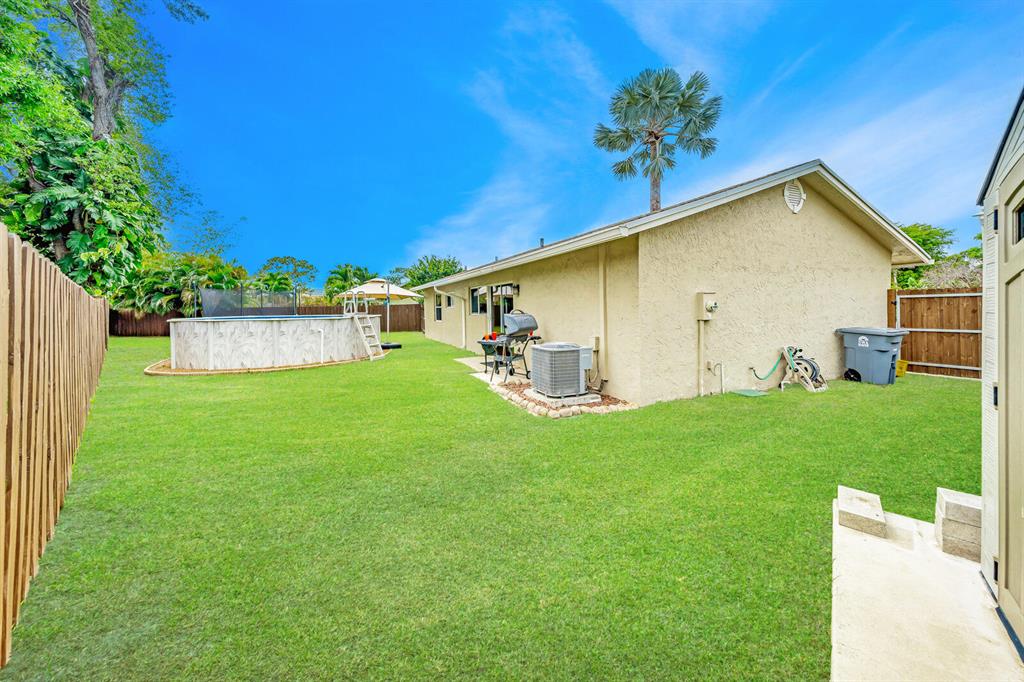 WOW! Located on a cul-de-sac with an oversized 6,911 sf lot this 2 bedroom, 1 bathroom, 1 car garage, pool, huge backyard single family home in Saddlebrook/Spanish Isles in Boca Raton with amazing Boca schools! Large upgraded concrete driveway that fits 4 cars with ease. Huge backyard that has a new fence from 2020 with wood stain (not paint). Not your ordinary above ground pool here. Pool is 18' round by 4' deep. Twin bottom drains, twin return jets, leaf skimmer, 1.5 HP two speed pump, 150 sq ft cartridge filter, FH120 heat pump with chiller, dolphin robotic cleaner, and removable safety steps. Plus a 10' by 10' purple leaf cantilever umbrella conveys as well. Rainbird Wi-Fi sprinkler system puts full control of your sprinkler system in the palm of your hand. 7' by 7' shed on