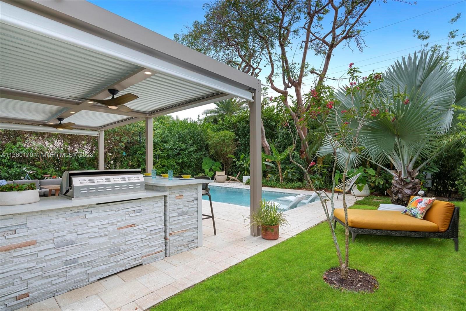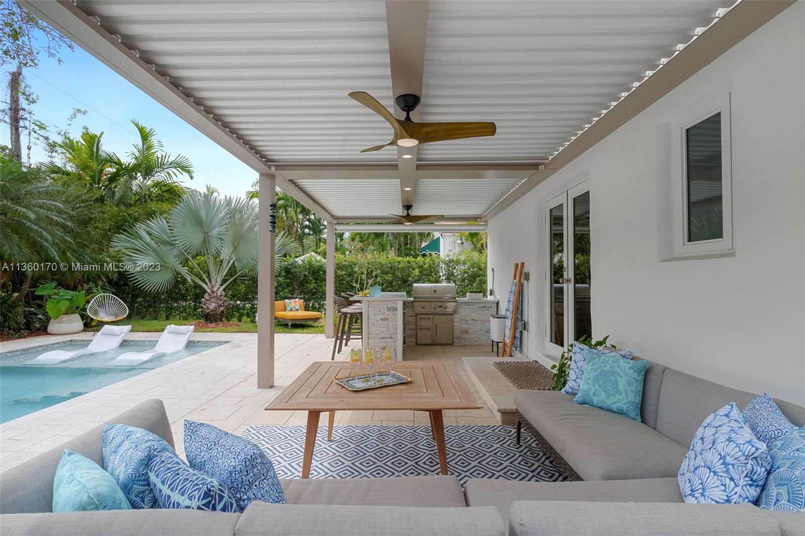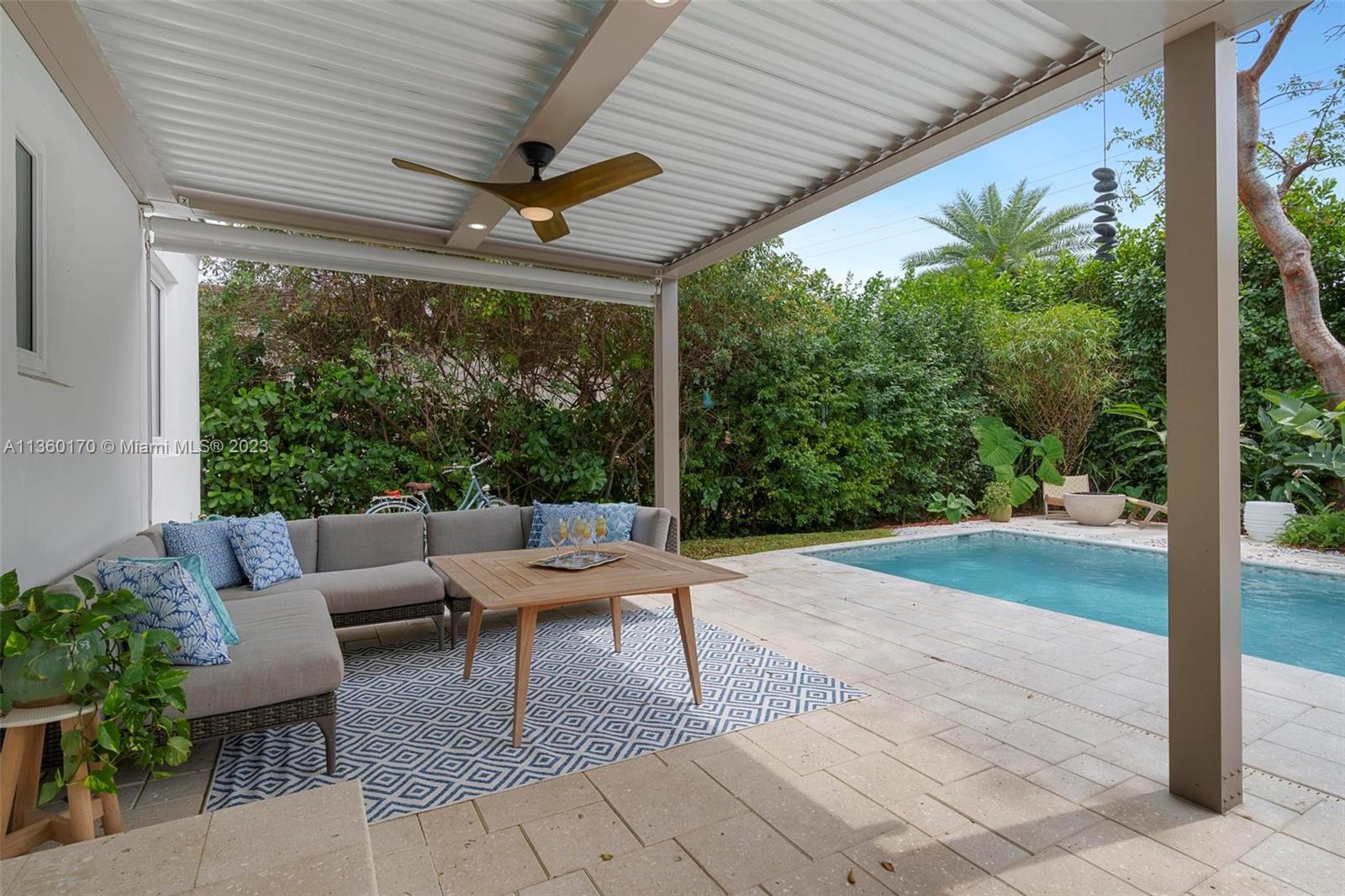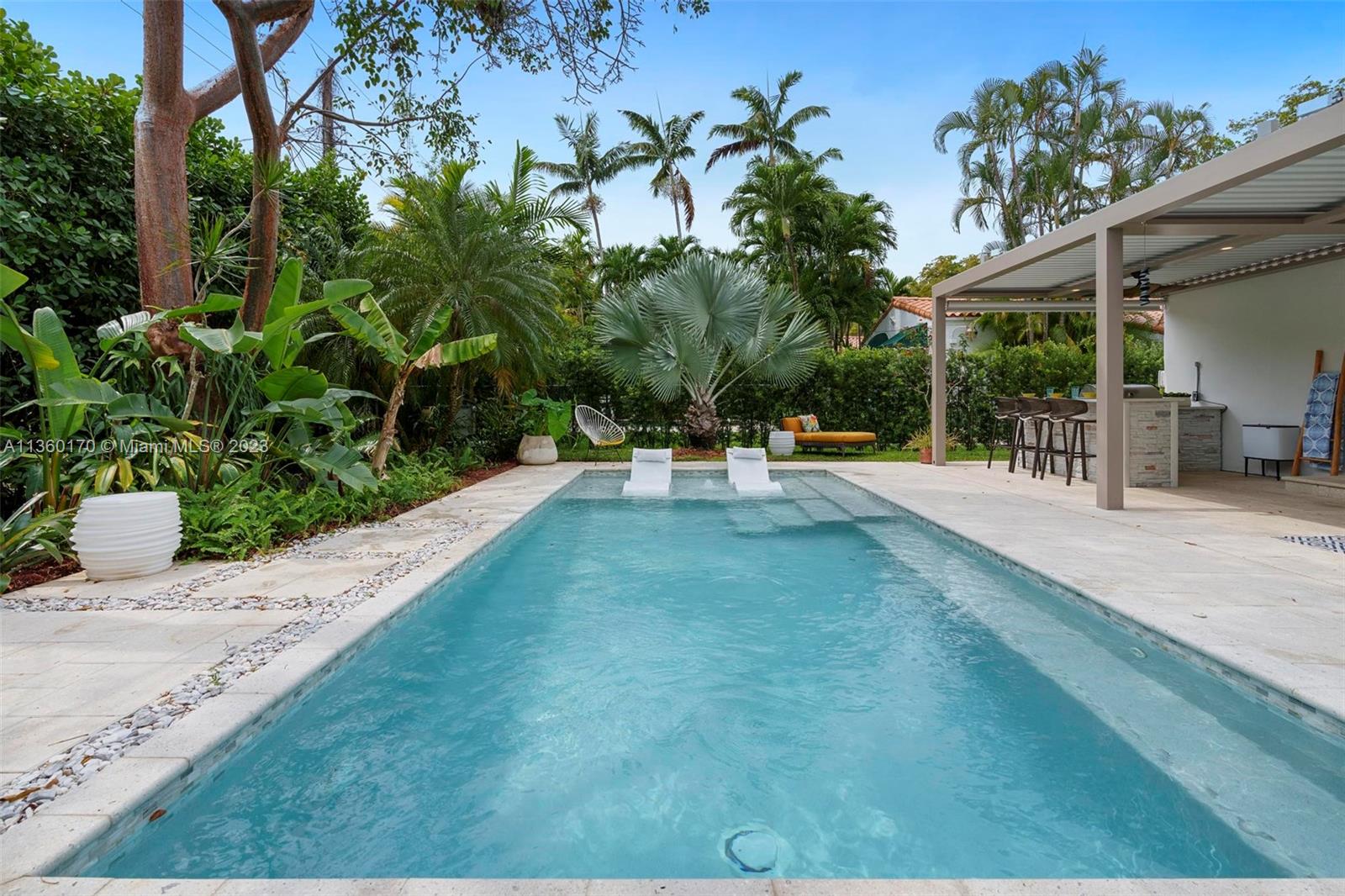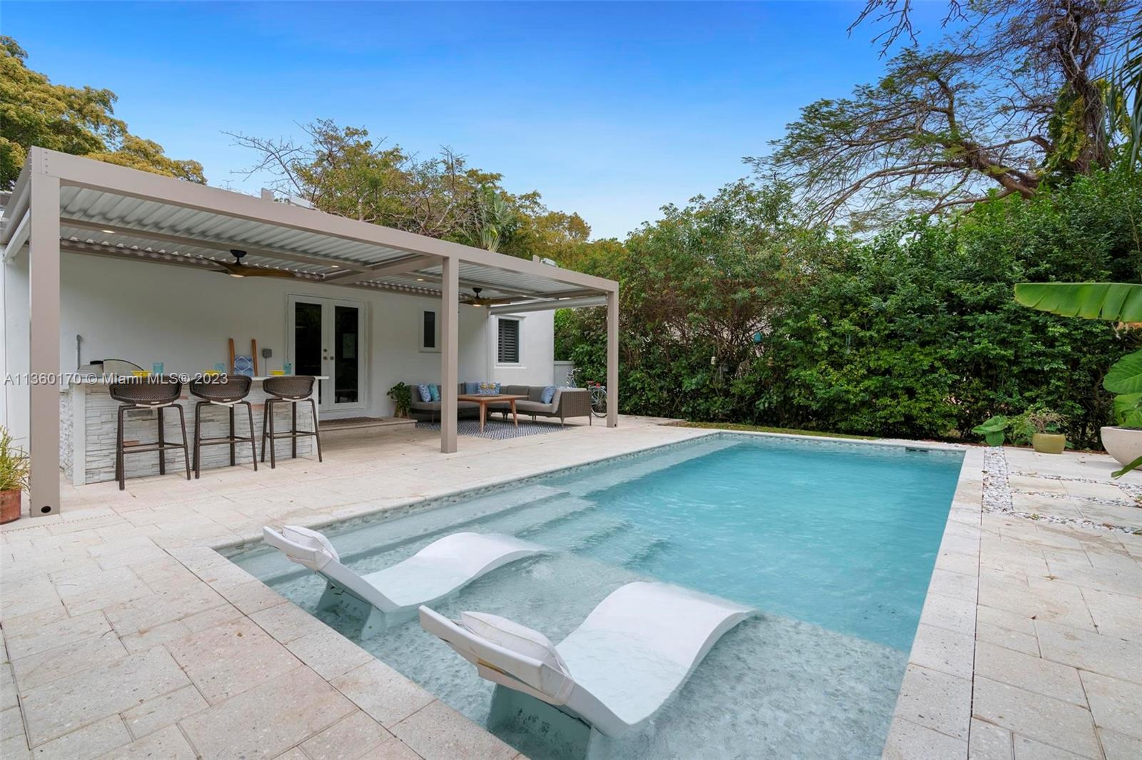 Welcome to your new home, a true tropical oasis, featuring a salt water pool where you can lavishly entertain rain or shine underneath the retractable pergola featuring a built-in outdoor grill, refrigerator and bar. Lush greenery and mature trees provide privacy and tranquility. This Coral Gables 2/1 home is a perfect blend of modern amenities and classic charm featuring a chef's kitchen; Miele appliances; quartz countertops; Waterworks bathroom fixtures; and original fireplace. The living room is bright and airy, with large windows that let in plenty of natural light. The living room seamlessly transitions into the dining area and open kitchen which is perfect for hosting family gatherings and dinner parties. Garage converted as a den/office and laundry room. New roof 2017, HVAC 2020.