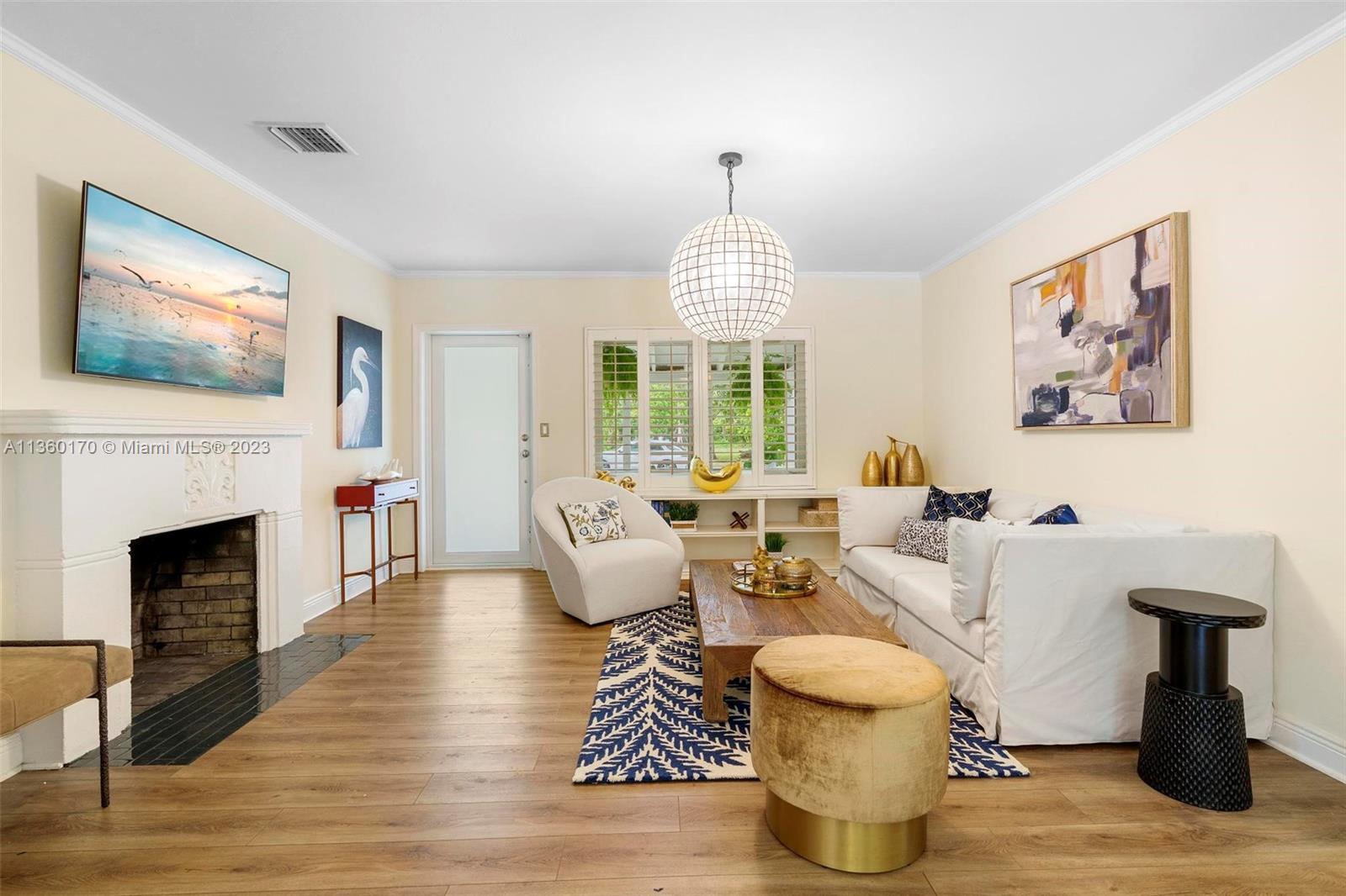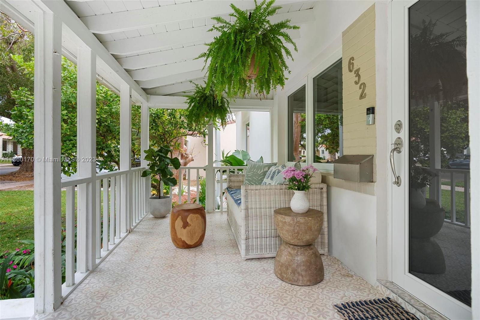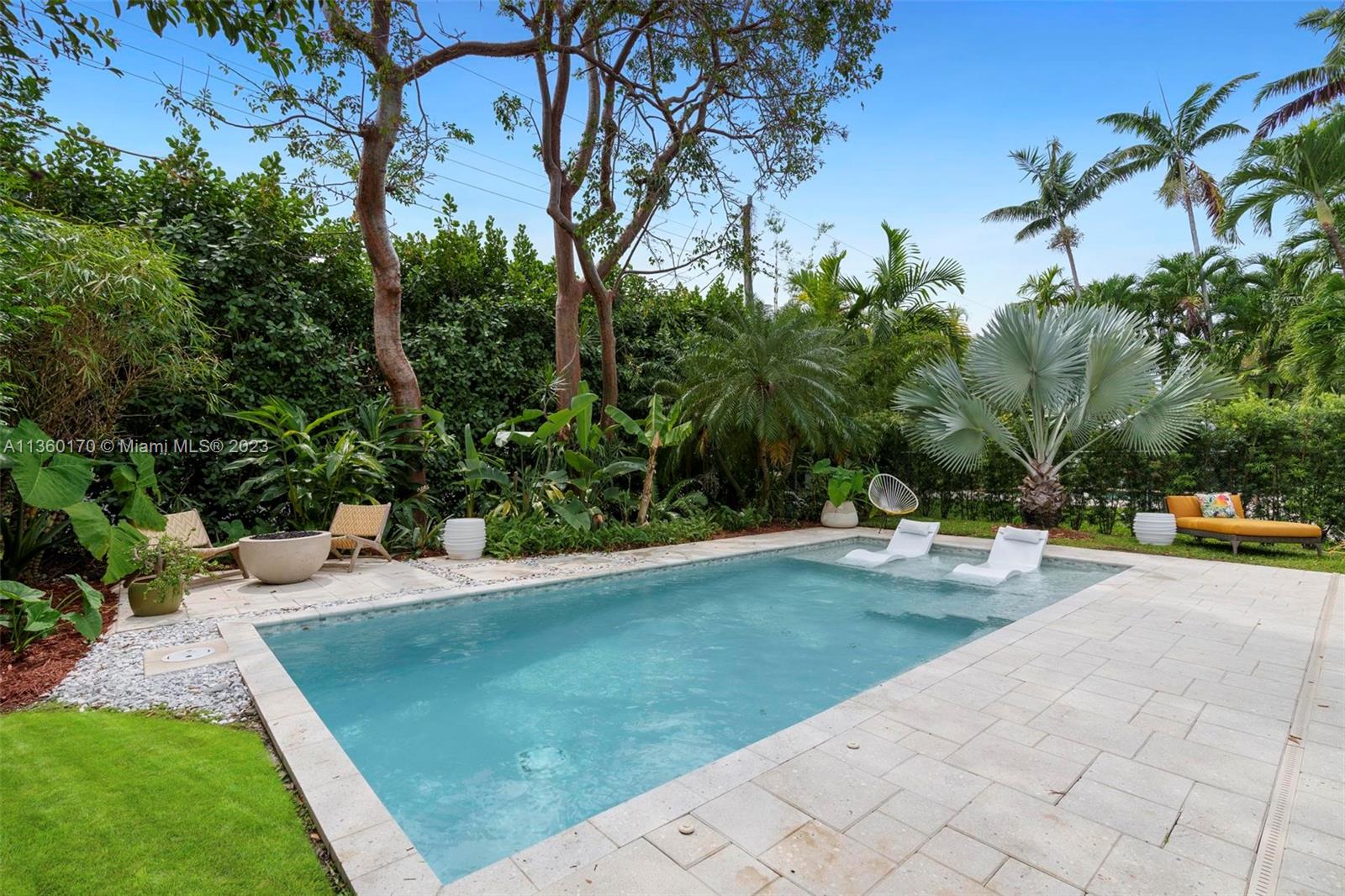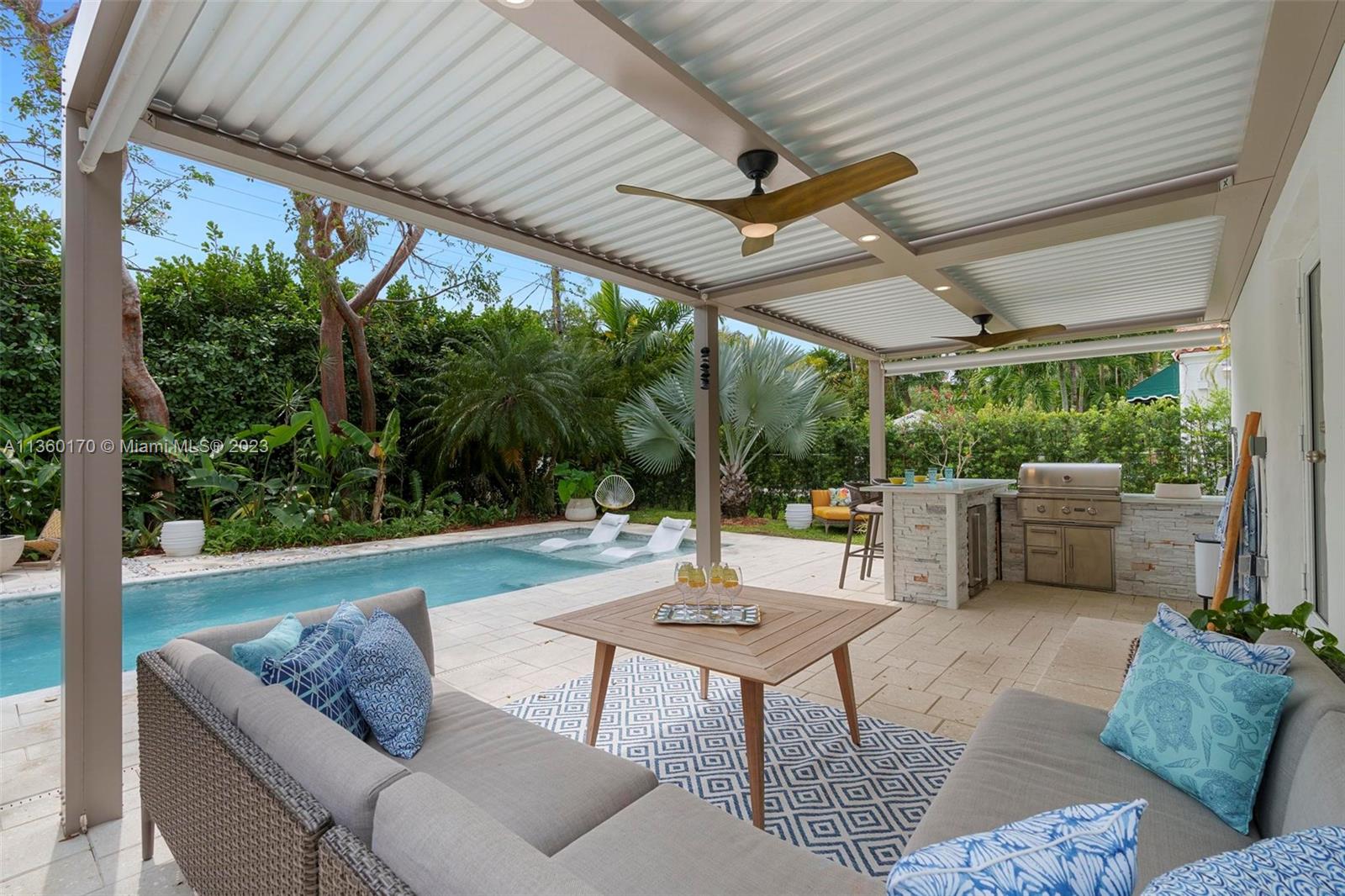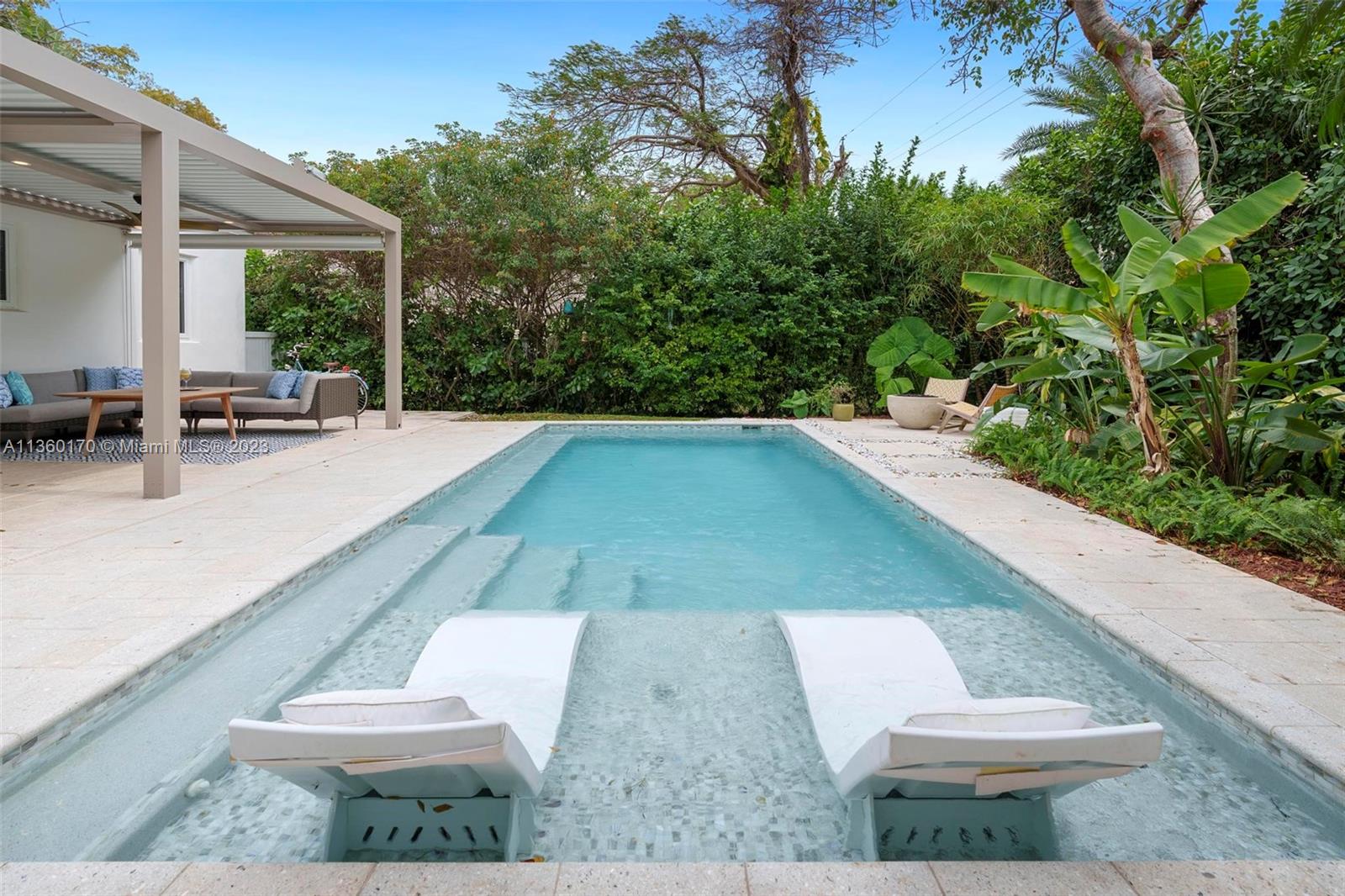 Welcome to your new home, a true tropical oasis, featuring a salt water pool where you can lavishly entertain rain or shine underneath the retractable pergola featuring a built-in outdoor grill, refrigerator and bar. Lush greenery and mature trees provide privacy and tranquility. This Coral Gables 2/1 home is a perfect blend of modern amenities and classic charm featuring a chef's kitchen; Miele appliances; quartz countertops; Waterworks bathroom fixtures; and original fireplace. The living room is bright and airy, with large windows that let in plenty of natural light. The living room seamlessly transitions into the dining area and open kitchen which is perfect for hosting family gatherings and dinner parties. Garage converted as a den/office and laundry room. New roof 2017, HVAC 2020.