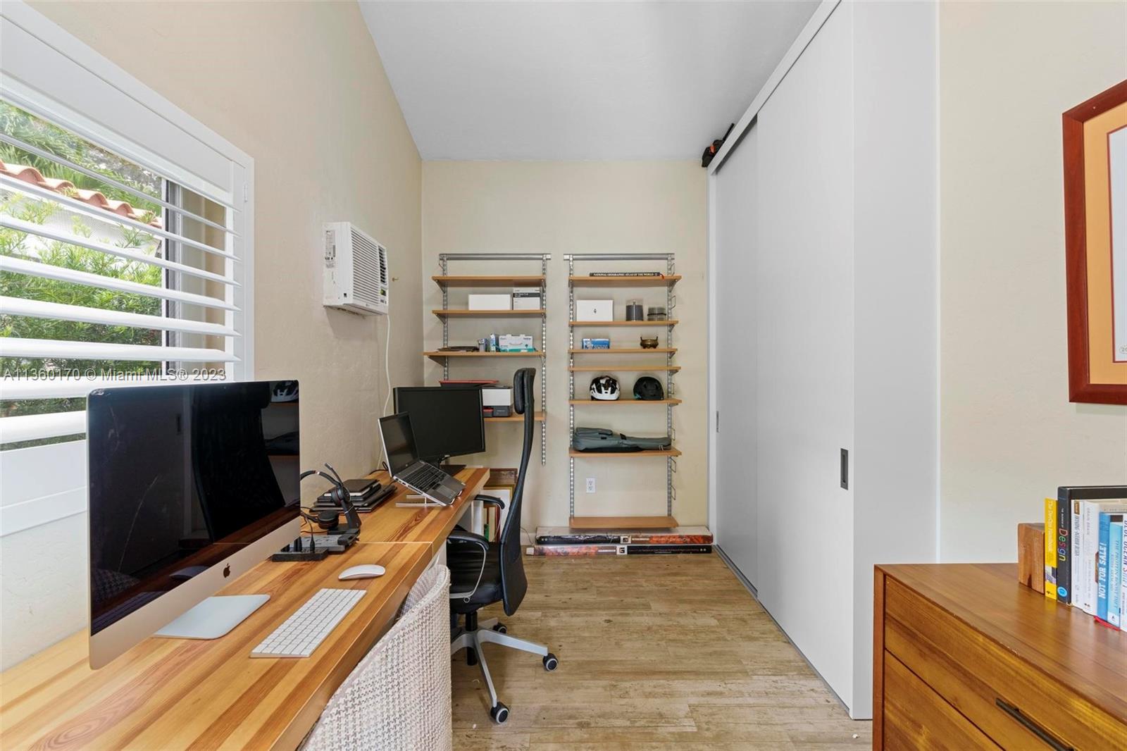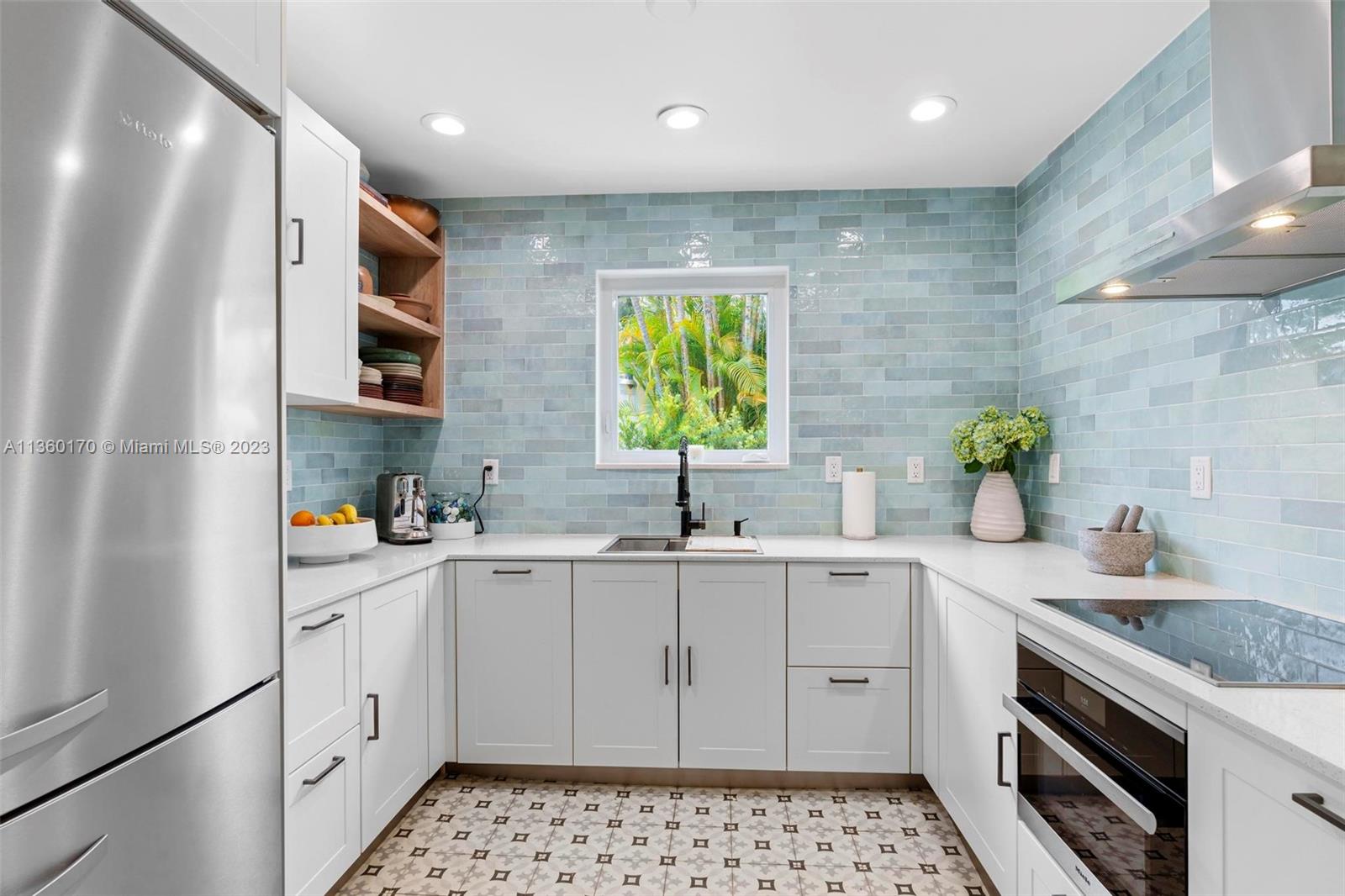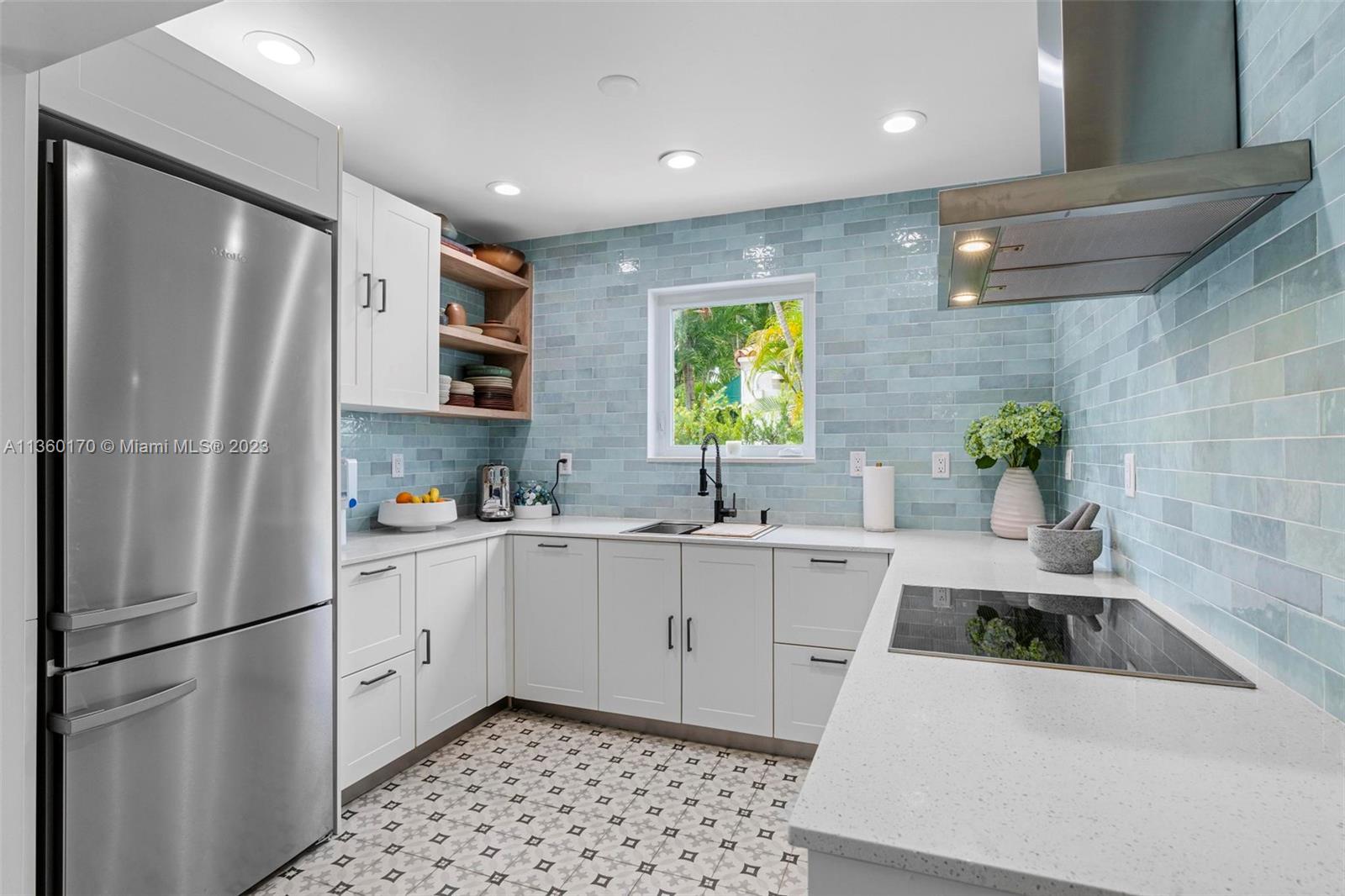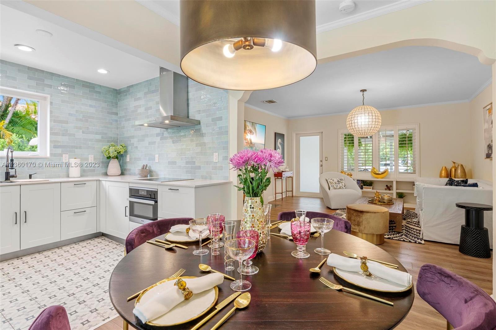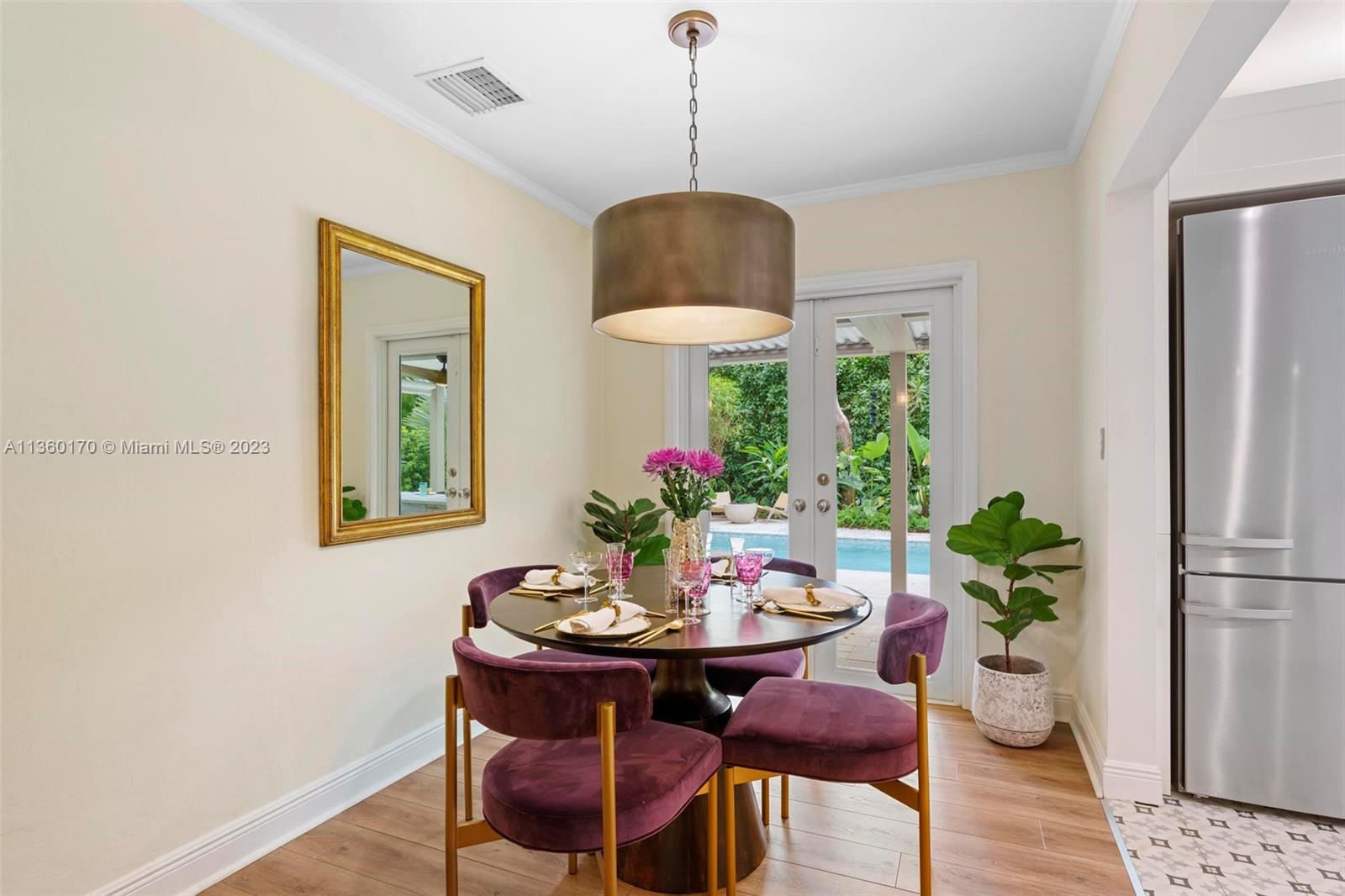 Welcome to your new home, a true tropical oasis, featuring a salt water pool where you can lavishly entertain rain or shine underneath the retractable pergola featuring a built-in outdoor grill, refrigerator and bar. Lush greenery and mature trees provide privacy and tranquility. This Coral Gables 2/1 home is a perfect blend of modern amenities and classic charm featuring a chef's kitchen; Miele appliances; quartz countertops; Waterworks bathroom fixtures; and original fireplace. The living room is bright and airy, with large windows that let in plenty of natural light. The living room seamlessly transitions into the dining area and open kitchen which is perfect for hosting family gatherings and dinner parties. Garage converted as a den/office and laundry room. New roof 2017, HVAC 2020.