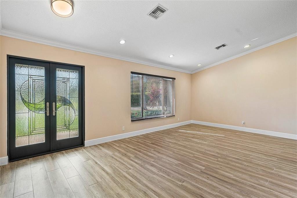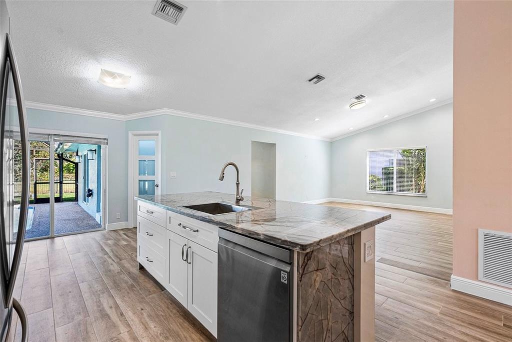 250 SF Bonus Sunroom with all impact glass! This simply Beautiful waterfront home will not disappoint. Totally & perfectly renovated with impeccable finishes and is like new Construction. Located in a highly desirable & established community with mature trees & sprawling front lawns. Impressive curb appeal with stunning custom double glass doors & manicured landscape. Offerings: New crisp white island kitchen with breathtaking quartz counters, New bathrooms, New A/C, All impact windows/doors, New flooring throughout, Security camera system Pool updated 2021, New saltwater pool pump, & more. The serene screened pool area is perfect for outdoor living/entertaining & enjoying sunsets. When the sun goes down the magic begins with new landscape lighting. Attached is a list of upgrades.