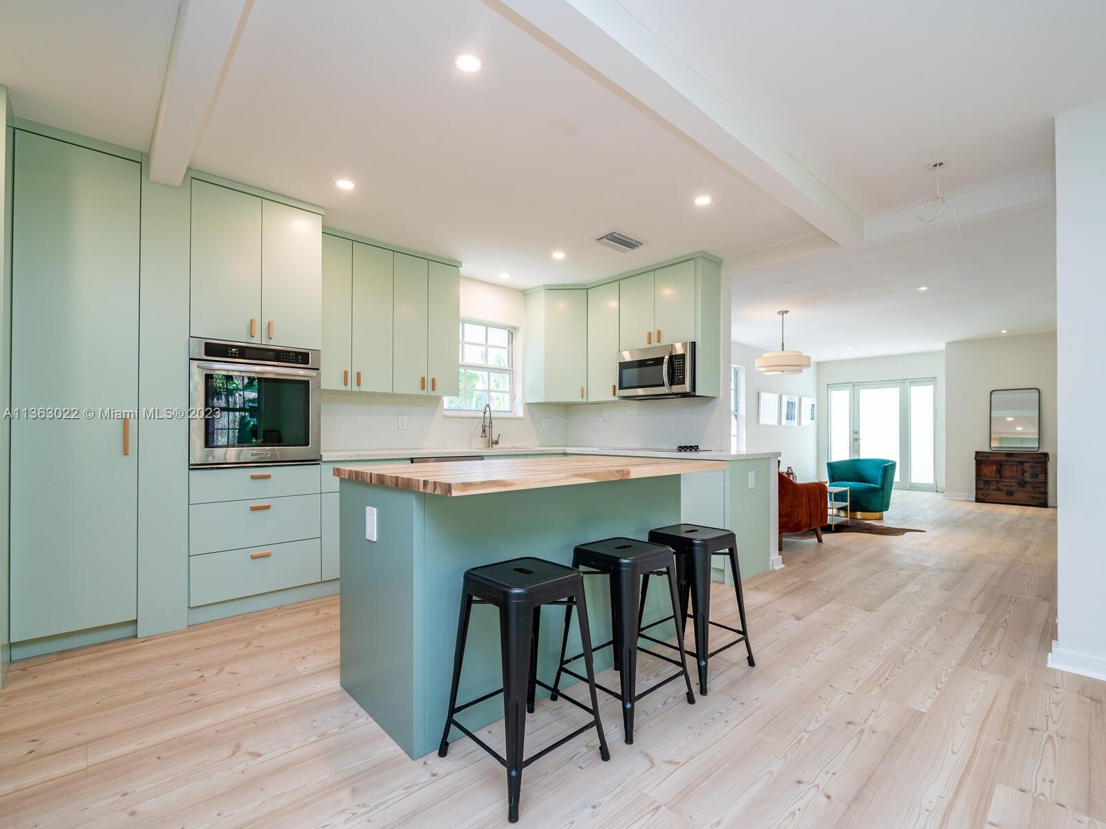 You just found your dream home in a tropical paradise in Miami Shores! Walking distance to shops & entertainment. Permitted garage conversion into 3 bed/3 bath + storage area (with a roll up garage metal door & entry pad), Spacious entrance, living, dining & TV rooms. New open plan kitchen with quartz countertops, butcher-block top island & SS appliances. Permitted plumbing & electric (2023), tile roof (2020). Seamless aluminum gutters. High quality wood-laminate water-resistant floors. Fully fitted closets & modern fans. Impact resistant windows. New single pane front door with single pane side panels. Central AC (2018). 3rd bed & bath add approx 250 sqft to the tax roll (2,000 sqft approx per seller). Wood fence. Uncovered parking in front and back. New digital 4-zone sprinkler system.