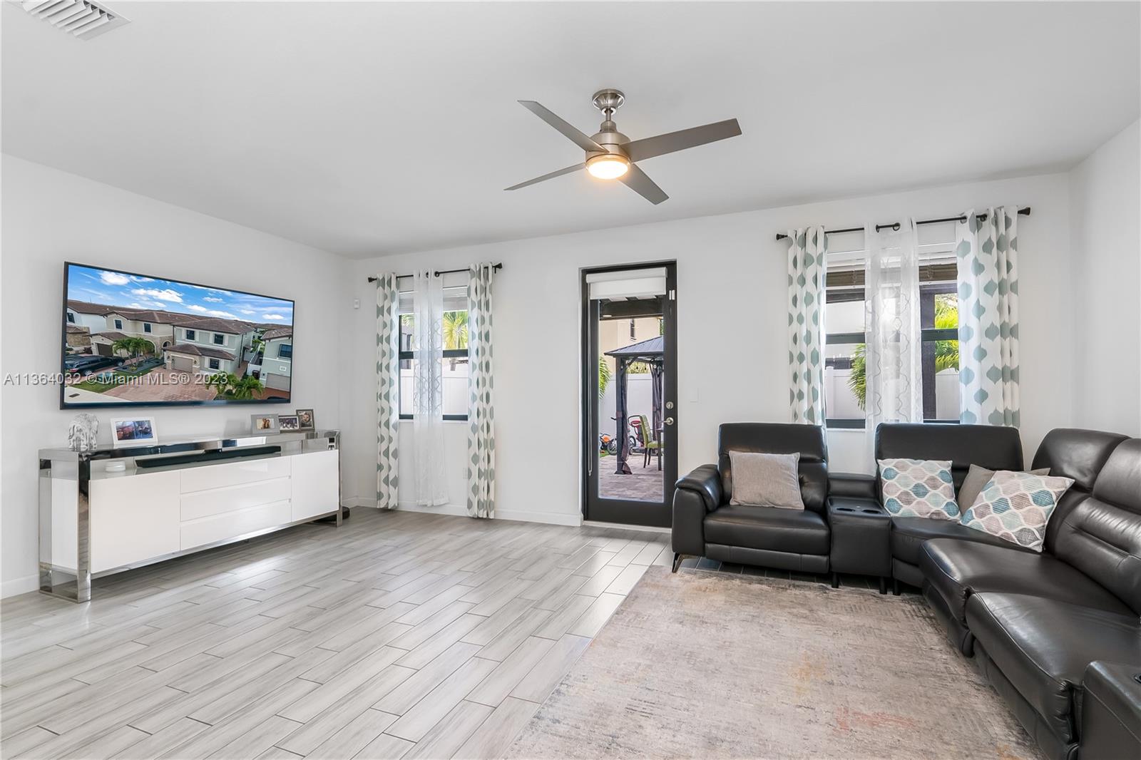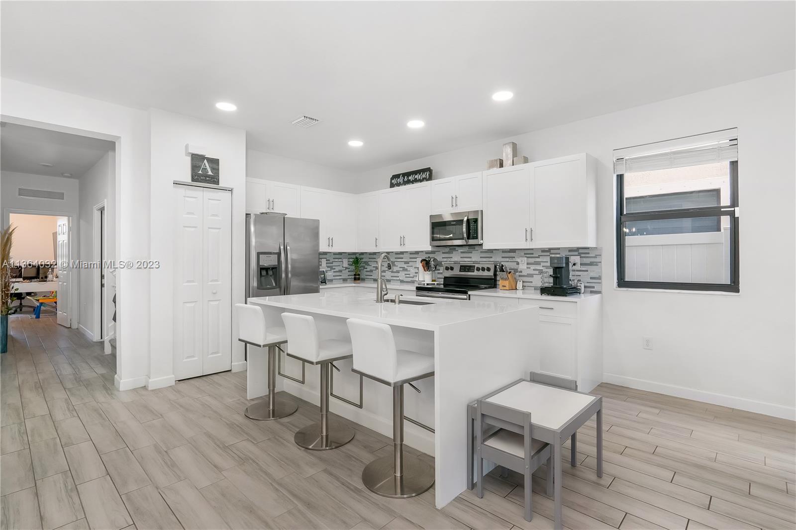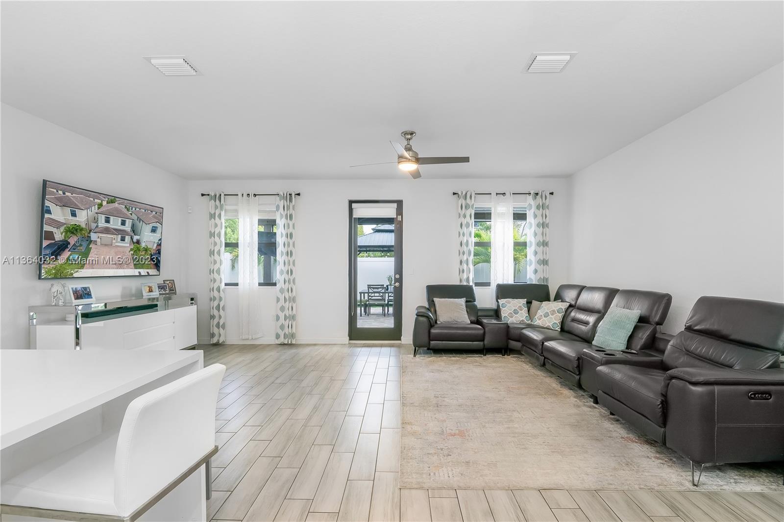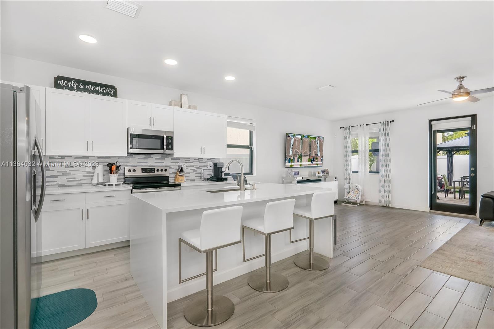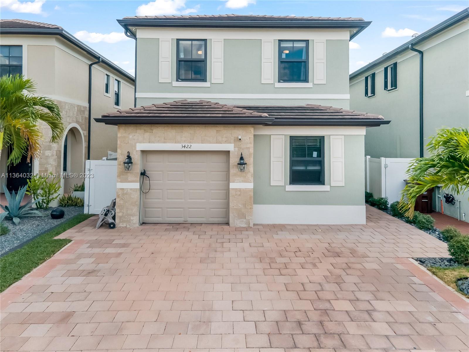 This stunning 4-bedroom, 3-bathroom house is situated in a gated community with 24-hour security. As you enter the home. The first floor boasts a conveniently located bedroom with a full bathroom, perfect for visiting guests. The impact windows throughout the house provide both security and allow natural light to flood the living spaces all day long. The expansive living room is perfect for entertaining family and friends, with a direct view of the completely fenced patio making indoor and outdoor living seamless. The kitchen is an absolute chef's dream, fully equipped with modern stainless-steel appliances and ample counter space. The second floor has a huge master bedroom/walk-in closet. In addition to all these amazing features, part of the garage has been converted into an extra room.