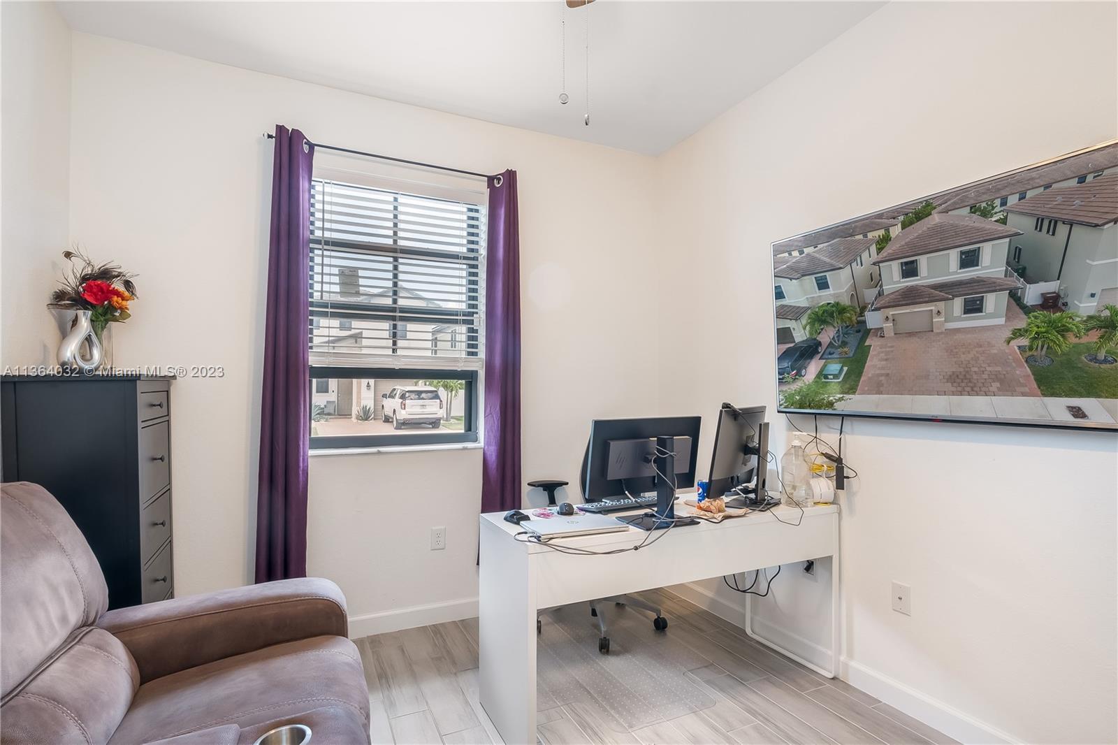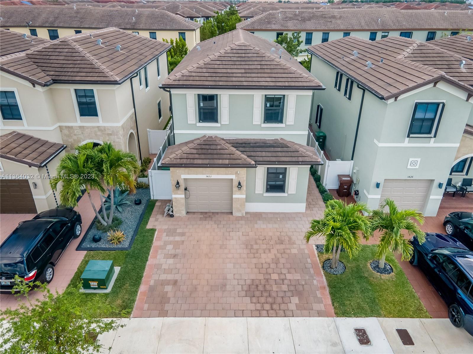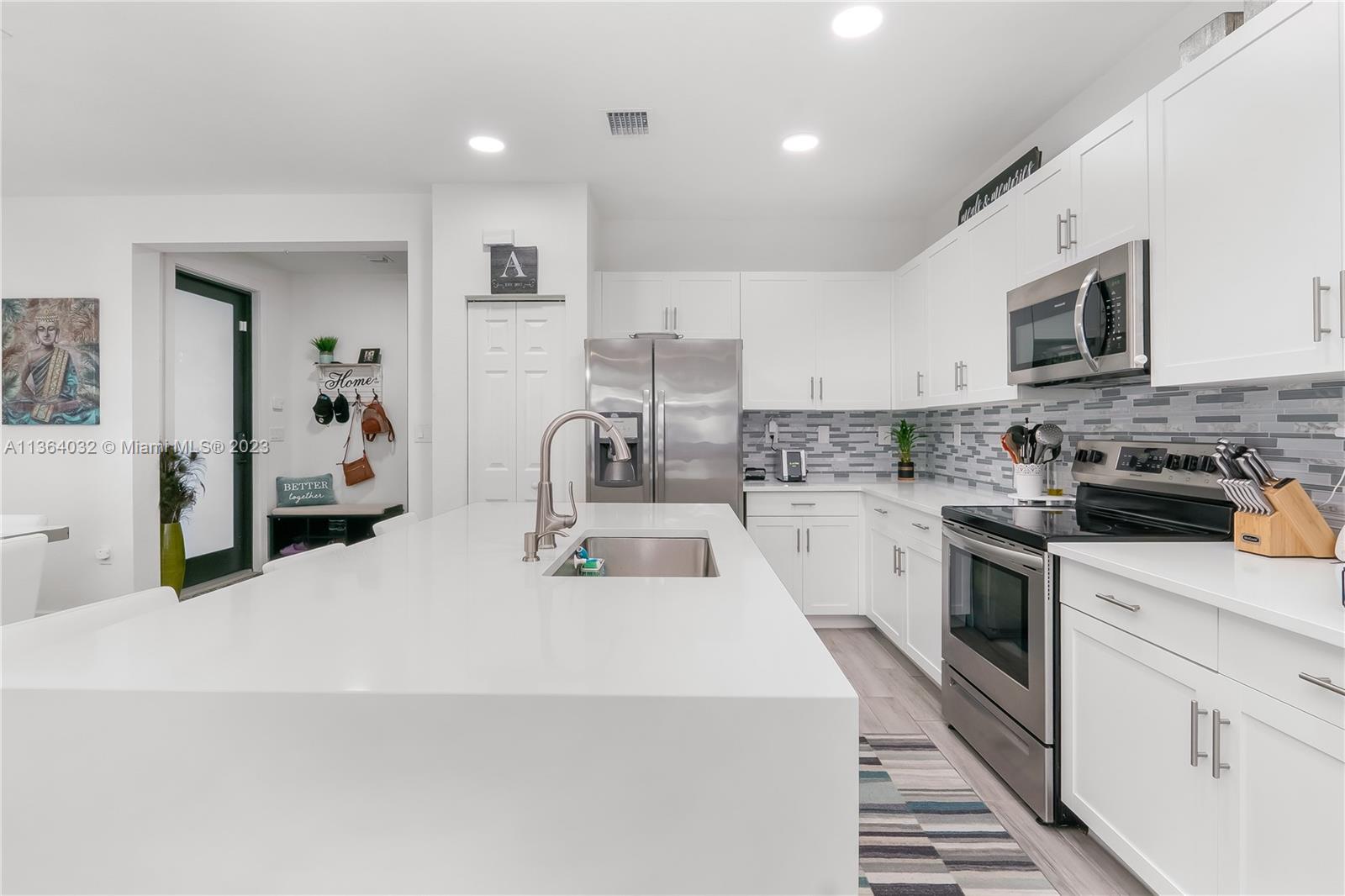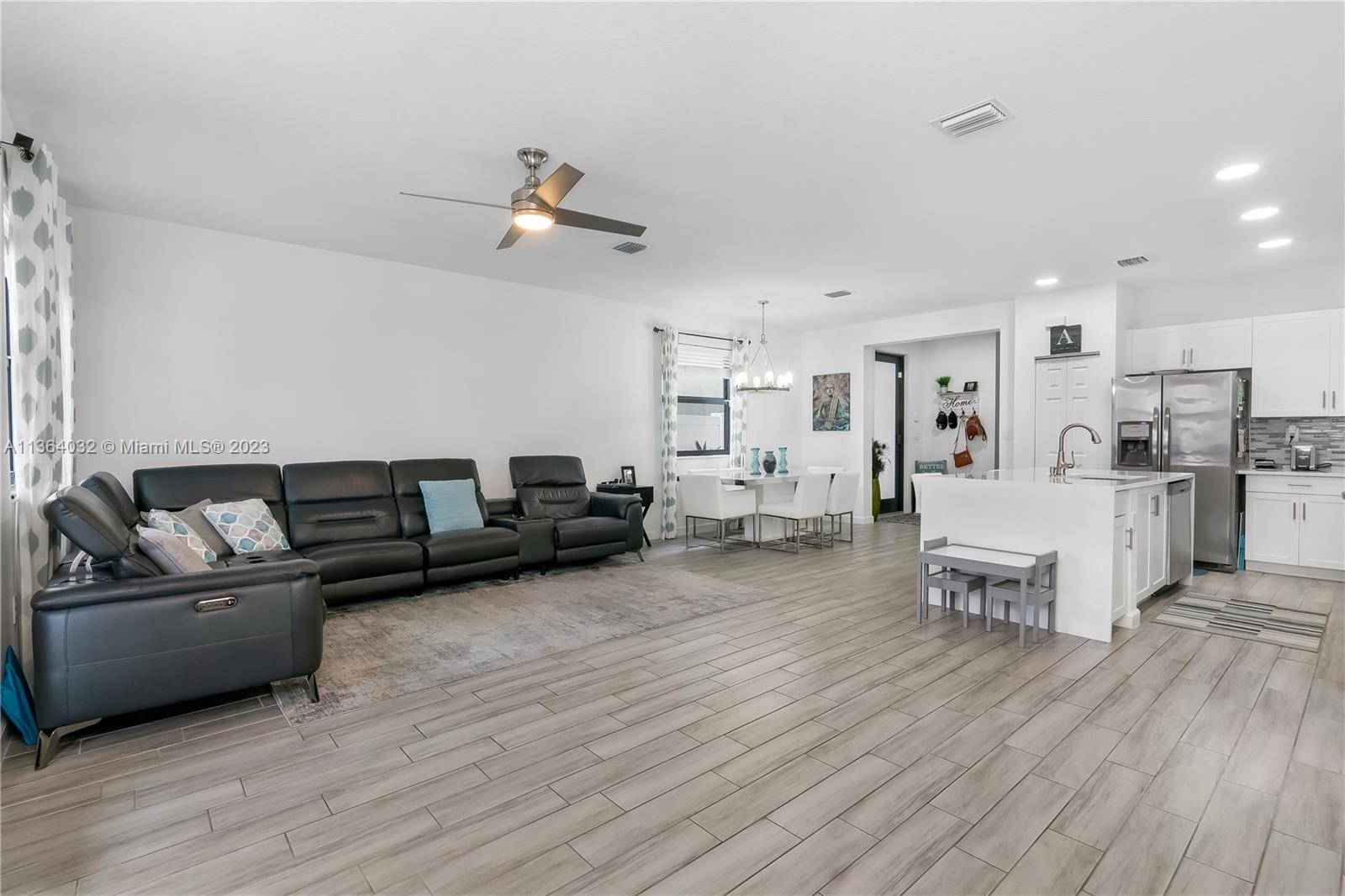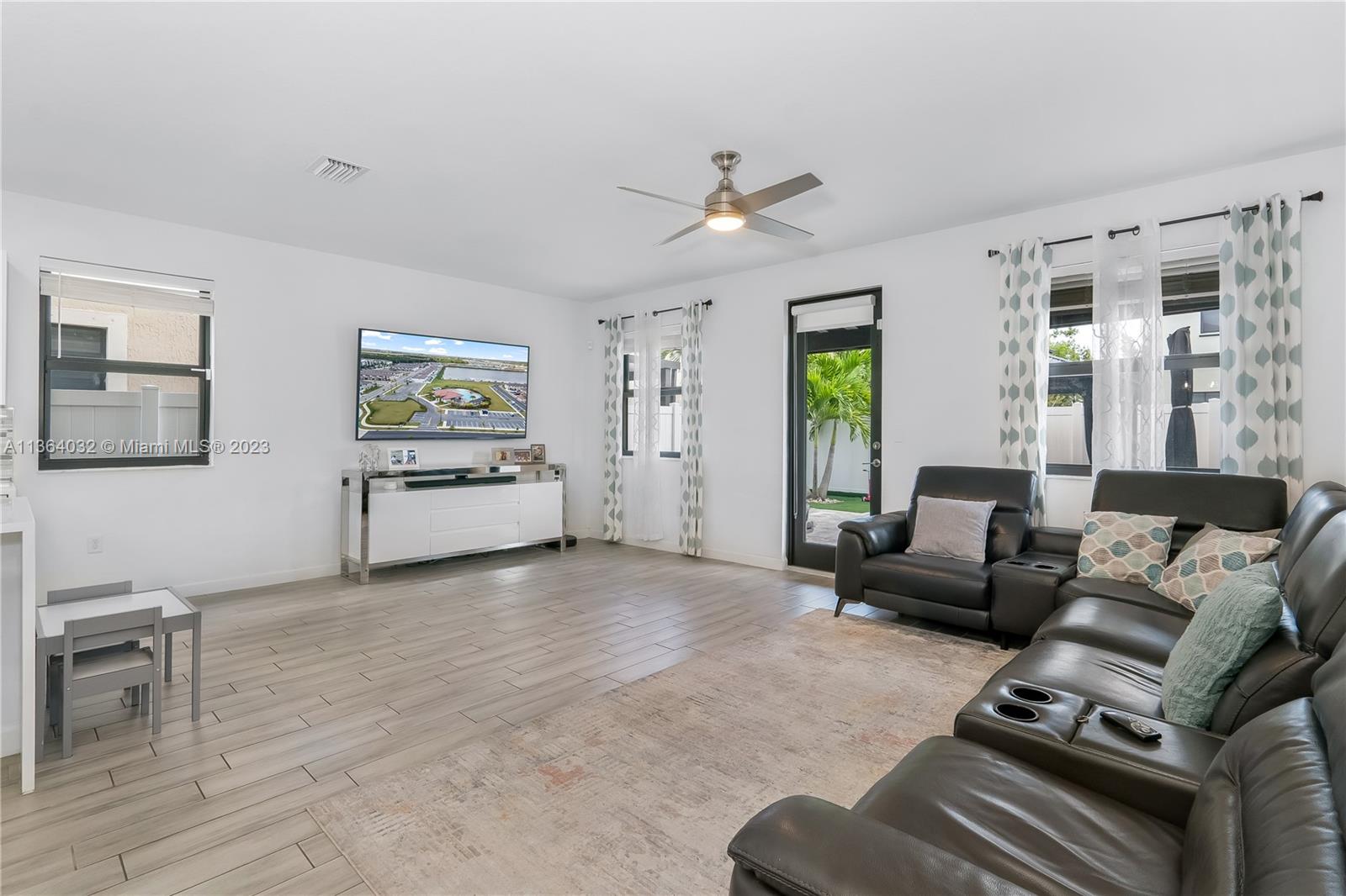This stunning 4-bedroom, 3-bathroom house is situated in a gated community with 24-hour security. As you enter the home. The first floor boasts a conveniently located bedroom with a full bathroom, perfect for visiting guests. The impact windows throughout the house provide both security and allow natural light to flood the living spaces all day long. The expansive living room is perfect for entertaining family and friends, with a direct view of the completely fenced patio making indoor and outdoor living seamless. The kitchen is an absolute chef's dream, fully equipped with modern stainless-steel appliances and ample counter space. The second floor has a huge master bedroom/walk-in closet. In addition to all these amazing features, part of the garage has been converted into an extra room.