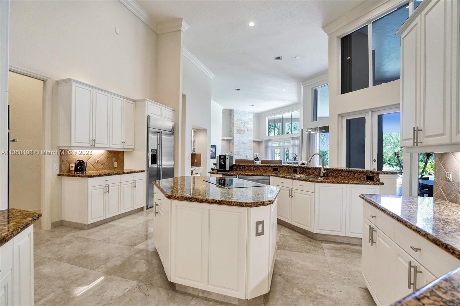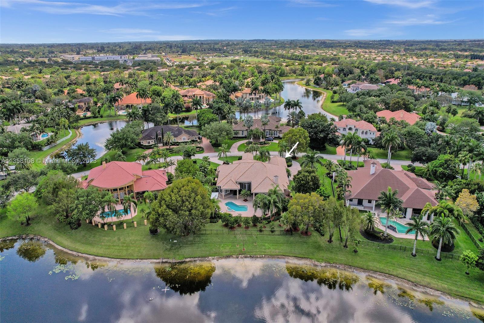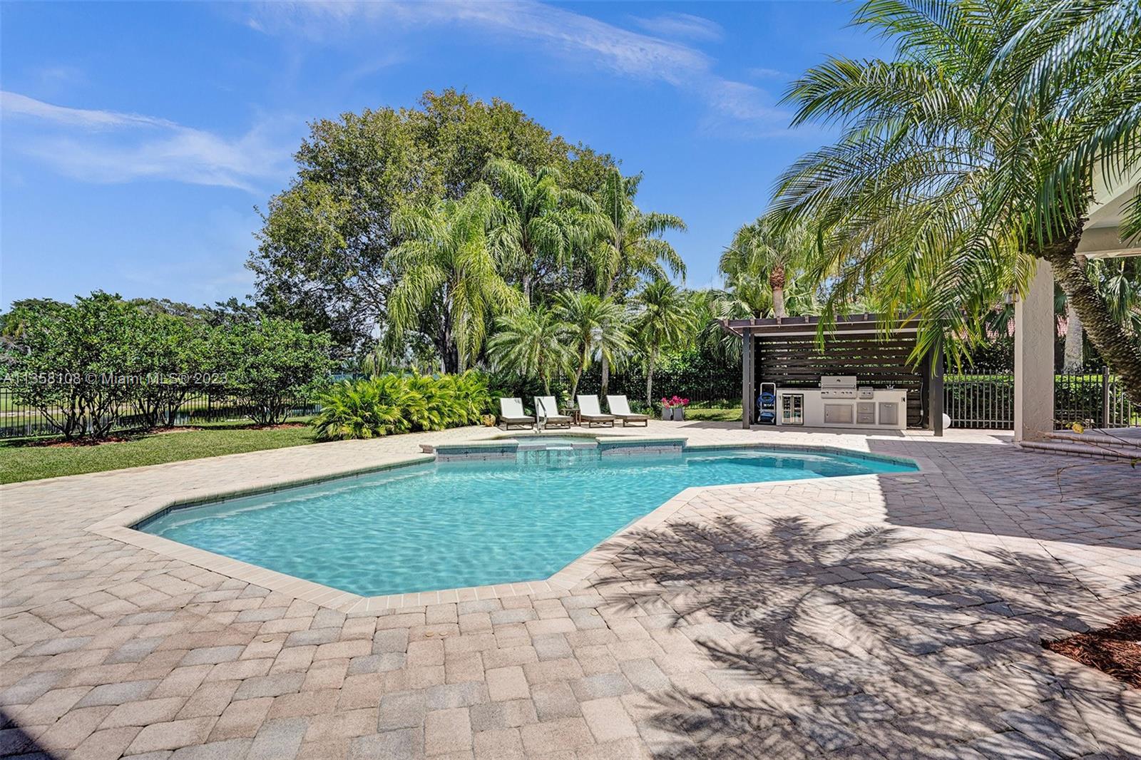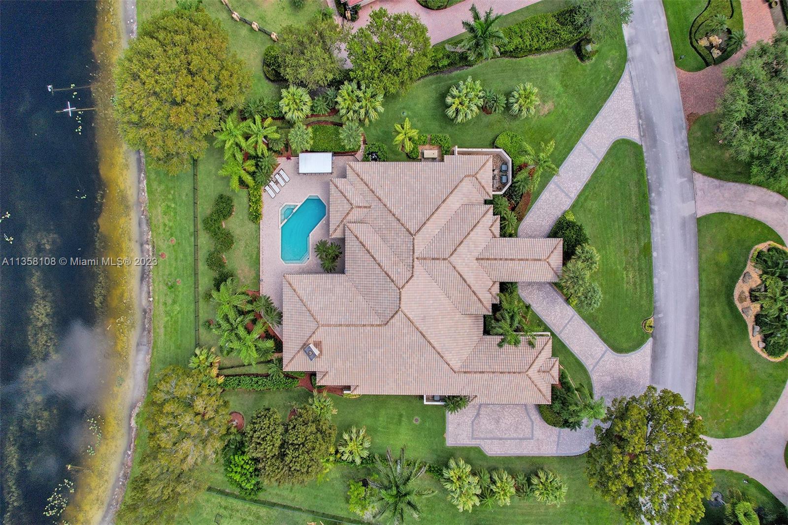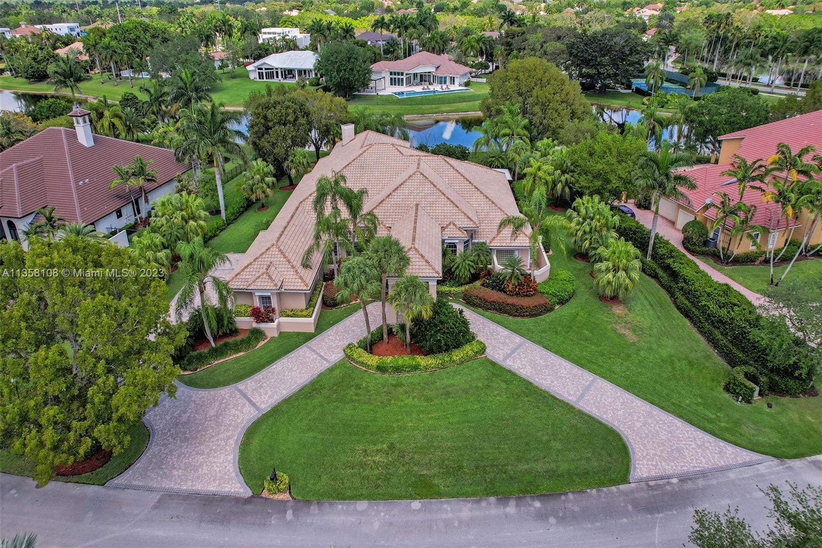 Tucked in the boutique community of Windmill Lake Estates. Stunning acreage property with 5 bed + office 5.5 bath, pool estate home. Expansive paver circular driveway w/ porte-cochere. Private water views from your custom pool w/ pavers, summer kitchen, lushly landscaped, putting green, and fully fenced. Marble throughout living areas w/ soaring ceilings, extensive crown moldings light fixtures. Gourmet white wood kitchen w/ island, breakfast bar, custom cabinetry, granite countertops, SS appliance, double ovens, oversized refrigerator, and expansive pantry. The grand owner's suite w/ sitting room, new plush carpet, and french door to patio/pool w/ sitting room custom master bath dual vanities jacuzzi tub. Full accordion/rolladen protection, newer roof. 3-car side entry with epoxy floor.