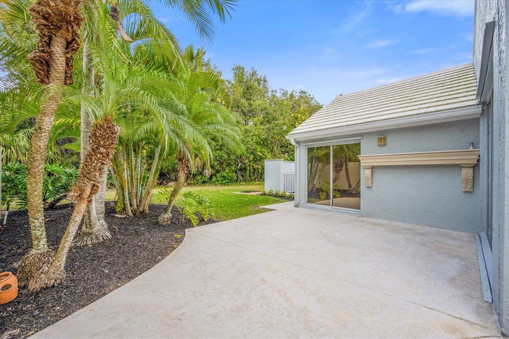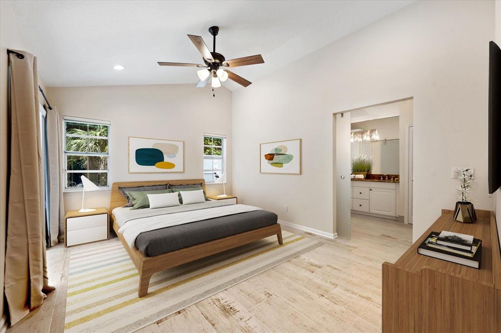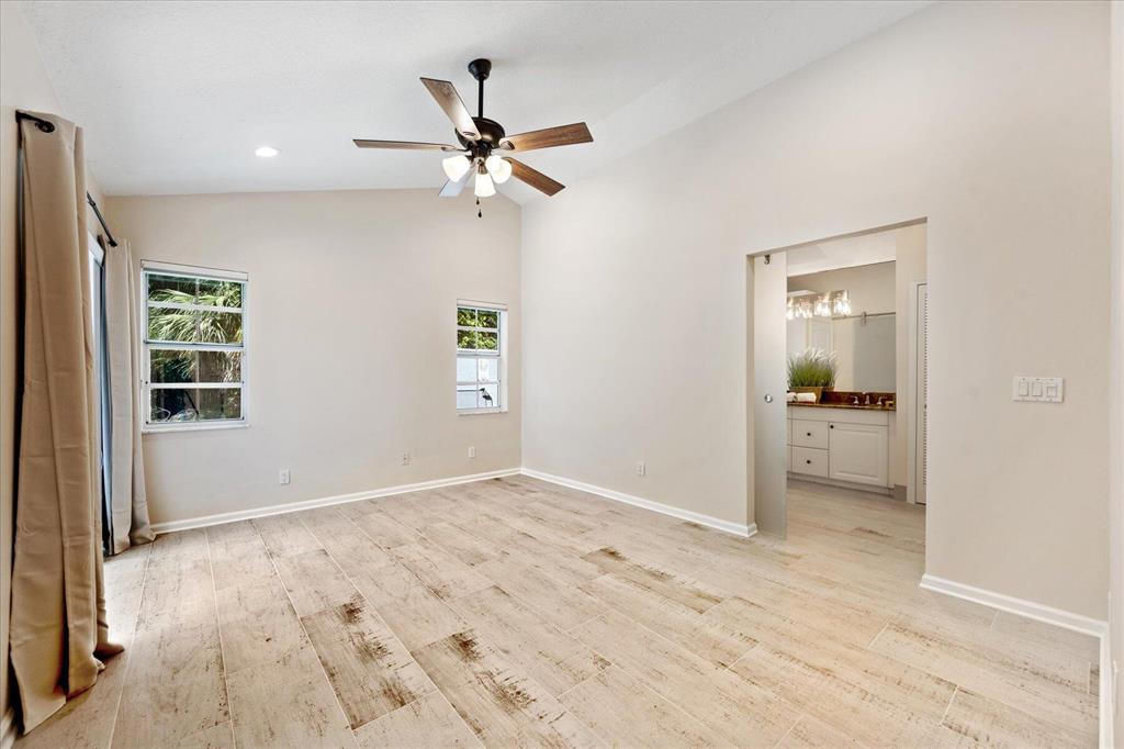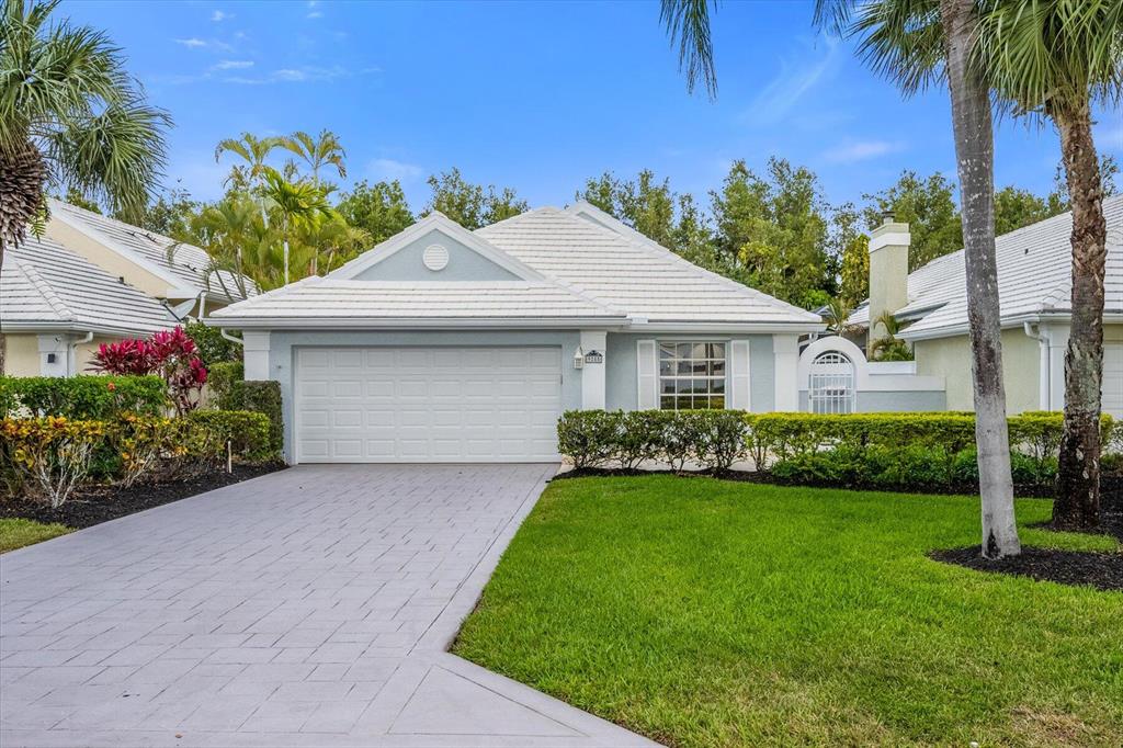 West Palm Beach's desirable gated community--Breakers West! Lovely home available in the popular Colony neighborhood with 3 Bedrooms, 2 Baths, 2 car garage with almost 1,600 AC Living Area. Freshly painted interior and exterior. New porcelain tile wood plank flooring thru out (no carpet in this house!) Great Room with vaulted ceilings opens to patio with private treed yard. Primary Suite has vaulted ceilings and will accommodate a king-size bed. Modern frosted-glass sliding barn door leads into Primary Bath with its marble vanity w/2 sinks, new frosted frameless glass shower door & lg walk-in closet. Or step out into In-Ground Spa surrounded by privacy wall. Popular split floor plan gives the 2 guest bedrooms privacy & ample space. Bedroom 2 & 3 share a lovely bath with tub/shower combo.