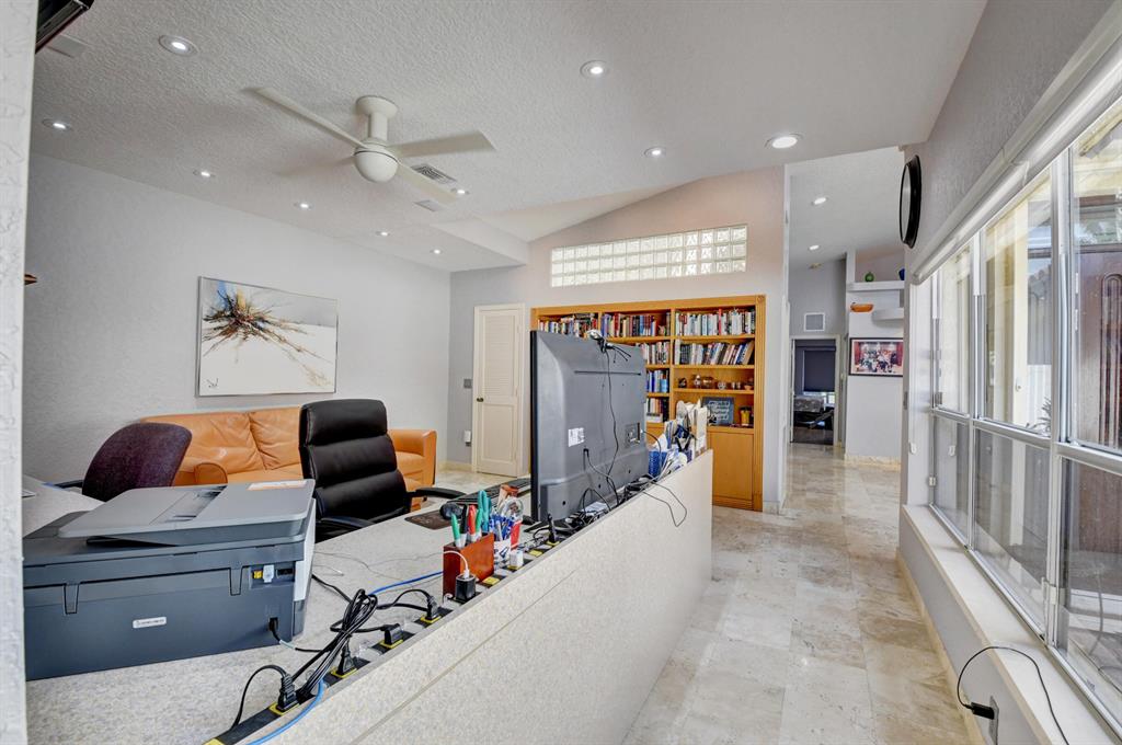 Owner is a real estate-Broker This one-story house with a full view of the large pond in the back. The refurbished (2022) pool is enclosed in a screened patio and there are over 100 orchids in the pool area and on ornamental trees. Open concept with no obstructions. The office/den can be converted to the 3rd bedroom. All three bathrooms have been improved with ceramic floors, new cabinets and fixtures. Generator is full house (2021) LP gas appliance (water heater, dryer, grille, stove). Washer and Dryer (white) and kitchen s/s appliance new 2020-1. Hurricane sliding panel shutters offers total protection. Travertine floor in the main area with laminated wood in the two full bedrooms.