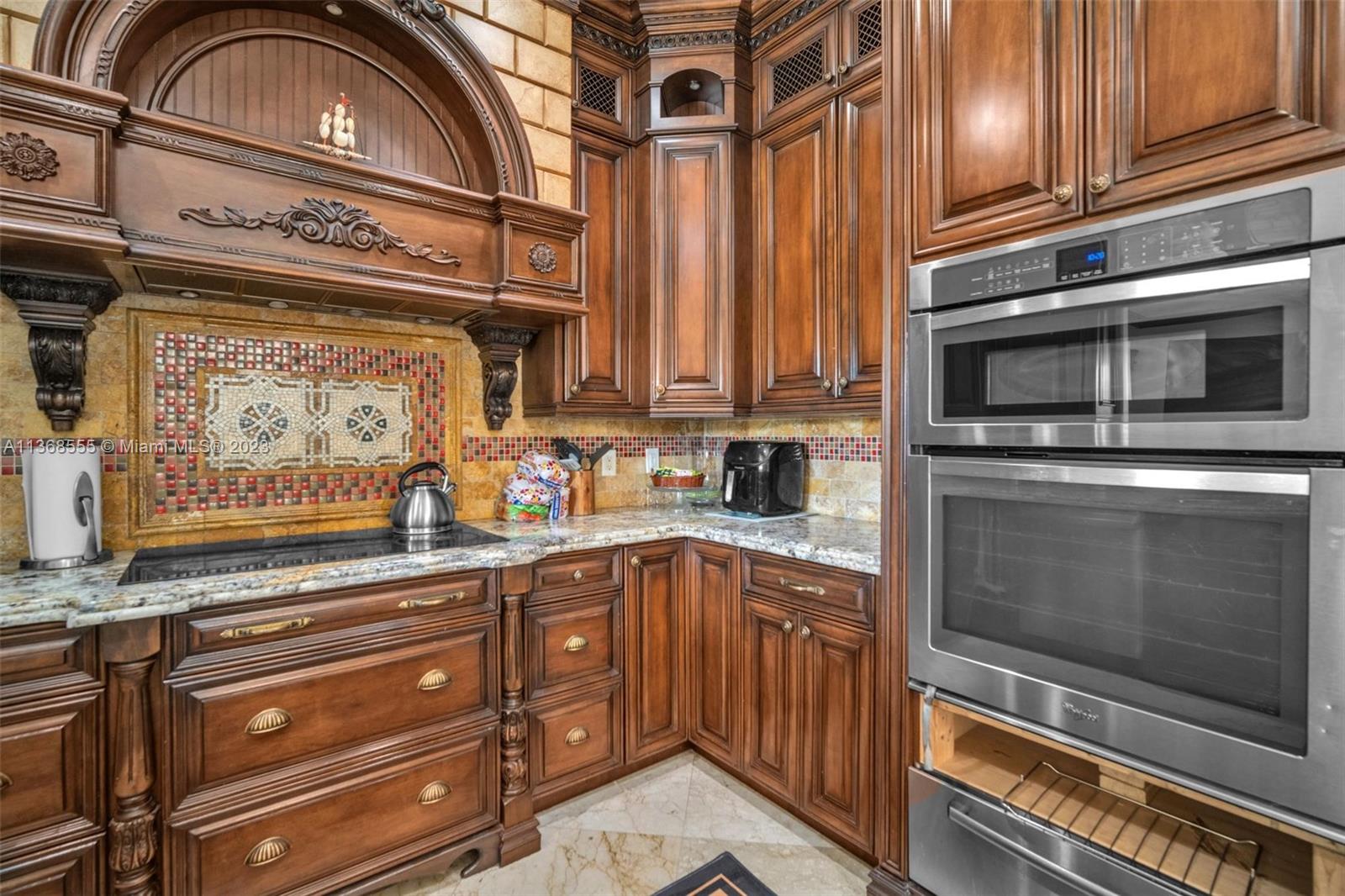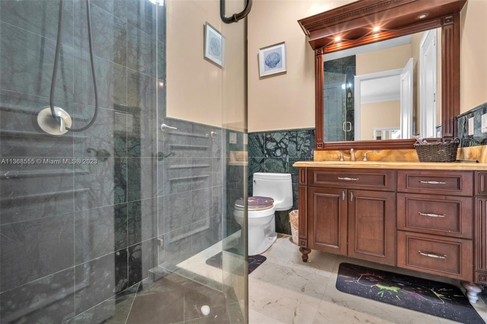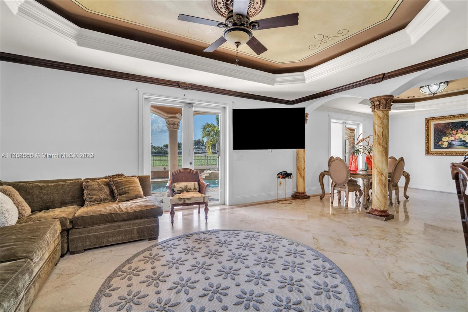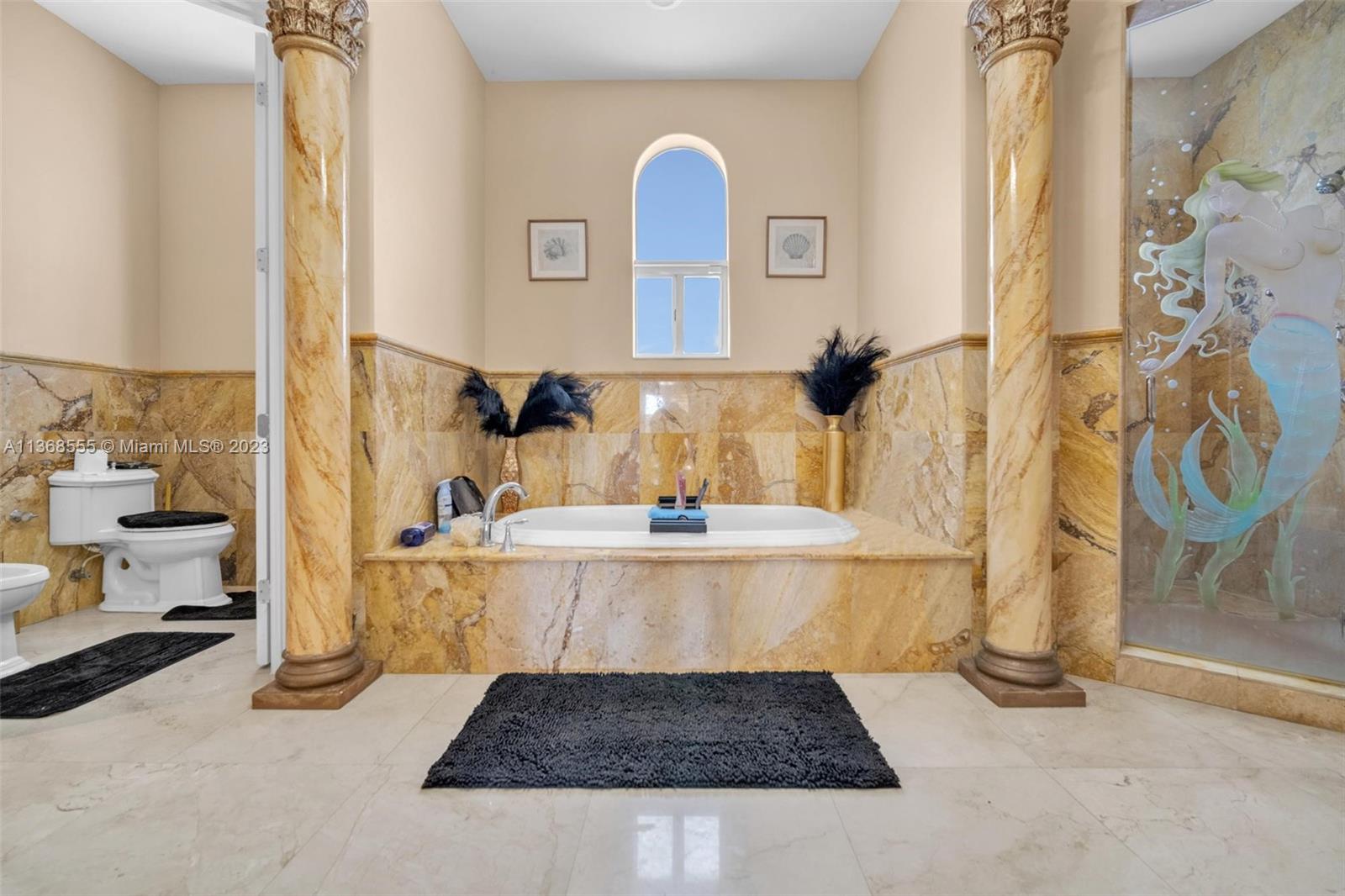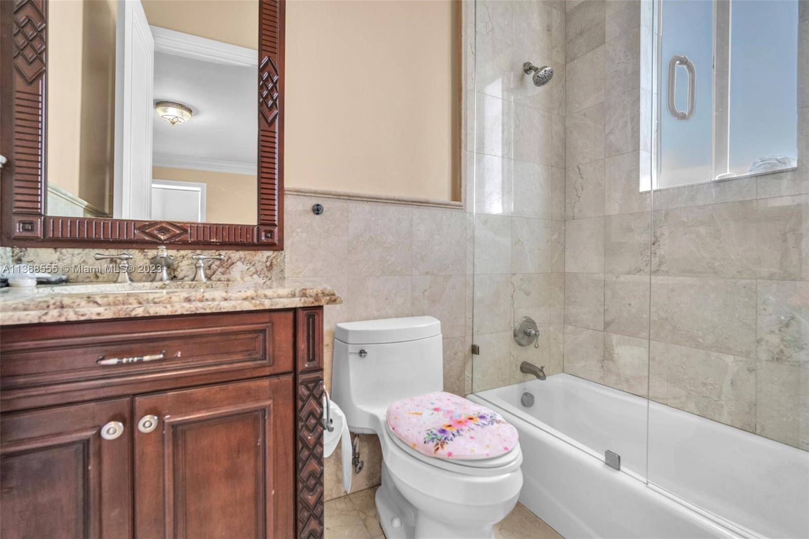 Luxury and elegance throughout this 2-story jewel! Resort style home includes pool & jacuzzi. Watch the sun set. A breath-taking view of the Country Club of Miami Golf Course. The picturesque detail on the ceilings complements the marble floors throughout the home. Custom cabinetries adore the walls of the kitchen which is adjacent to a spacious formal dining area. Each bedroom is oversized and accommodates family members with private bathrooms. This split-level floor plan also has a full downstairs bedroom for your guest to enjoy. Experience sophistication at its best as you open custom French doors leading to an extraordinary huge upstairs master bedroom with an enormous sitting area and equally large bathroom. Large balcony. Welcome home, this is a must-see property!