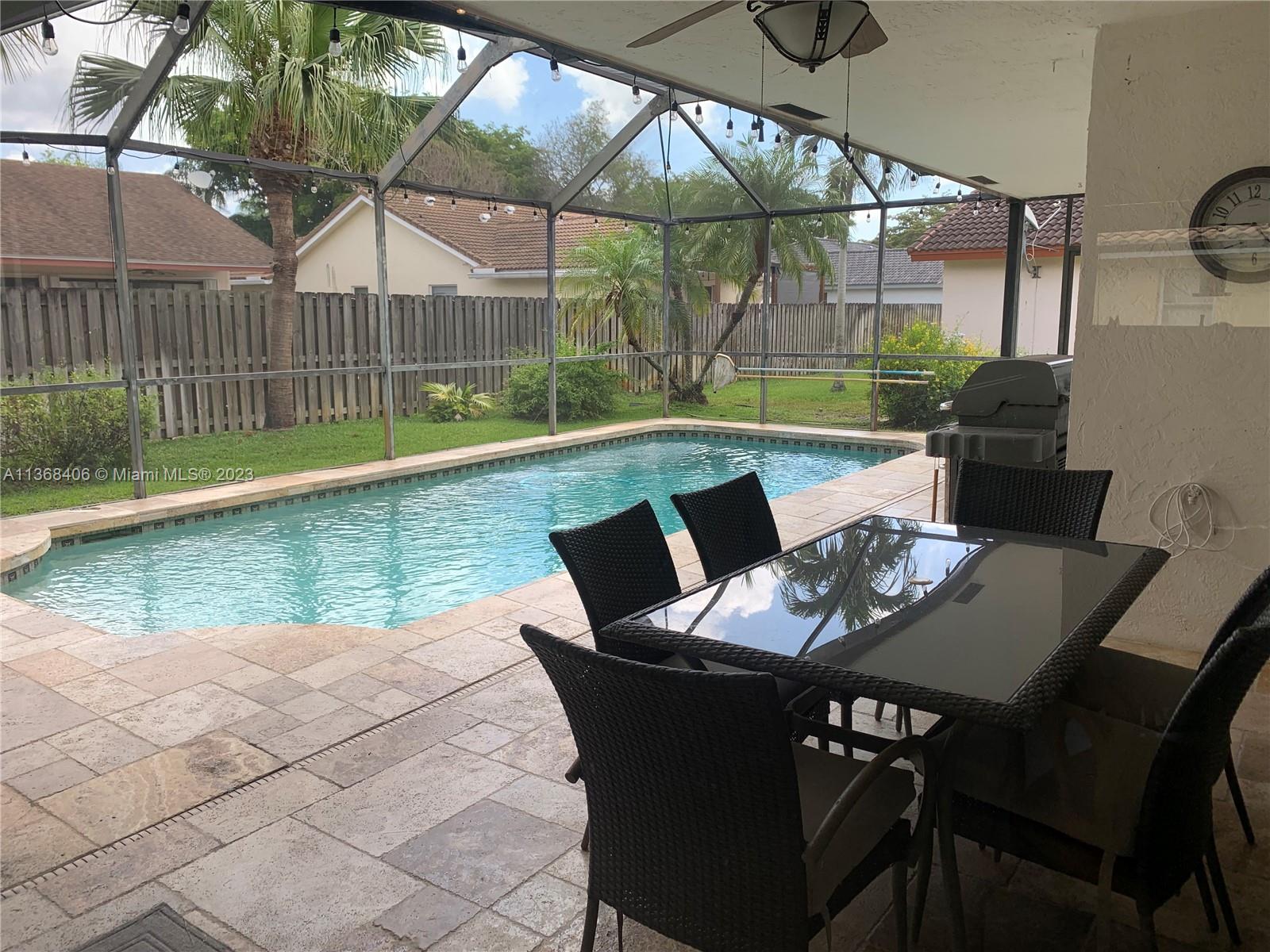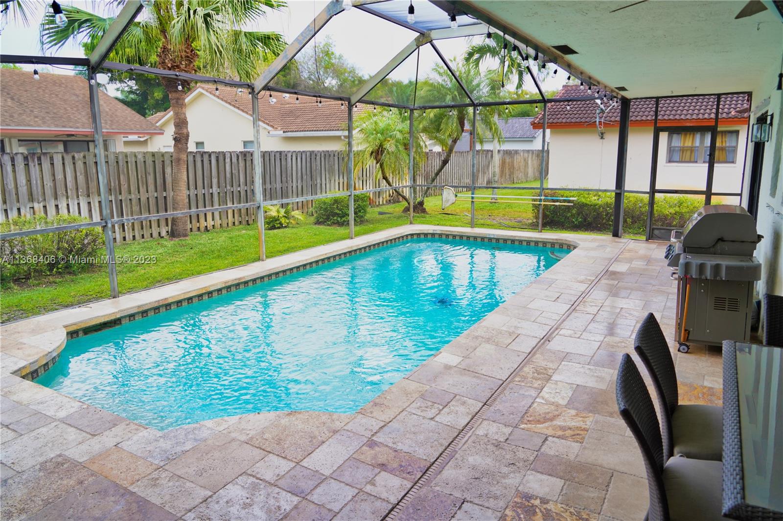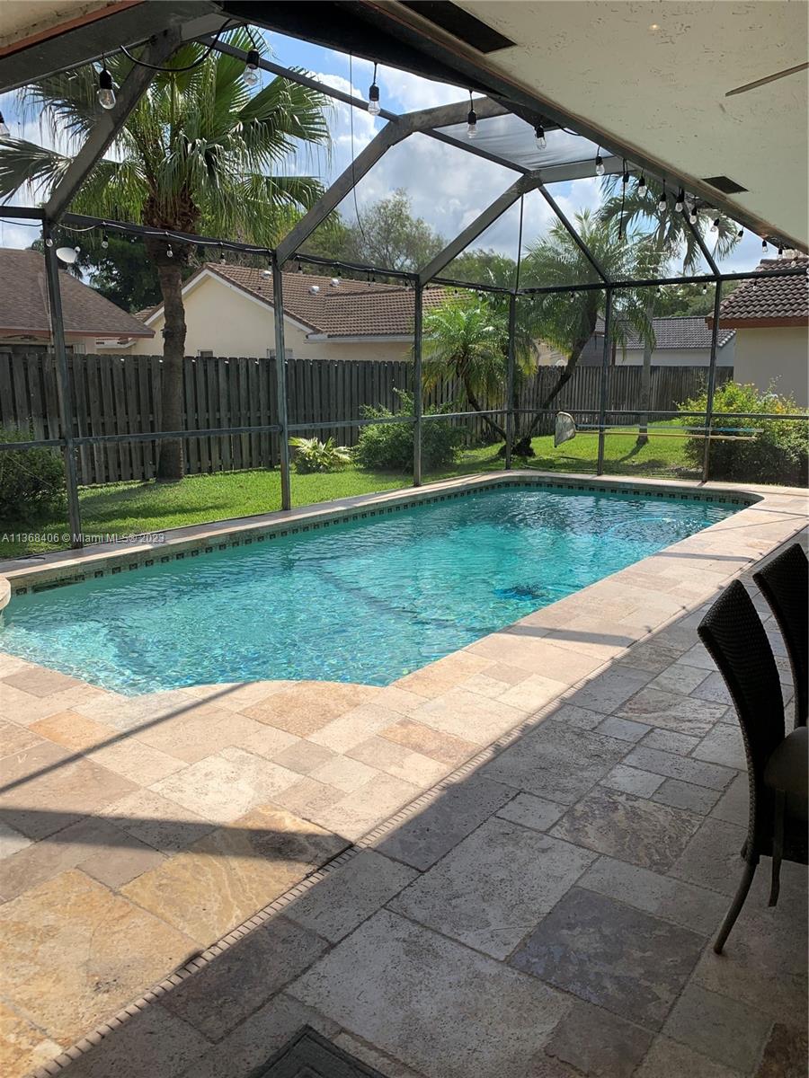 Amazing opportunity to own this beauty featuring four bedrooms, two baths and pool! Porcelain tile throughout and freshly painted, the interior features wood soft-close cabinetry with granite countertops and newly installed stainless steel refrigerator, dishwasher, microwave & garbage disposal. Recent updates also include new washer & dryer, Carrier a/c, garage door opener and mailbox! On cooler nights, enjoy a large, woodburning fireplace with new mantle in the family room! The backyard boasts a sparkling pool surrounded by travertine tile, newer pool pump and coconut trees with a sprinkler system throughout, recently pressure cleaned roof and driveway! All windows featuring Accordian shutters & exterior doors include aluminum hurricane panels for full insurance discounts.
