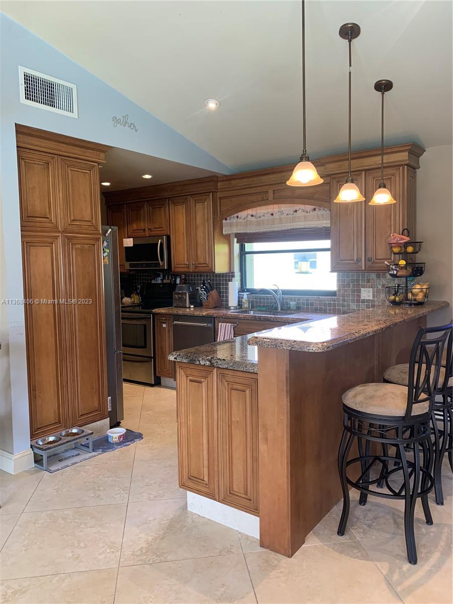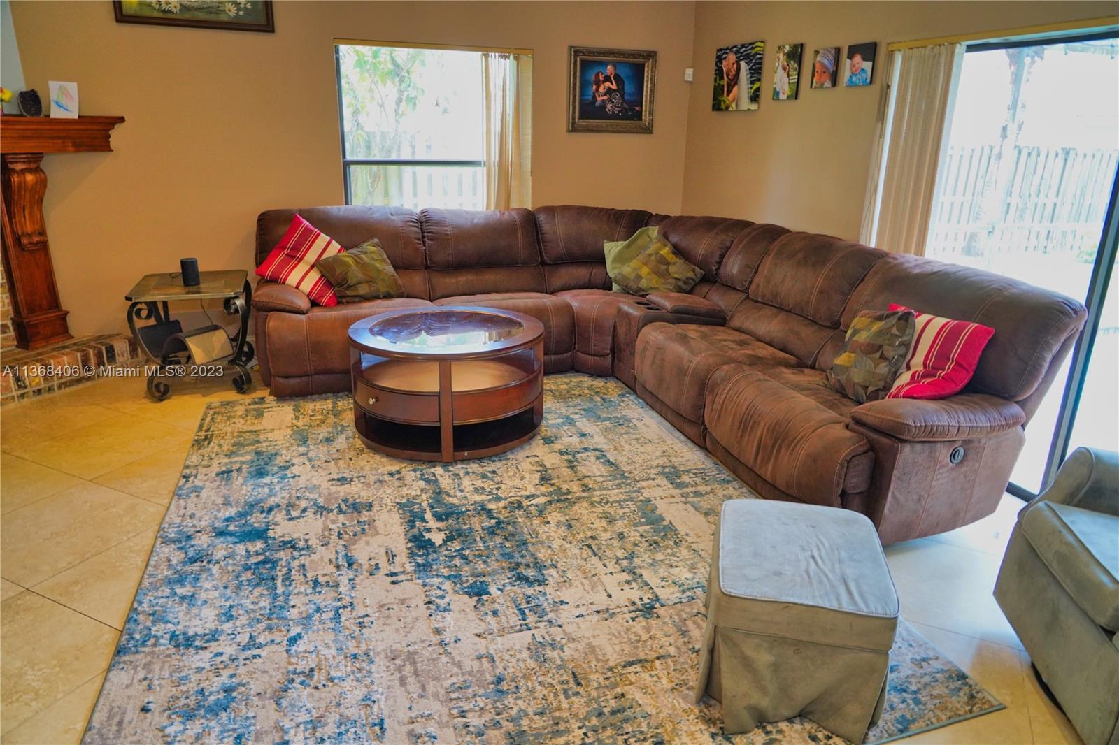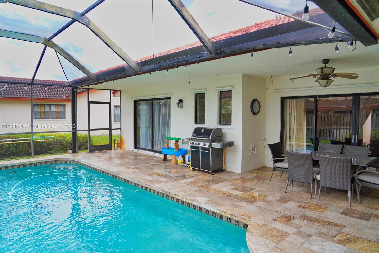 Amazing opportunity to own this beauty featuring four bedrooms, two baths and pool! Porcelain tile throughout and freshly painted, the interior features wood soft-close cabinetry with granite countertops and newly installed stainless steel refrigerator, dishwasher, microwave & garbage disposal. Recent updates also include new washer & dryer, Carrier a/c, garage door opener and mailbox! On cooler nights, enjoy a large, woodburning fireplace with new mantle in the family room! The backyard boasts a sparkling pool surrounded by travertine tile, newer pool pump and coconut trees with a sprinkler system throughout, recently pressure cleaned roof and driveway! All windows featuring Accordian shutters & exterior doors include aluminum hurricane panels for full insurance discounts.