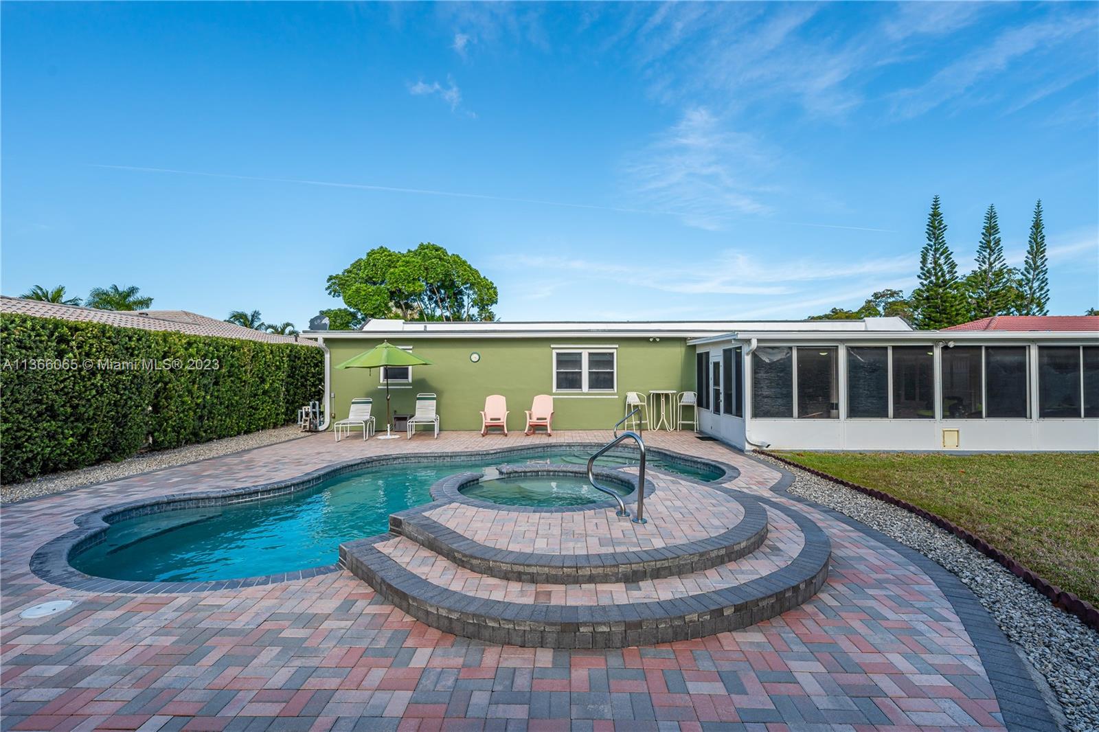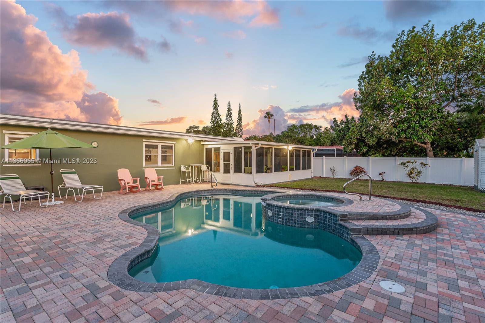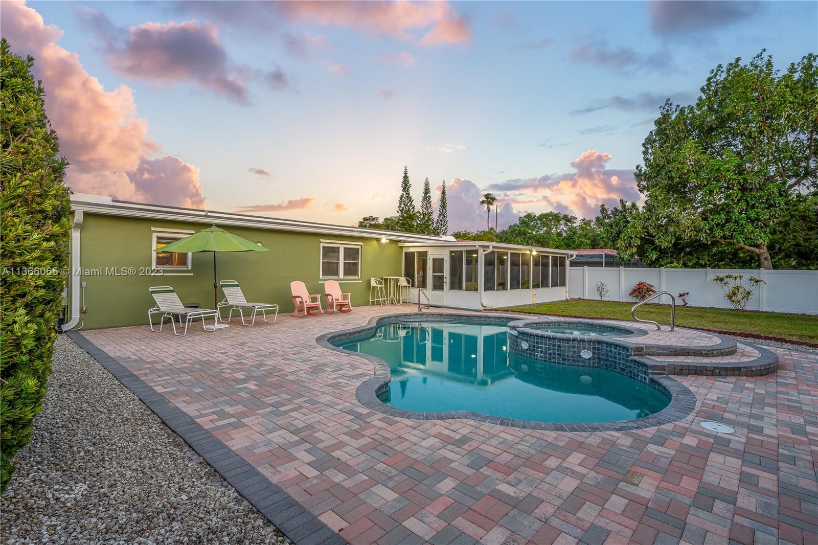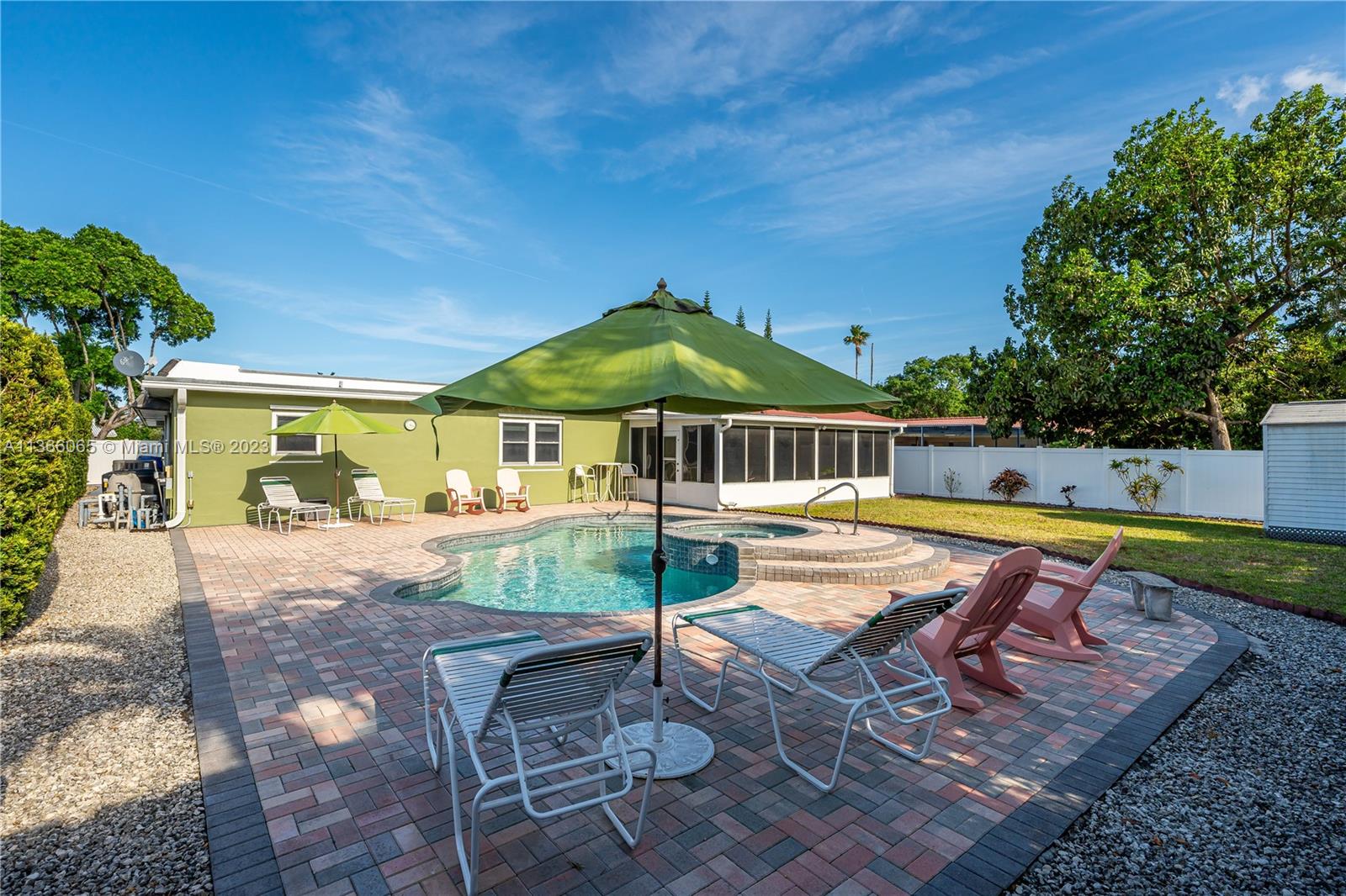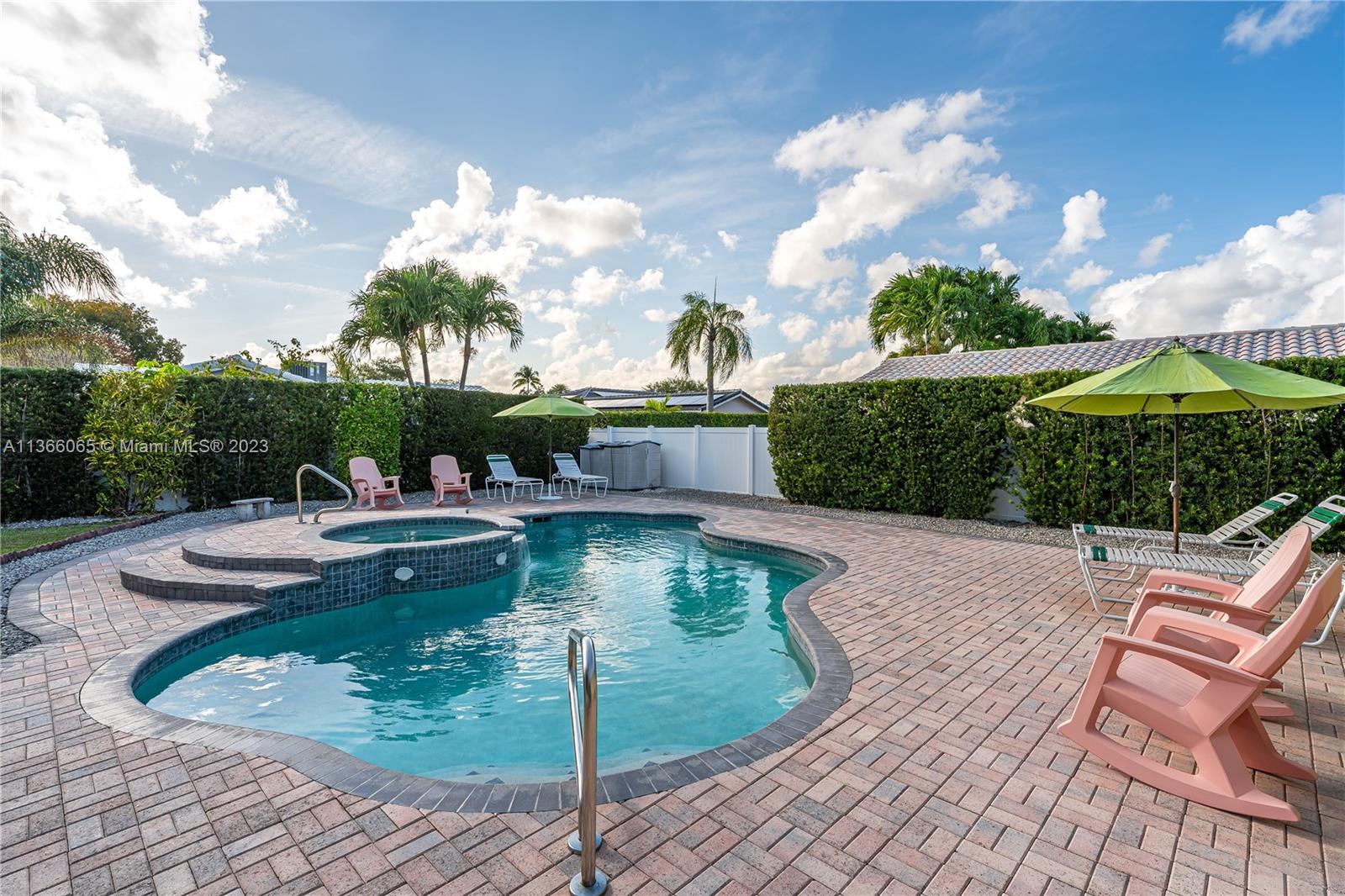 If you like to ENTERTAIN.... this ONE STORY 4 bedrooms 2 baths SINGLE FAMILY w/ Salt Water HEATED POOL & JACUZZI is for YOU!! Sitting on MORE THAN 1/4 acre, this home w/ green space, PVC FENCE, ENCLOSED FLORIDA ROOM, Sprinkler System, 2 car garage, extra freezer & GIGANTIC PAVED CIRCULAR DRIVEWAY will take your breath away! This house has it all: HURRICANE IMPACT WINDOWS AND DOORS including garage door, LARGE & MODERN KITCHEN, STAINLESS STEEL APPLIANCES with extra oven, PORCELAIN TILE in all areas except kitchen, dining & enclosed patio which has epoxy. Roof was replaced in 2012. Propane GENERATOR for all the house installed in 2018. AC was replaced in 2021. Pool Pump was replaced on 2020. Both Bathrooms have been remodeled as well. Basically OVER 12,237 sq.ft. of perfection & NO HOA!