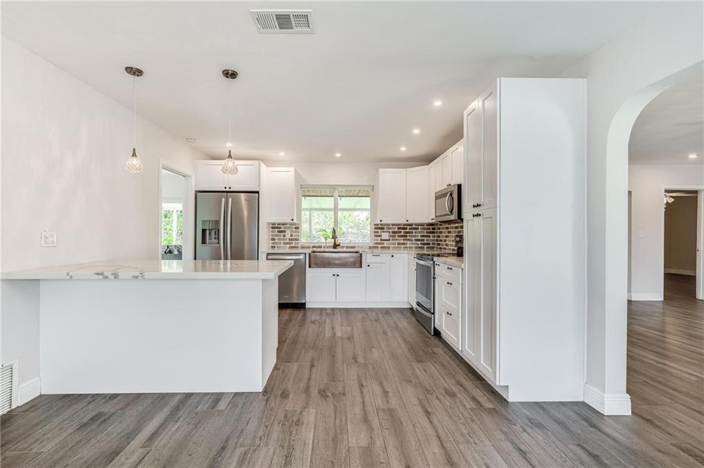 This stunning home in Pasadena Lakes has been thoughtfully remodeled from floor to ceiling, boasting over $100k in upgrades to create a luxurious living experience. The custom kitchen features top-of-the-line upgrades, including beautiful wood cabinetry, sparkling quartz counter tops, and a full set of Whirlpool appliances, including a range, refrigerator, dishwasher and microwave. The wood plank tile floors throughout and new impact windows and doors provide a sleek and stylish look, while the roof replacement in 2018, new A/C in 2019, and replacement of the underground plumbing ensure that the home is fully functional, worry-free, and truly like new. This home is ideally located within walking distance of a park and elem school. Don't miss the opportunity to see this home for yourself!