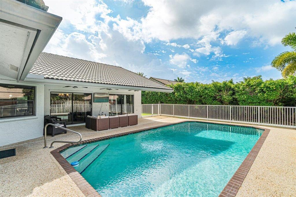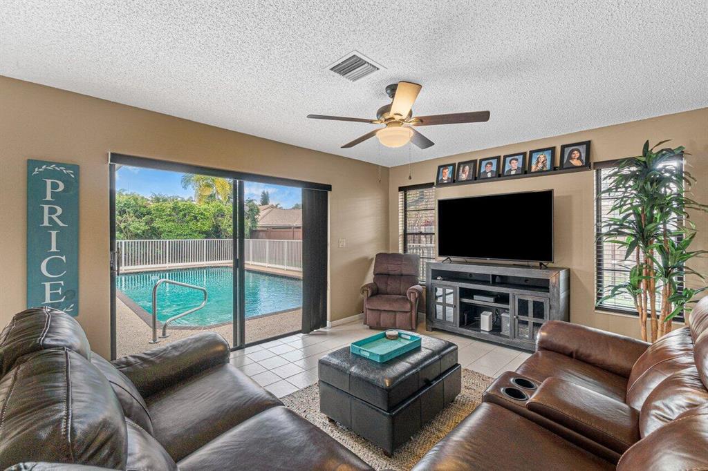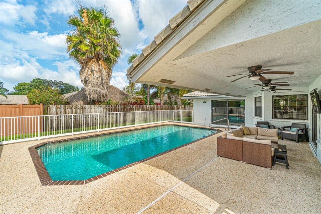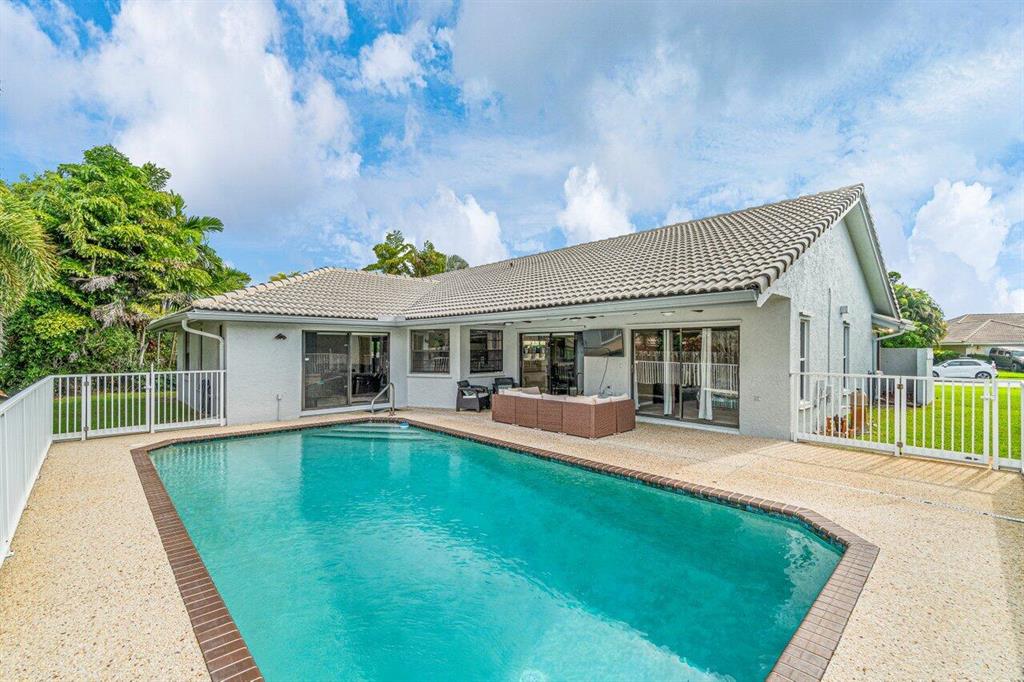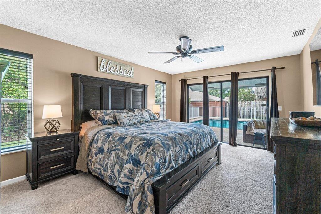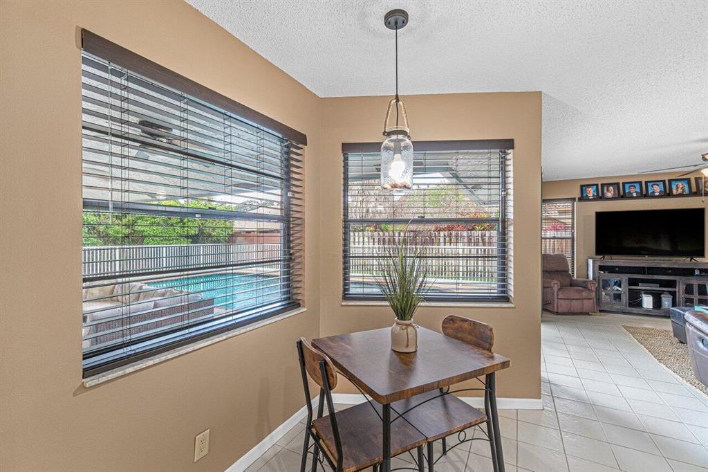 Don't miss this charming home with a spacious floor plan. The living room features volume ceilings and plenty of natural light. Flowing into the dining room, there is a convenient wet bar that offers additional storage and makes it a great spot to entertain. The kitchen has an eat-in breakfast area and is open to the family room for full connectivity. The split floor plan allows the primary suite to be situated on its own for maximum privacy. The primary bedroom has access to the outdoor patio space, a walk-in closet, and a spacious bathroom with separate tub. The three other bedrooms share a full bathroom and an additional powder bathroom. Outside, a covered patio is a great spot to relax or dine outdoors as you enjoy your pool. A laundry room and a two car garage complete this home.
