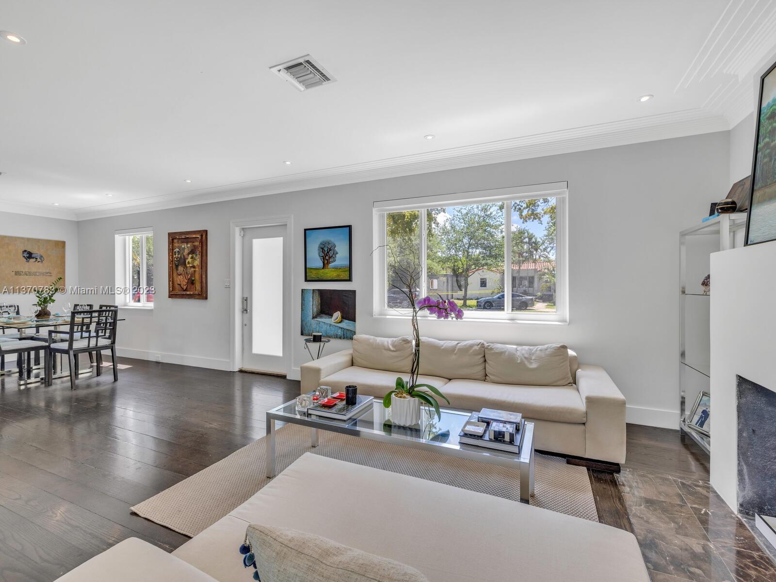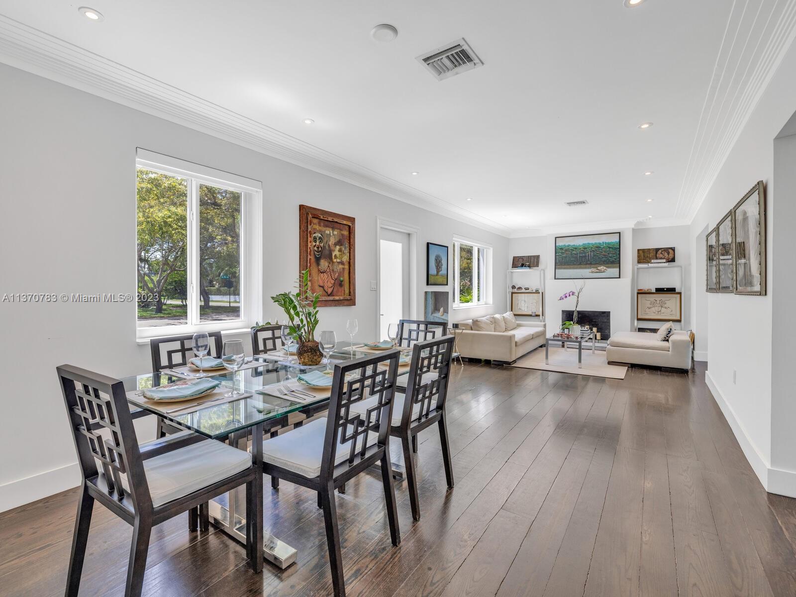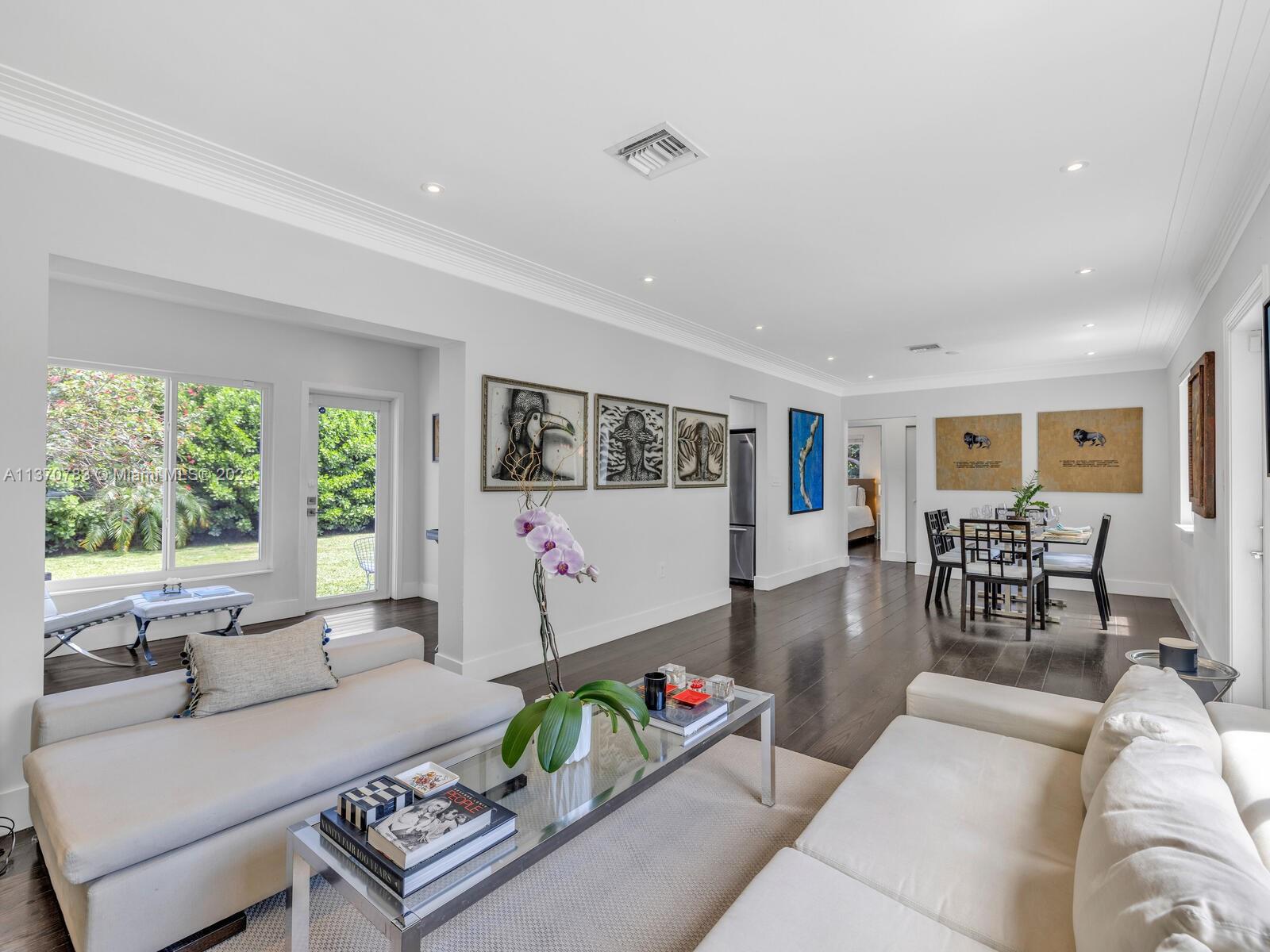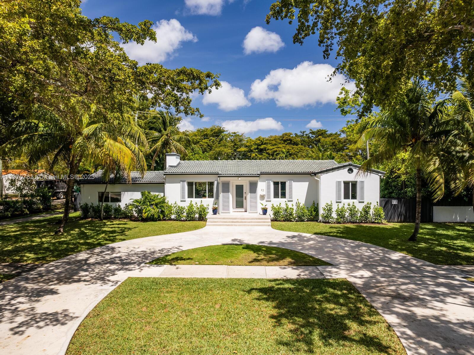 Welcome to Villa Esquina! Live large in this artfully updated Miami Shores retreat home on a large tree-lined corner lot. Arriving home is a breeze, thanks to the welcoming circular driveway and plentiful guest parking. Enter into the grand great room with layered Art Deco waterfall tray cut ceiling and multiple spaces for living and relaxing. An entertainer’s delight, with a modern designer kitchen and bright sunroom opening to lush private rear gardens and entertainment patio. Extra privacy with a split bedroom plan, including the secluded west wing main suite retreat, with vaulted ceilings, walk-in closet, and spa-like bath. Great features: beautiful wood plank floors, impact windows-doors, updated kitchen-baths, laundry room, and room for a pool. This signature corner home has it all!