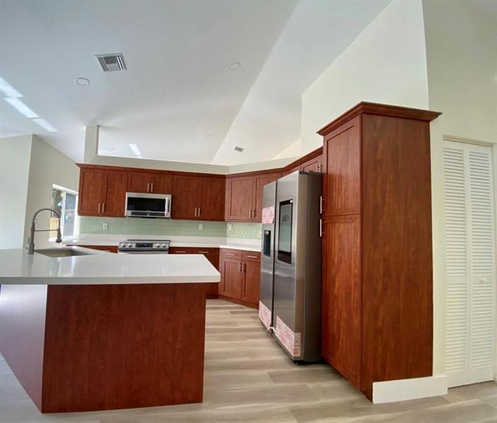 EXCELLENT LOCATION !!!! the heart of plantation, sunset cove one of the best and quietest condominiums.3 bedrooms 2 bathrooms, it has a 24 hours guard controlled entrance,completely remodeled, it has waterproof vinyl laminates floors throughout the house, nice open kitchen with island granite countertops, and large spaces with lots of light,stainless steel appliances, wifi refrigerator, and the main lock works with wifi. large remodeled bathrooms have a sound system activated by bluetooth,new roof with only 3 years, and best of all this property has latest generation solar panels. in an open plan we have the living room and dining room with lots of light and beautiful views to the garden that is fully fenced and with a large wooden deck and 2 car garage + parking for 4 more cars outside.