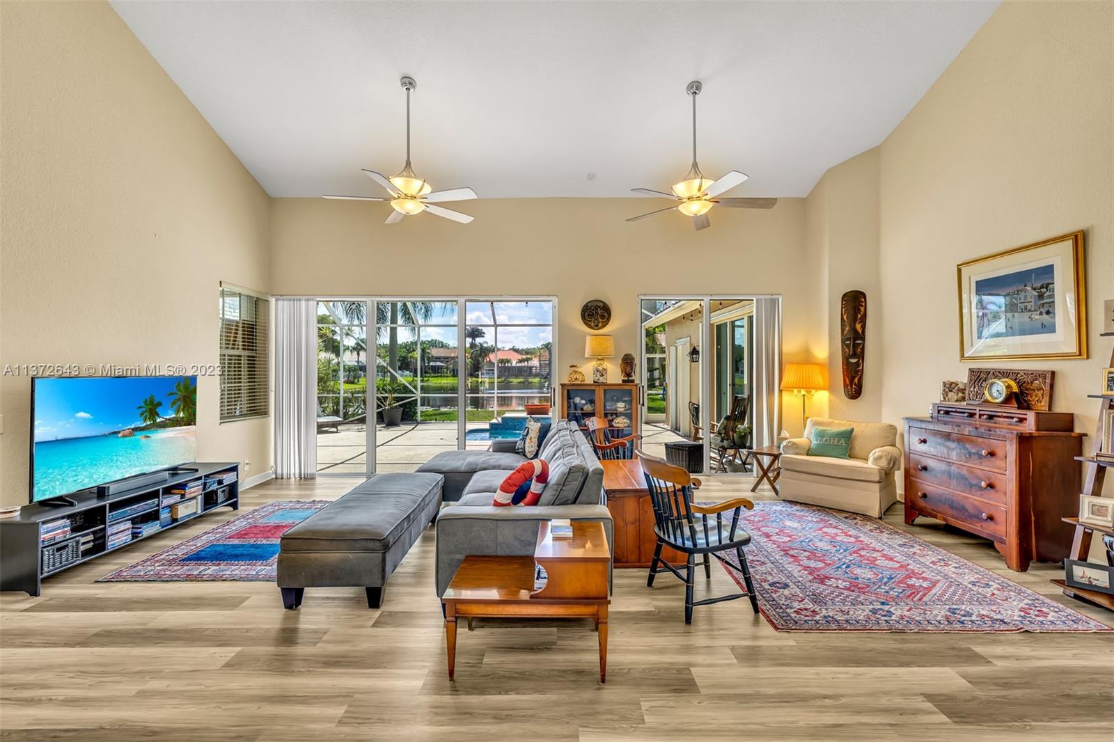 This distinctly cozy home welcomes you with a sizable & homey environment in a beautiful setting. Offering an excellent layout with high ceilings & wrap-around sliding patio doors in the lower level, incorporating light & the outdoors. New lower level flooring, formal dining with access to courtyard, comfortable kitchen w/ beautiful cabinetry, quartz counters & plenty of storage options. Primary suite w/ ample closet space. The large en-suite bathroom also serves as cabana bath. Upstairs features real hardwood flooring, 3 Br's + bath. Updated A/C & electric panel, garage door & accordion shutters. Relax in the privacy of your screened lanai & heated pool/spa w gorgeous views. Laguna Springs is a hidden gem of just 106 homes, ideally situated, steps from schools, parks & places of worship.