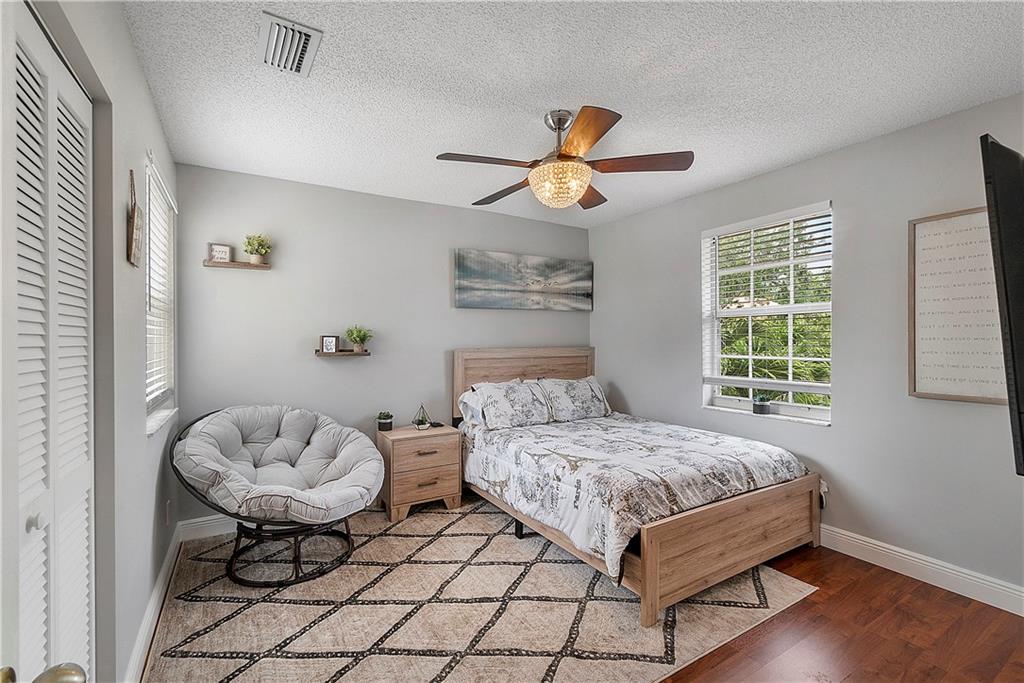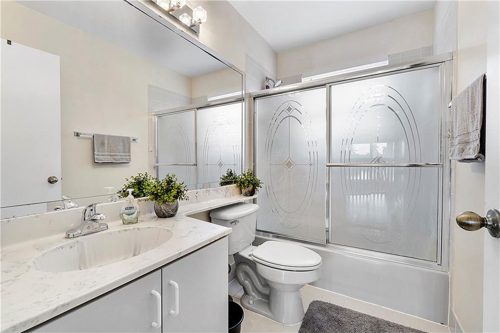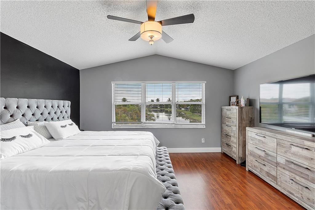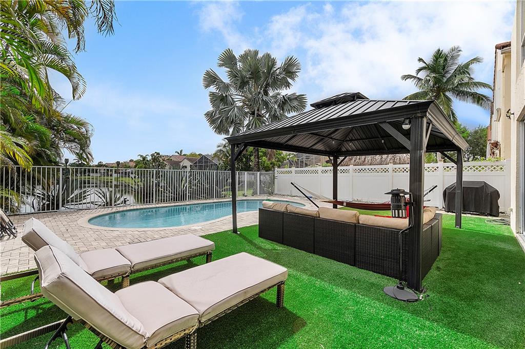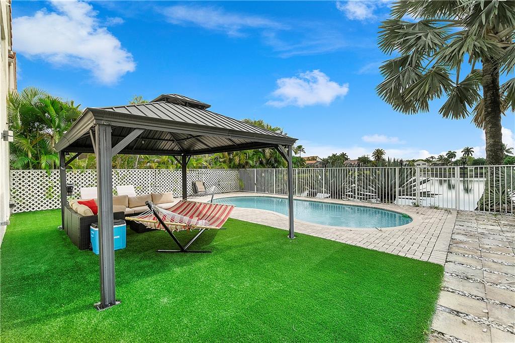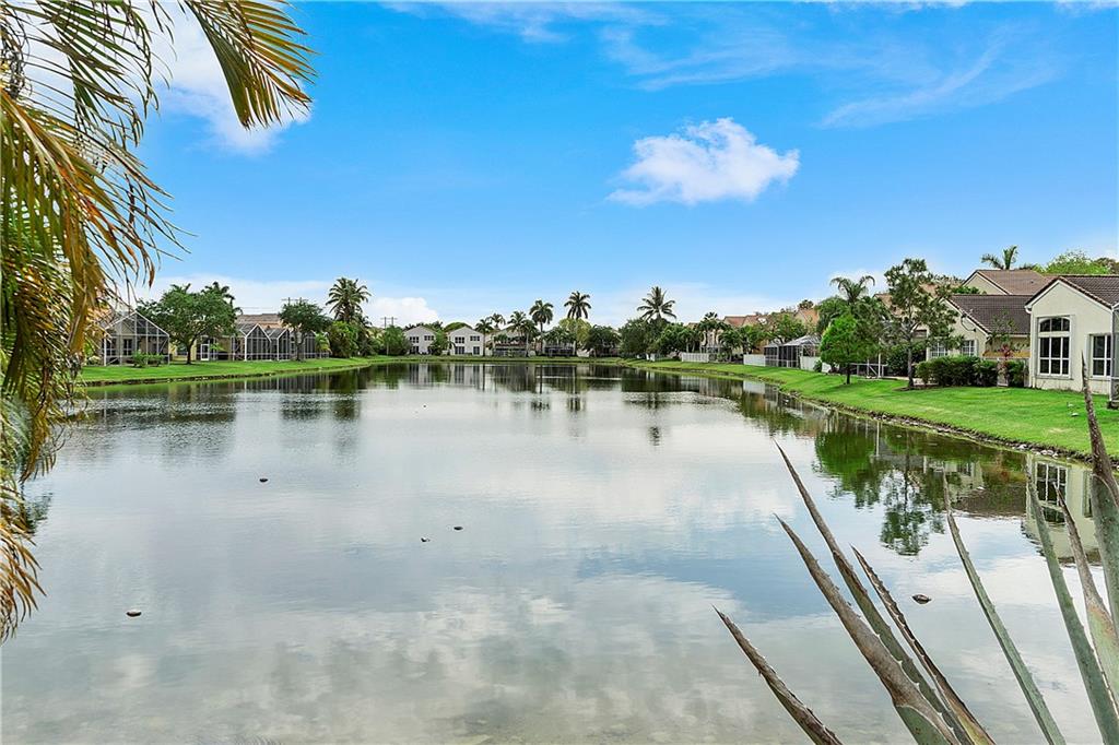 Gorgeous, renovated lakefront home with a tranquil full view of the water. Relax under your covered lounging area overlooking your private heated pool & lovely fenced backyard. Renovated contemporary with soaring ceilings and lots of light from the 2 story windows. Custom designed, smart kitchen with island, beverage bar, granite counters, and soft close cabinetry. White upper cabinets and stylish, navy blue lower cabinets with hidden drawers. Stainless steel appliances. 1st floor Den or 4th BR has french doors. Floating vanity in lower level bath. 3 nice sized bedrooms and 2 full baths, upstairs. Freshly painted. No carpet. Utility room, 1 car garage, and great closet space. Immaculate condition. You will love Kensington South neighborhood with gated entrance and community pool.