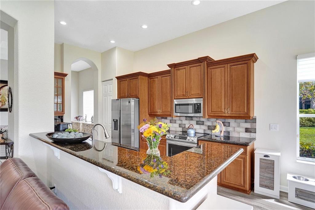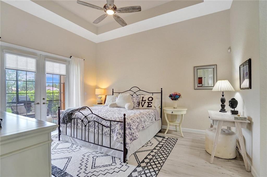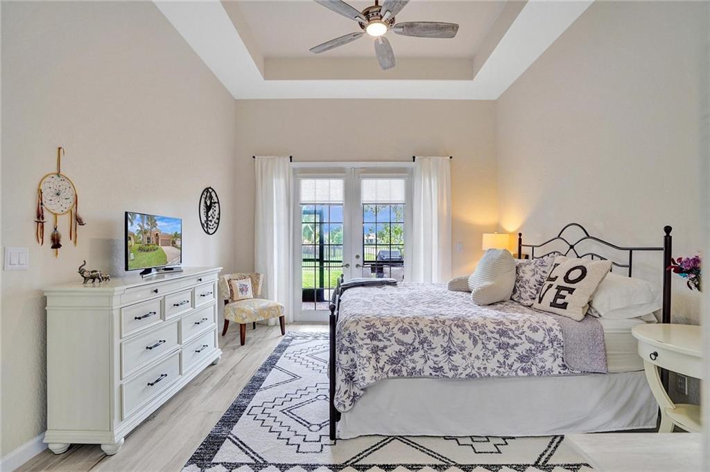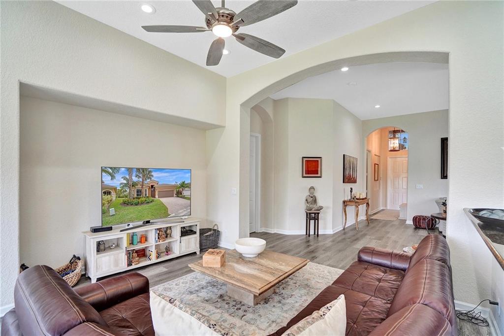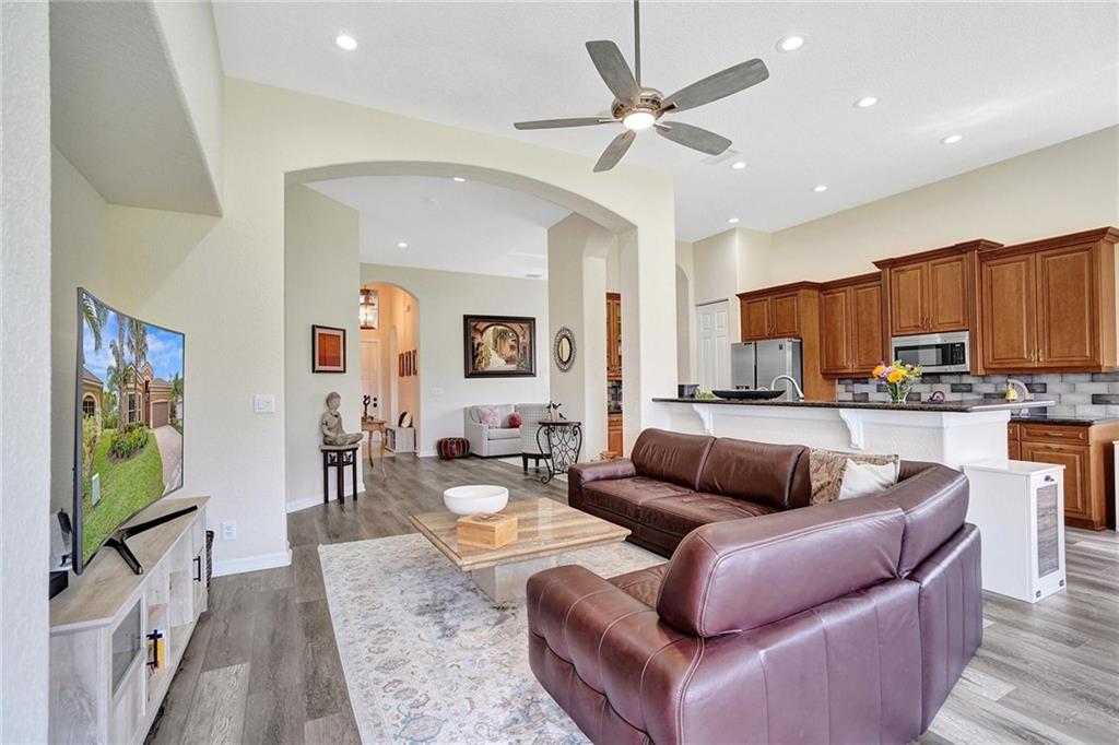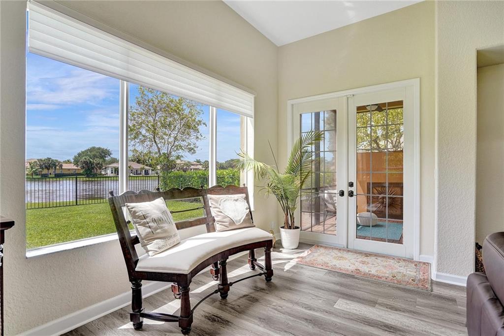 Expansive, updated 3 Bedroom waterfront home on oversized Cul du Sac, fenced lot. Contemporary, open plan w foyer entry, volume ceilings & lake views. Featuring wide plank wood laminate flooring throughout the main areas, wood plank porcelain tile floors in the bedrooms & baths. Spacious living areas, huge kitchen w island, rich wood cabinetry, under counter lighting accents, granite counters, new stainless appliances & plumbing fixtures. Big Master Suite, walk-in closet & stylish updated bathroom w separate tub & large shower. Good sized Bedrooms 2 & 3 w adjacent bath. Lakeside screened patio w fenced yard and privacy hedges. Close by resort caliber pool, clubhouse, gym, party rooms, tennis & pickleball. HOA includes lawn care. Special financing incentives available w Sirva Mortgage.
