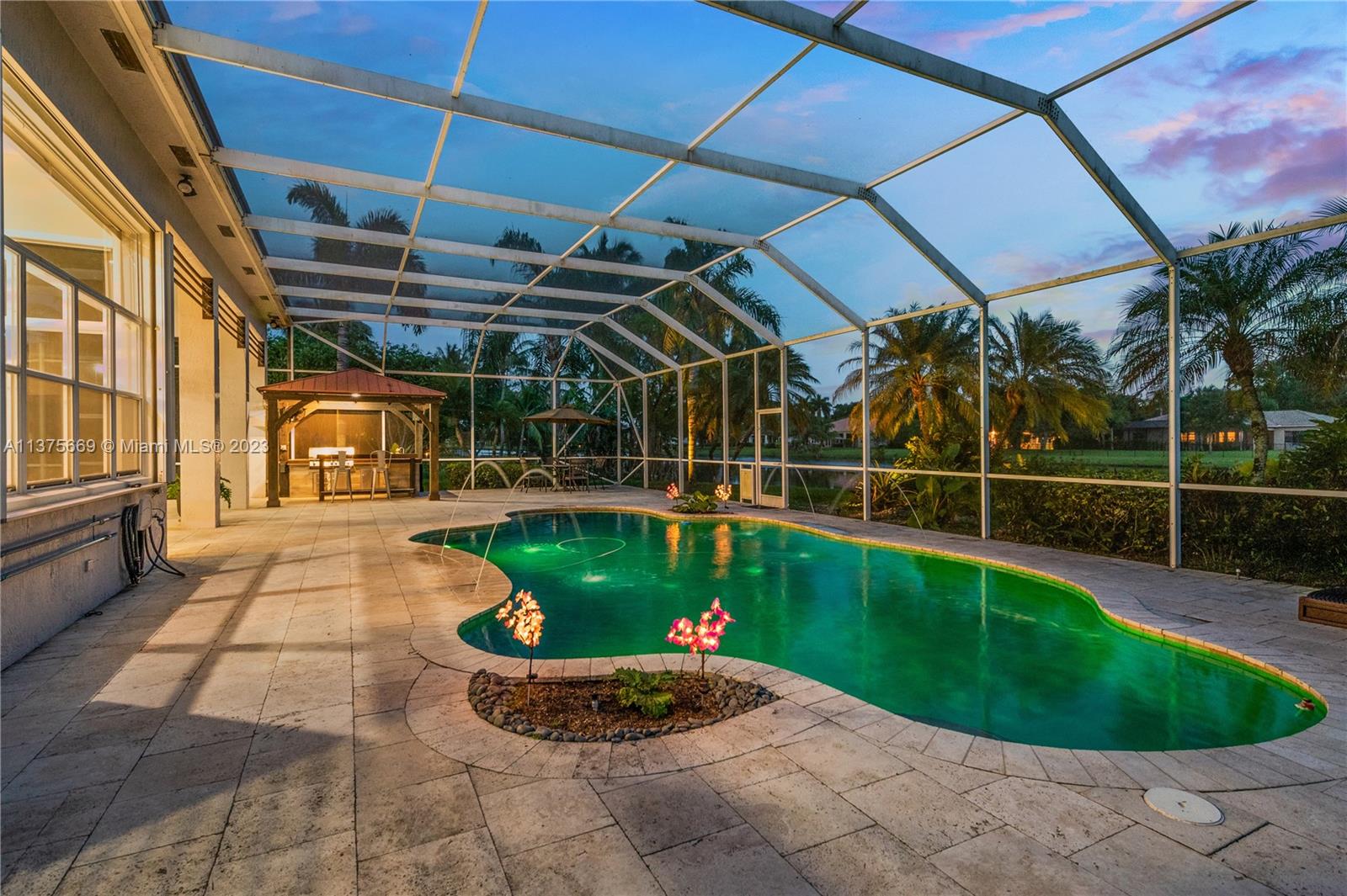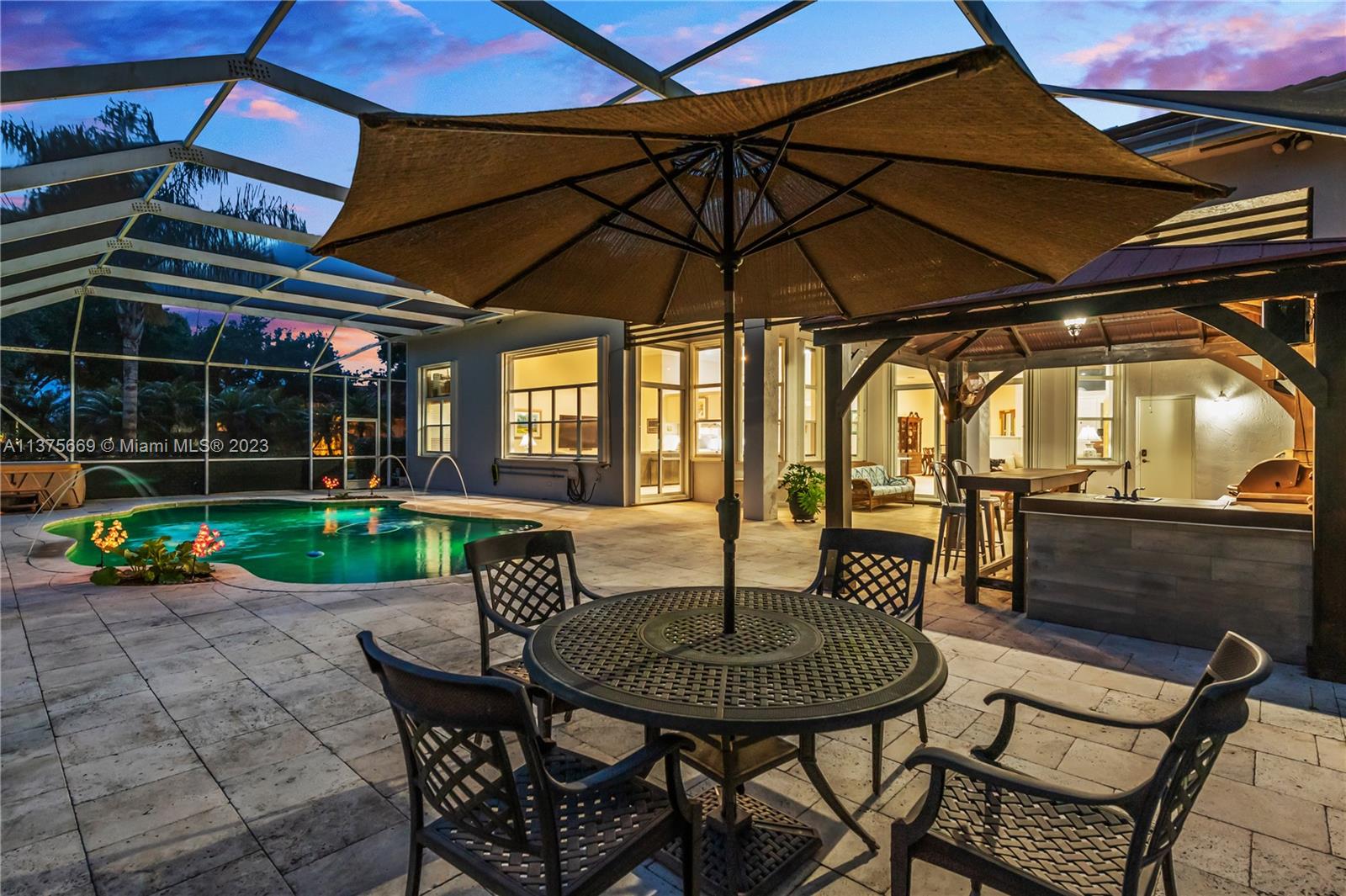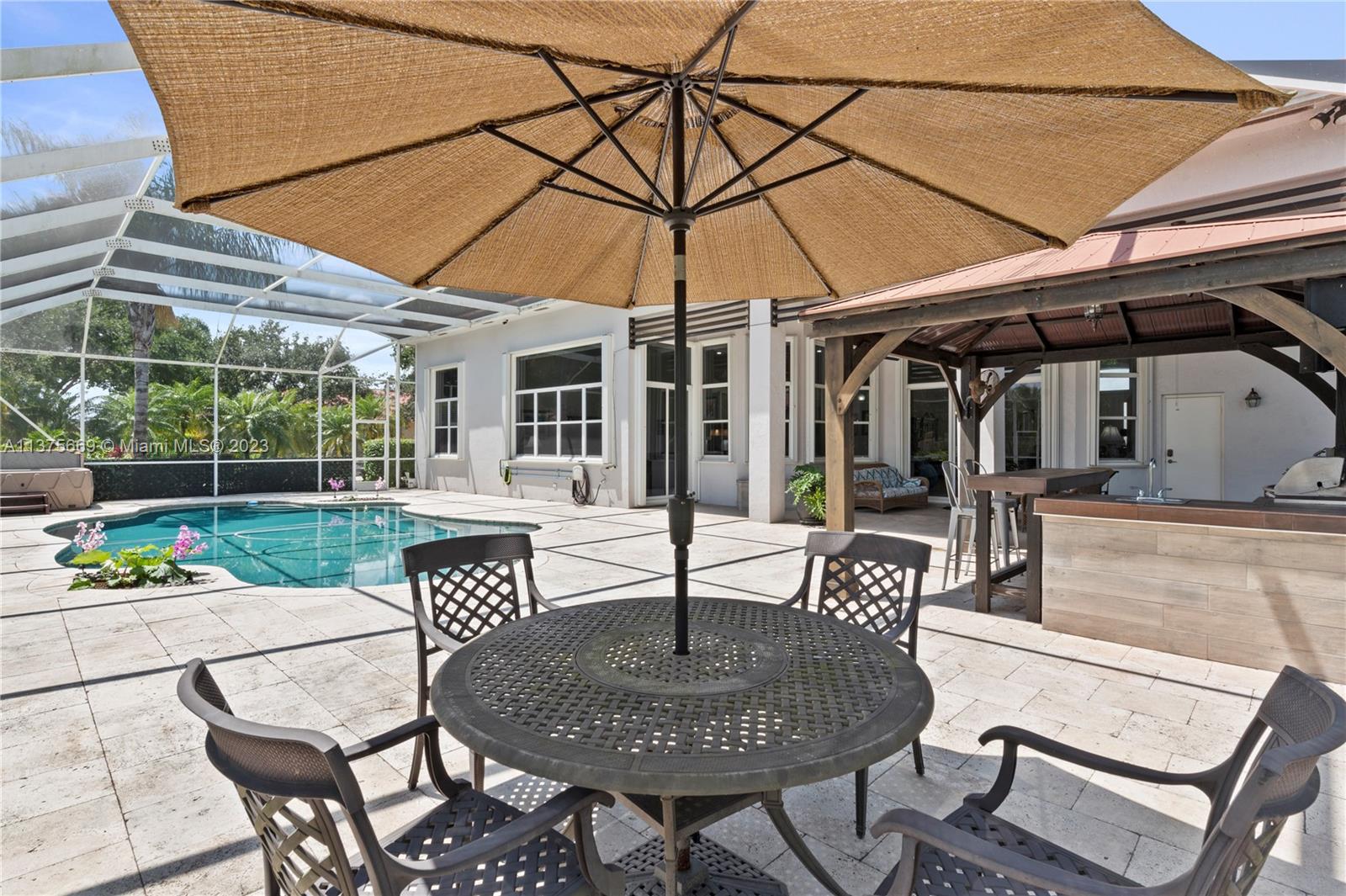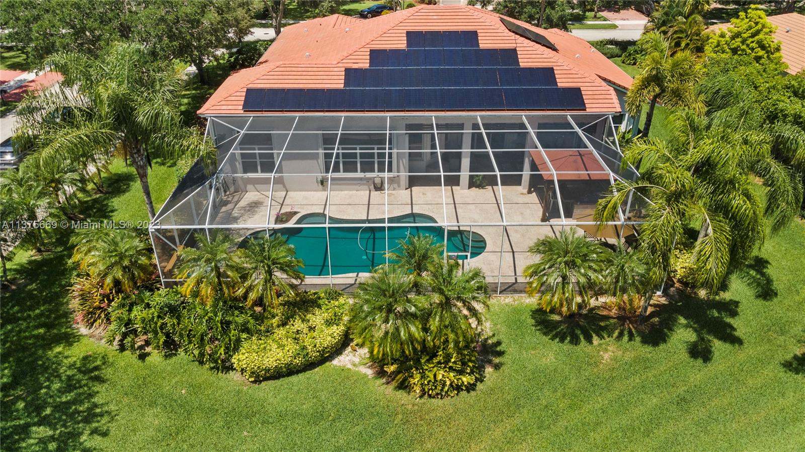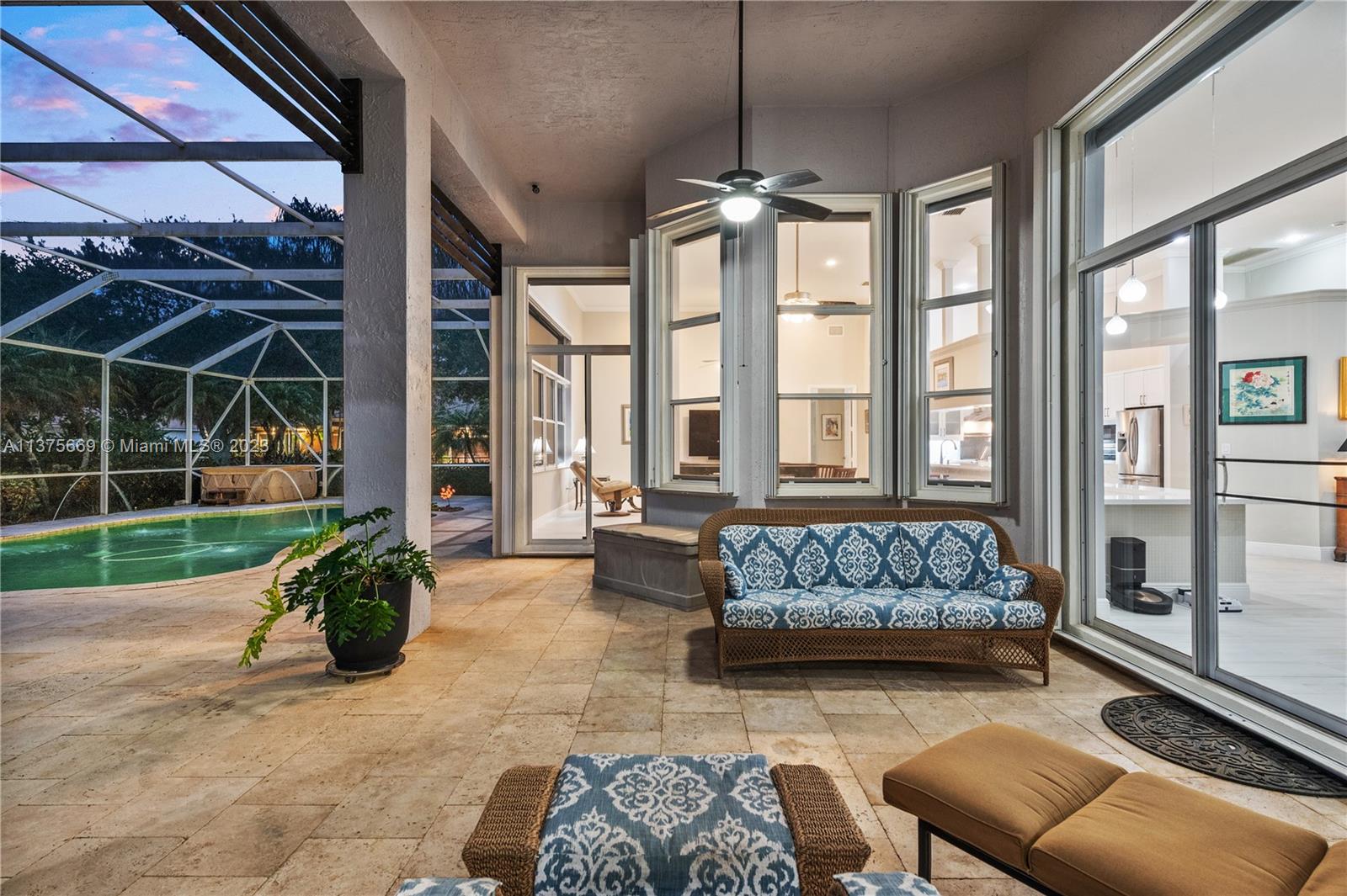 This is the one you have been waiting for. Beautifully renovated and ready for you. Triple split floorplan w/5 bedrooms plus a Den/Office & family room. Open white kitchen featuring Carrera style waterfall quartz counters, prep island, gas range, wall oven & microwave & pantry w/coffee bar. Entertain at your wet bar w/wine chiller or enjoy the (heated) pool, hot tub & summer kitchen w/built in grill. Oversized fenced corner lot w/serene lake view. Spacious relaxing primary bedroom w/2 walk in custom closets & a stunning spa-like bathroom. 5th bedroom has a loft. Roof in 2021, 3 zone A/C units in 2021, New ceiling insulation. Be Storm ready w/accordion shutters & automatic Generac (2021) w/in-ground 500 gal propane tank. Energy savings w/solar panel, average FPL bill is $32. So much more...