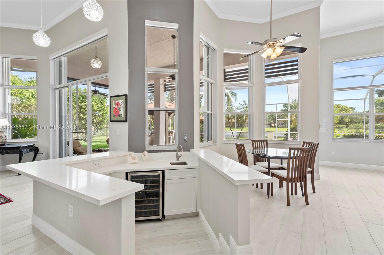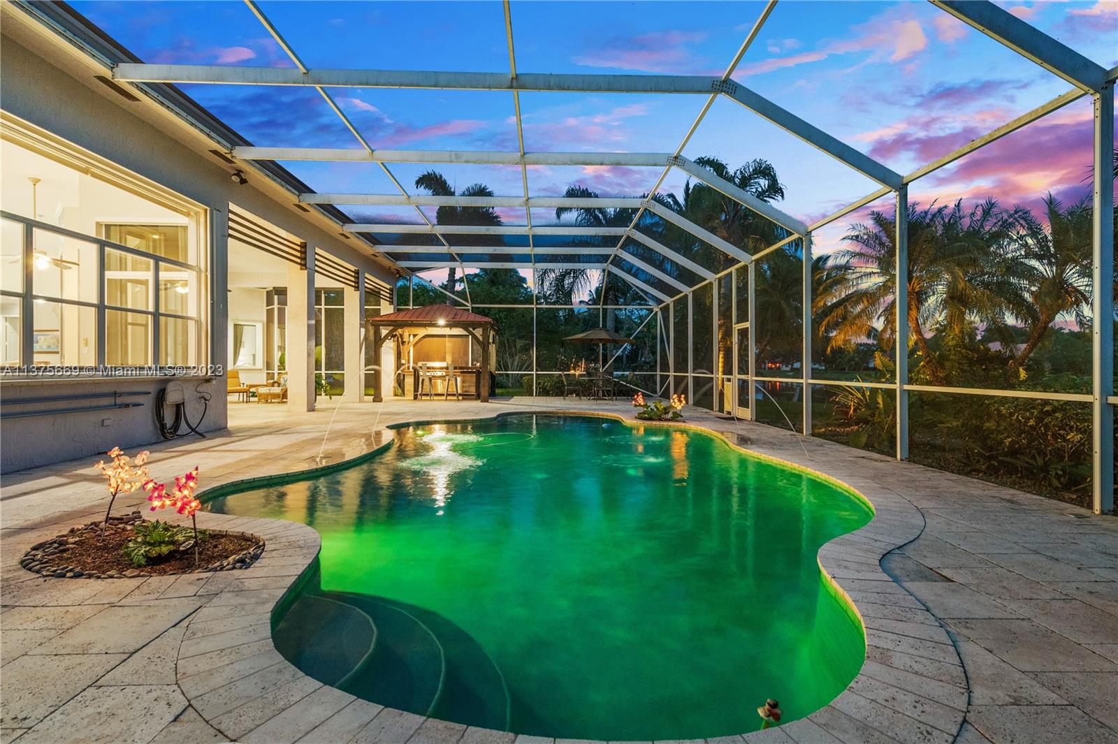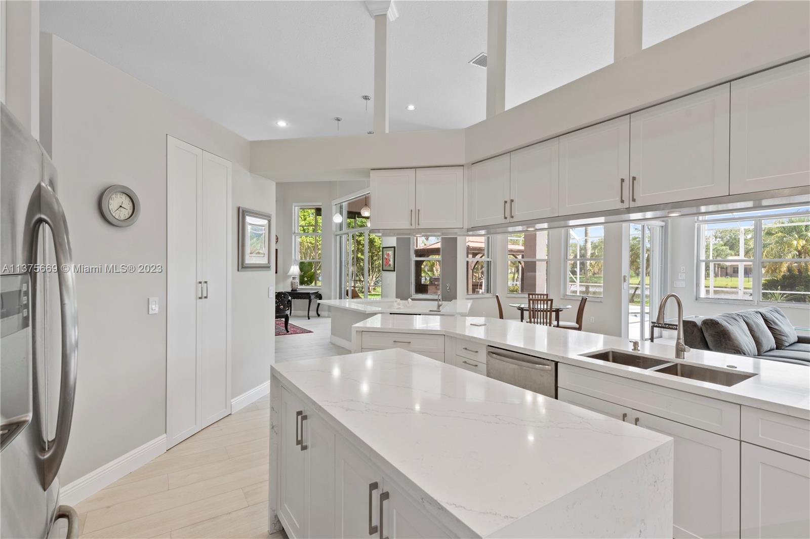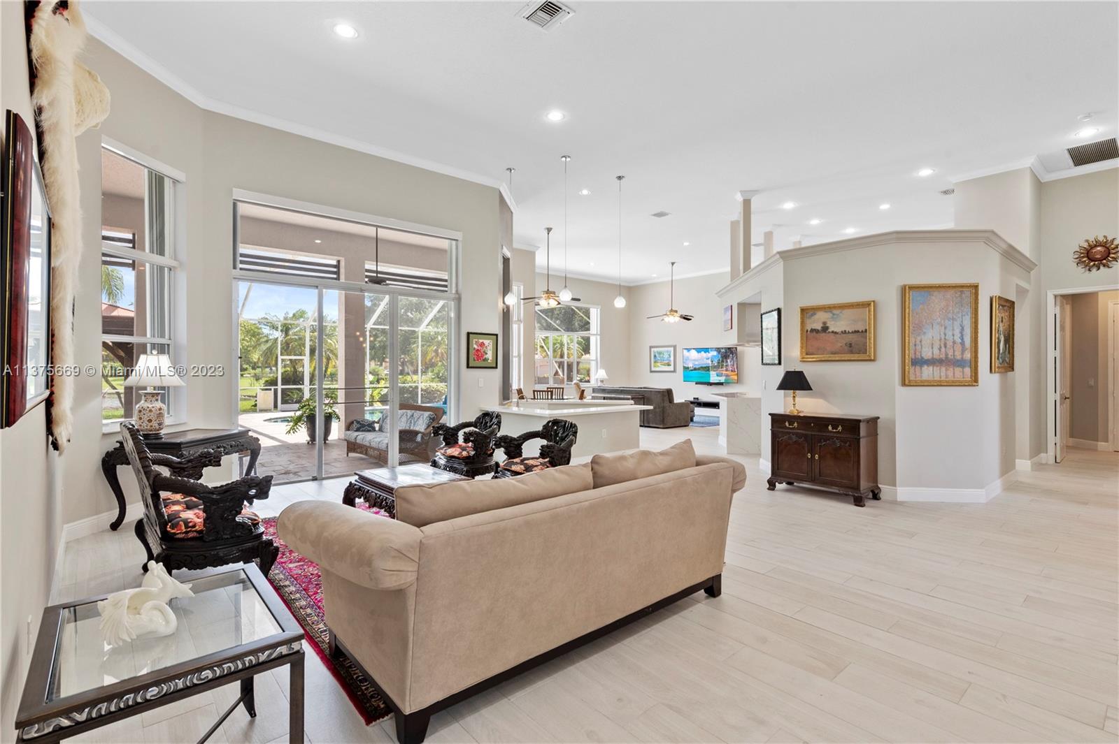 This is the one you have been waiting for. Beautifully renovated and ready for you. Triple split floorplan w/5 bedrooms plus a Den/Office & family room. Open white kitchen featuring Carrera style waterfall quartz counters, prep island, gas range, wall oven & microwave & pantry w/coffee bar. Entertain at your wet bar w/wine chiller or enjoy the (heated) pool, hot tub & summer kitchen w/built in grill. Oversized fenced corner lot w/serene lake view. Spacious relaxing primary bedroom w/2 walk in custom closets & a stunning spa-like bathroom. 5th bedroom has a loft. Roof in 2021, 3 zone A/C units in 2021, New ceiling insulation. Be Storm ready w/accordion shutters & automatic Generac (2021) w/in-ground 500 gal propane tank. Energy savings w/solar panel, average FPL bill is $32. So much more...