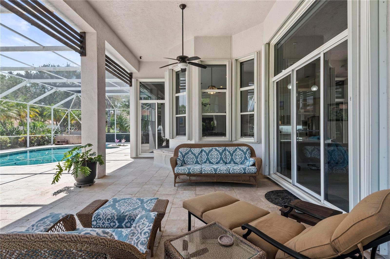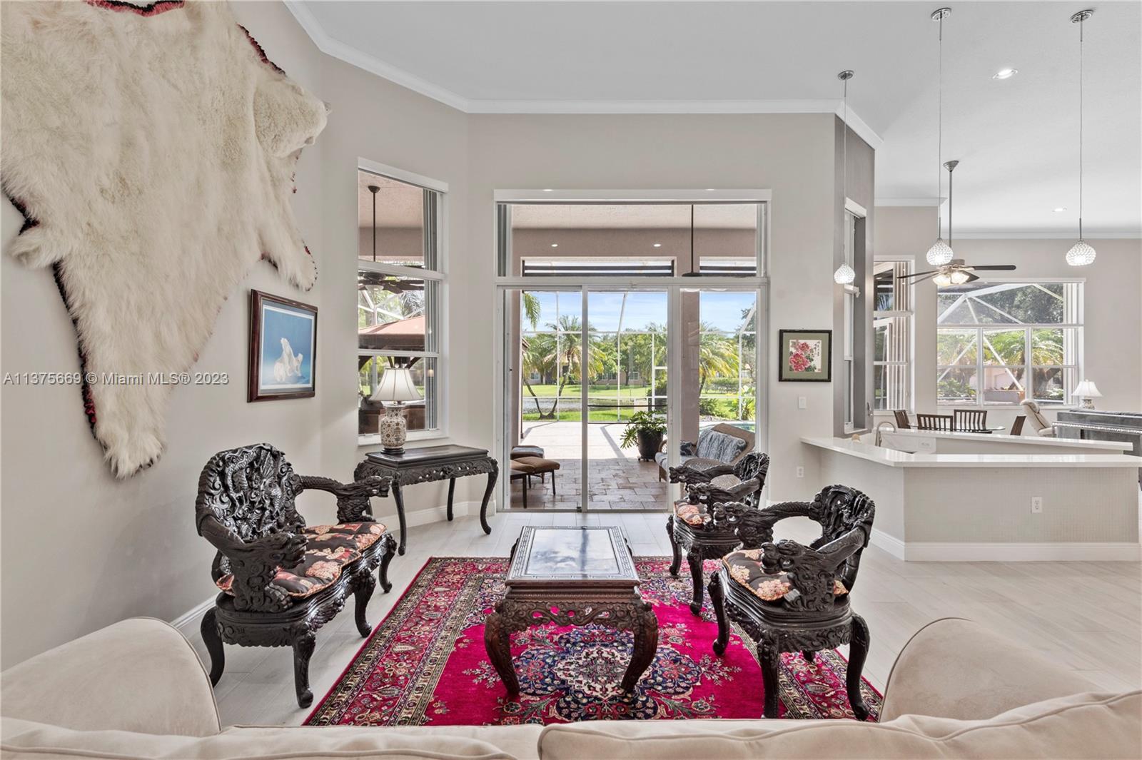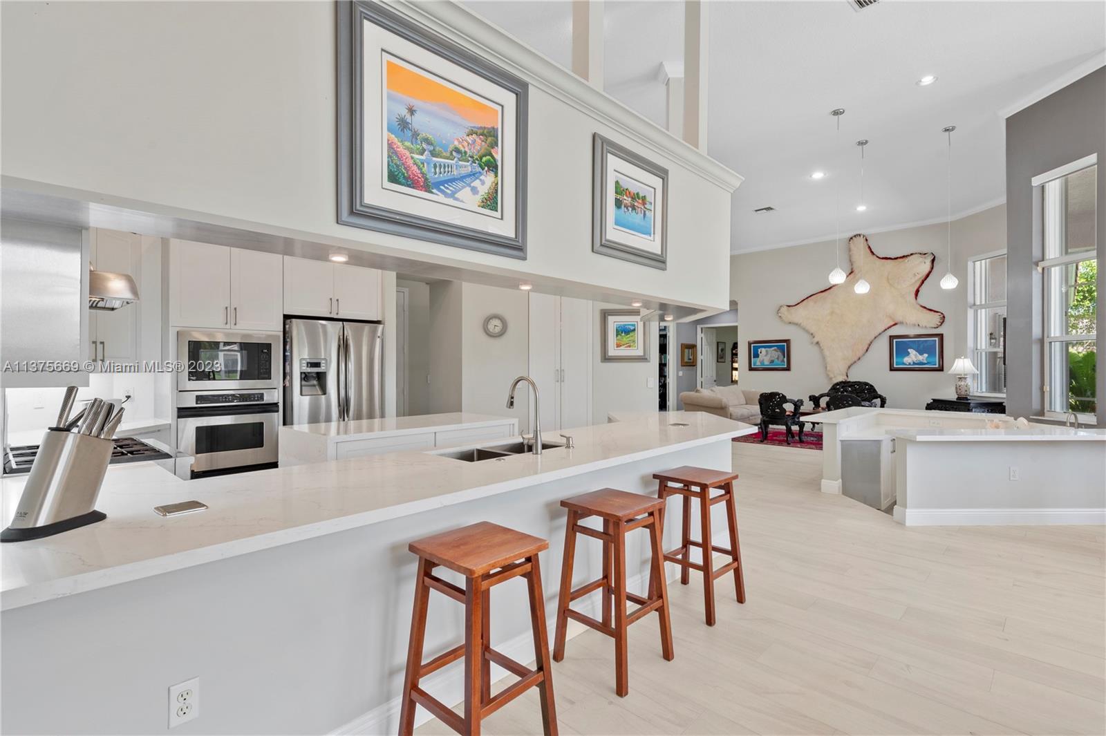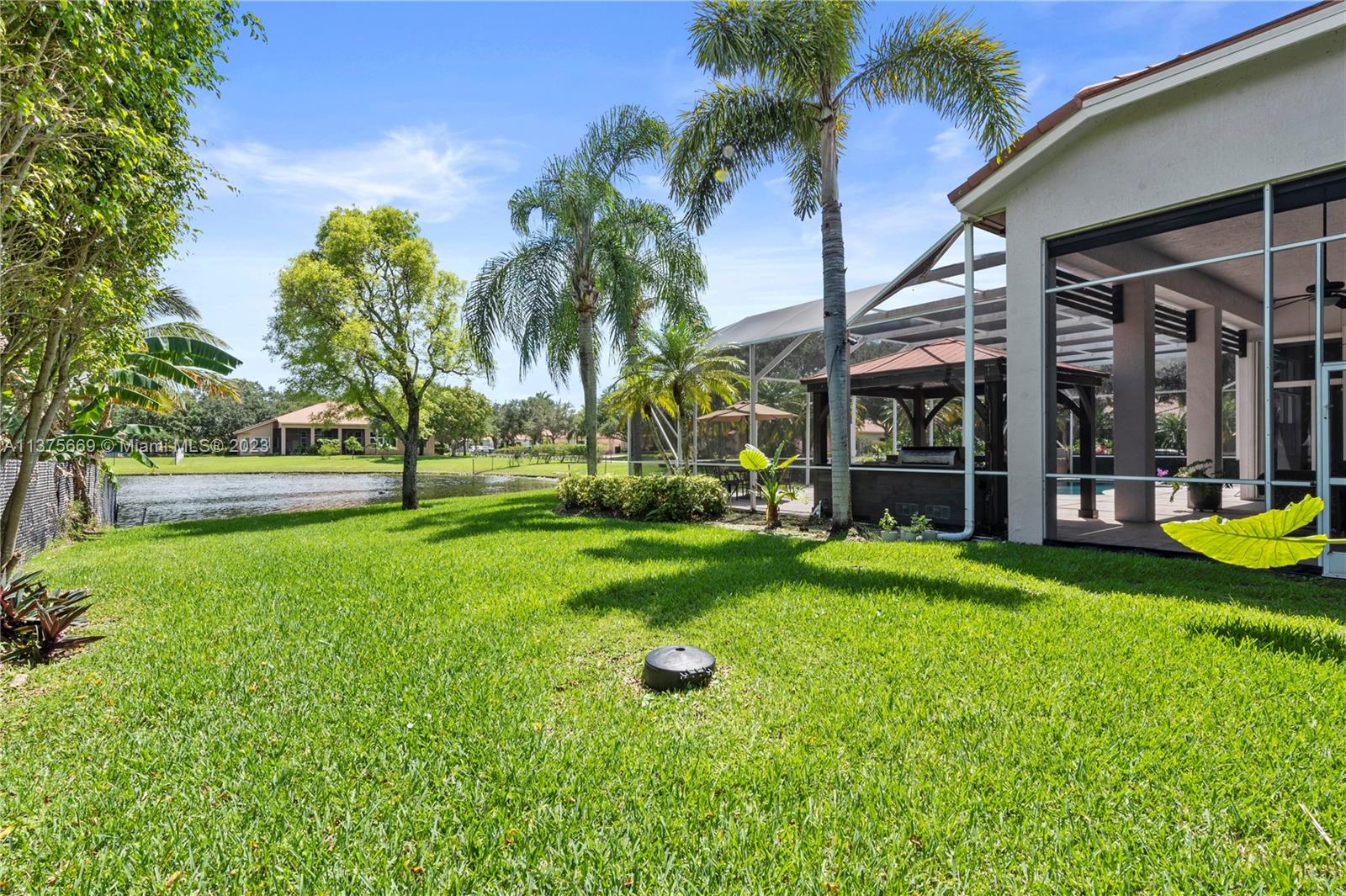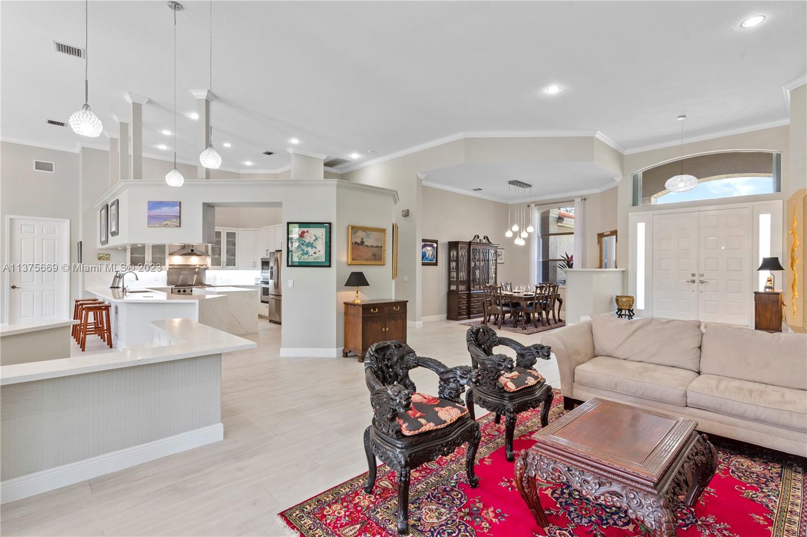 This is the one you have been waiting for. Beautifully renovated and ready for you. Triple split floorplan w/5 bedrooms plus a Den/Office & family room. Open white kitchen featuring Carrera style waterfall quartz counters, prep island, gas range, wall oven & microwave & pantry w/coffee bar. Entertain at your wet bar w/wine chiller or enjoy the (heated) pool, hot tub & summer kitchen w/built in grill. Oversized fenced corner lot w/serene lake view. Spacious relaxing primary bedroom w/2 walk in custom closets & a stunning spa-like bathroom. 5th bedroom has a loft. Roof in 2021, 3 zone A/C units in 2021, New ceiling insulation. Be Storm ready w/accordion shutters & automatic Generac (2021) w/in-ground 500 gal propane tank. Energy savings w/solar panel, average FPL bill is $32. So much more...