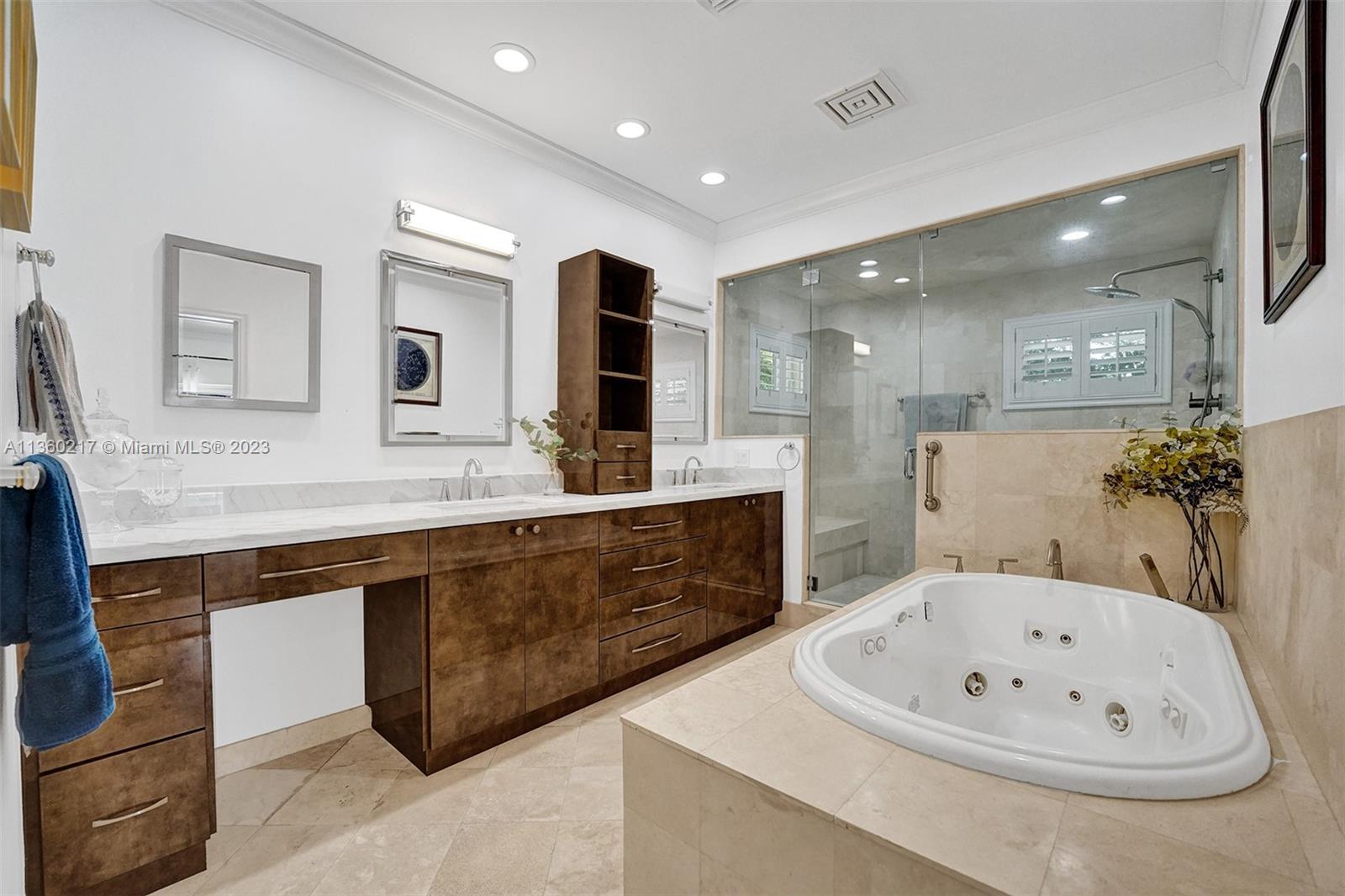 A pristinely located estate w/large private paradise wraps entire property. Interior boasts refinished white oak wood floors and recessed lighting throughout. Chef’s kitchen w/slow-close Italian cabinets, quartzite counters, JennAir appliances + bar. Family room w/travertine marble gas fireplace! Master bed w/pool access, walk-in + en suite w/steam shower + expansive vanity. 2 large guest bedrooms, 4th bed is office! Massive bonus playroom/den w/volume ceiling. 2 new HVACs, new electric panel (’21), whole-house generator and H2O filtration system. Tropical landscaping, heated saltwater pool, covered patio, cabana, putting green and expansive artificial turf, Impact windows & doors. Walk to Ocean, Publix, Galleria Mall, Capital Grille, Starbucks, George English Park and Birch State Park.