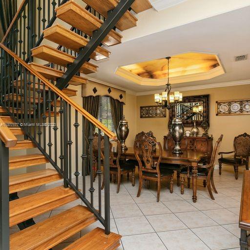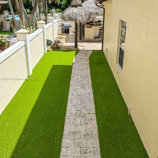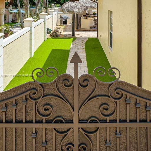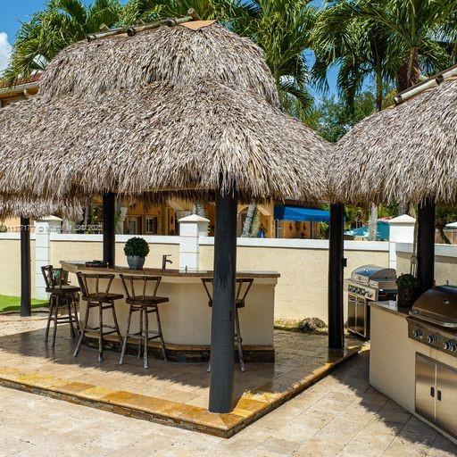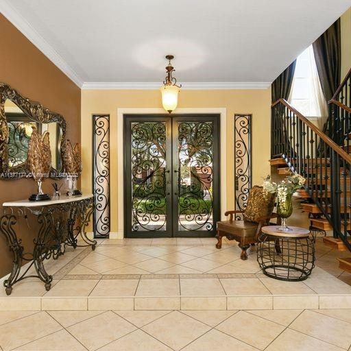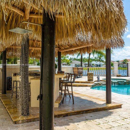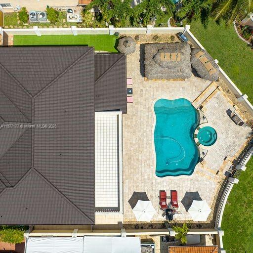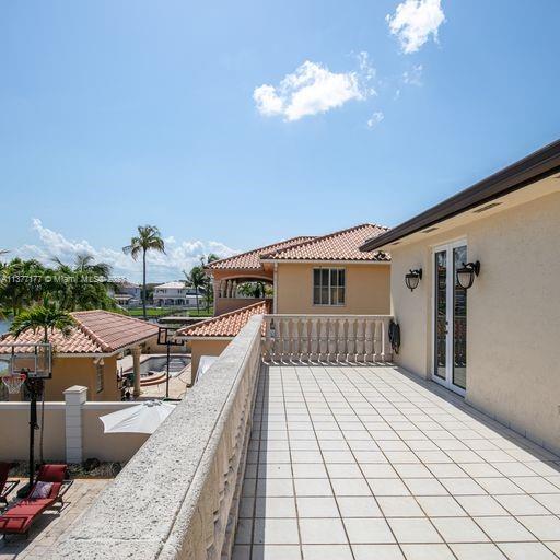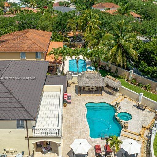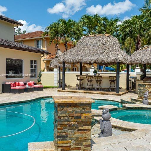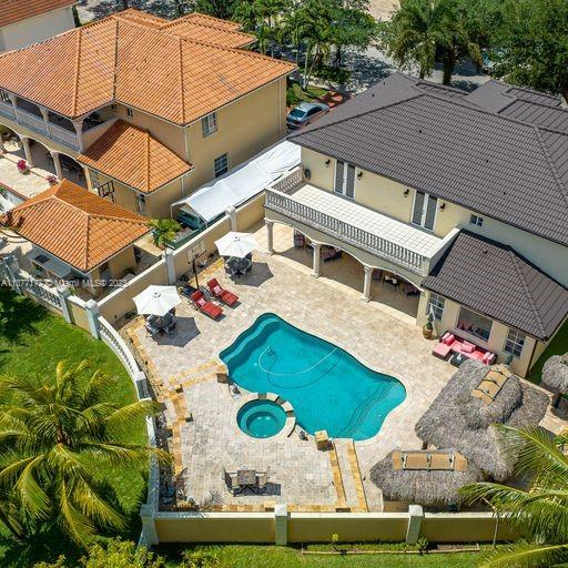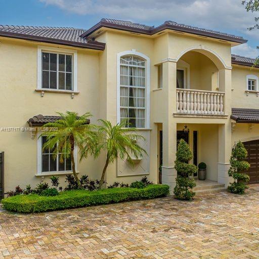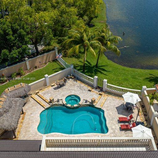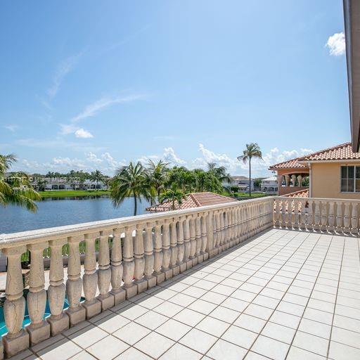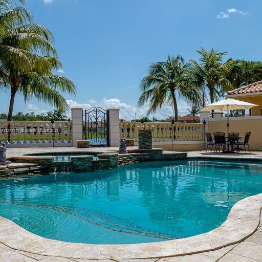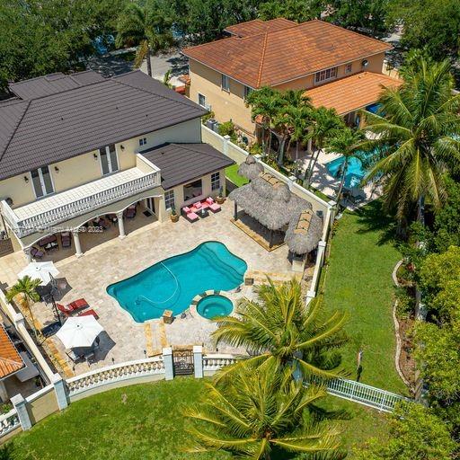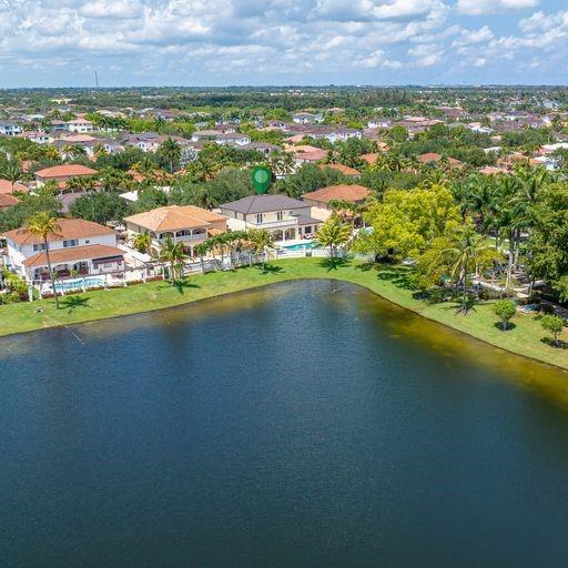 Lakefront mediterranean home with elegant iron stairwell which leads upto the large masterbedroom with balcony overlooking the waterviews . This home has 4 bedrooms plus a loft which can be converted into a 5th bedroom and 3 bathrooms. Gourmet kitchen opens to the family room and breakfast nook, beautiful living room and formal dining room, many windows illuminating the home with natural light and frech doors which open to the pool patio with 2 chickee huts with an outdoor kitchen and lage pool with jacuzzi by the serene lake.